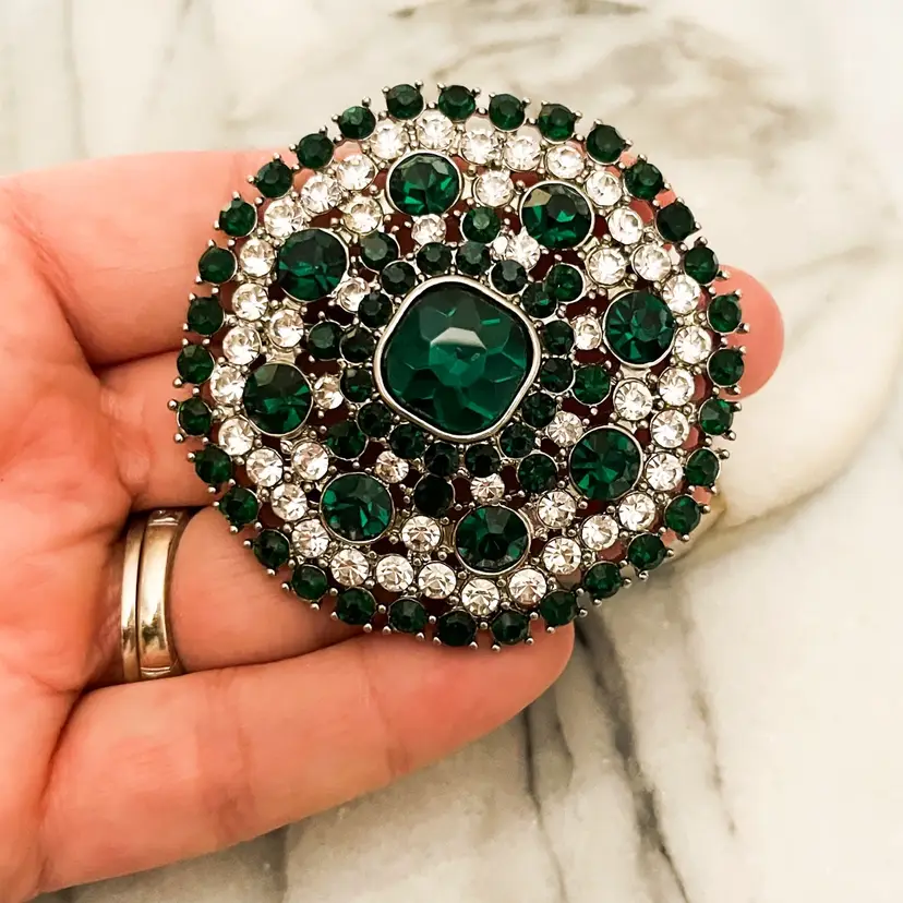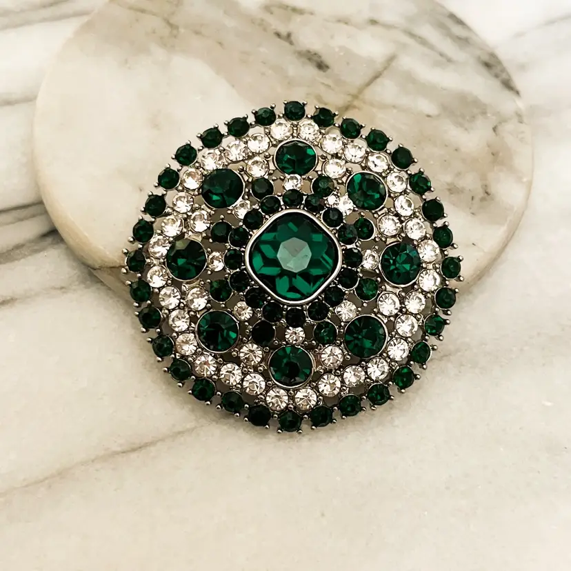 Vintage Monet Crystal Brooch Colors: Green Clear Rhinestone, Silver Toned Metal Signed