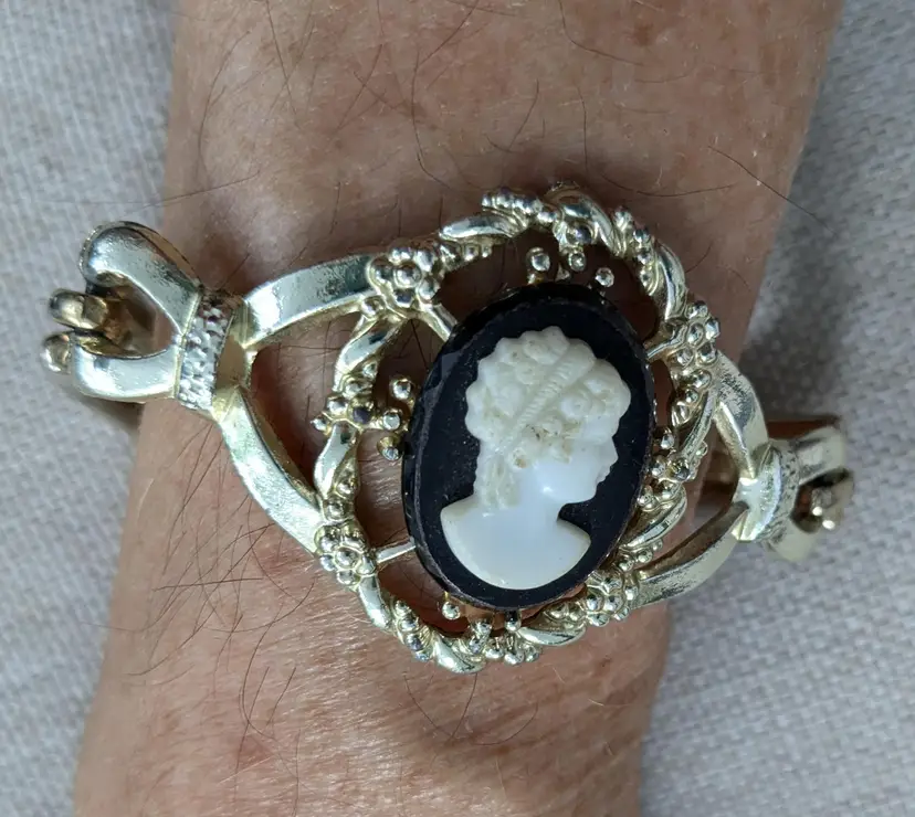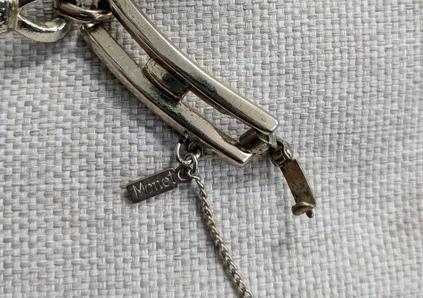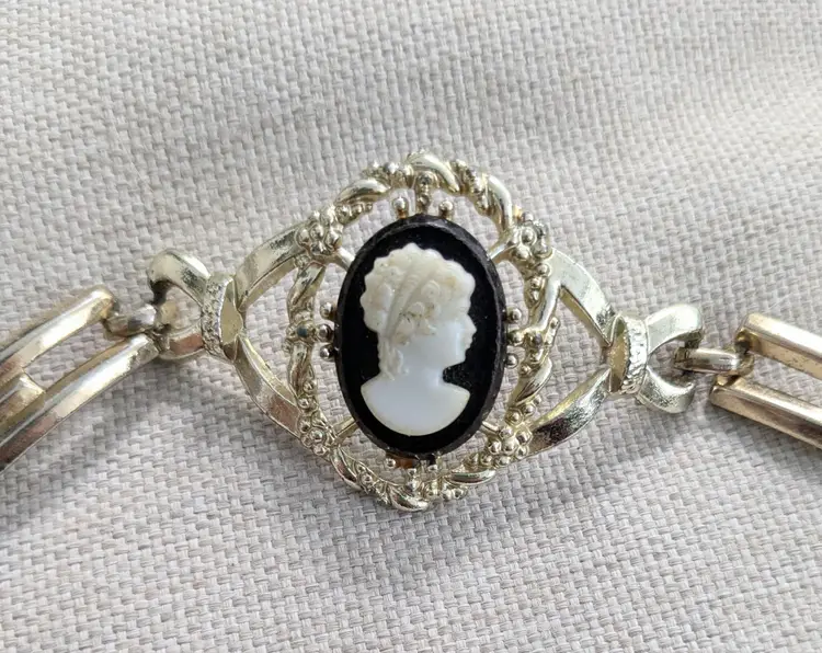 7" in length. The cameo is a molded plastic. Safety chain. Marked Monet