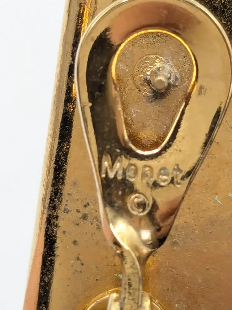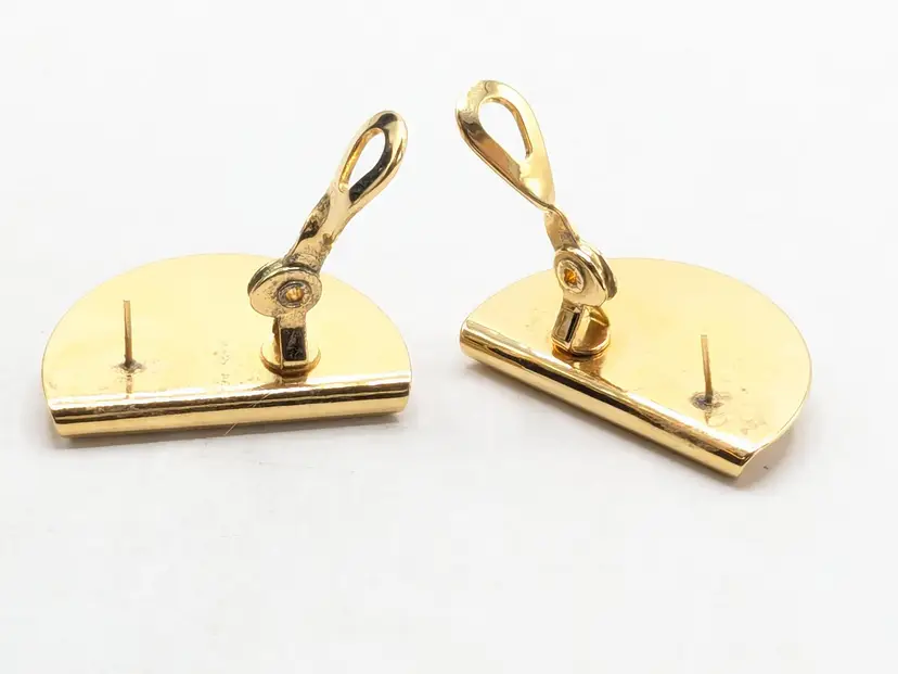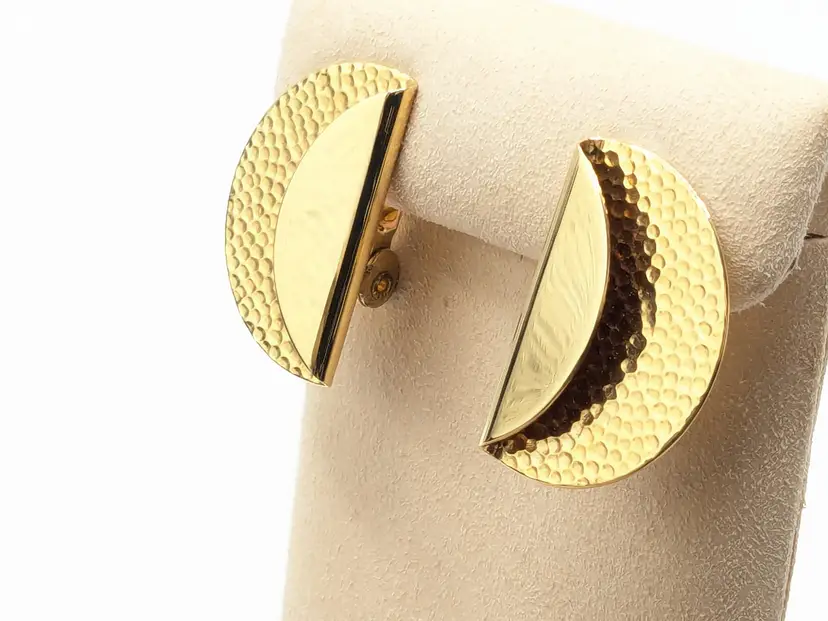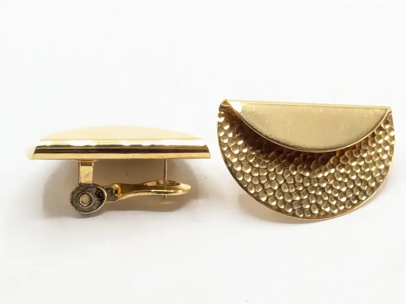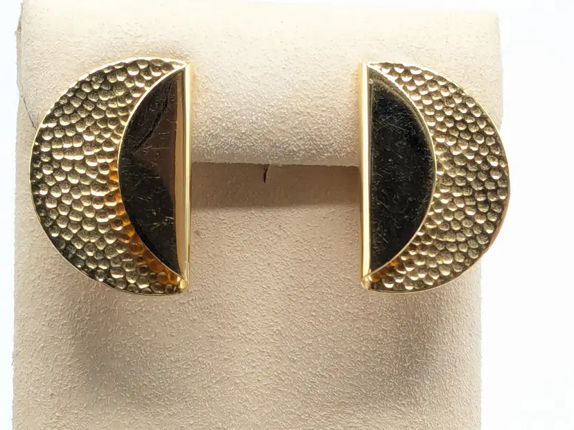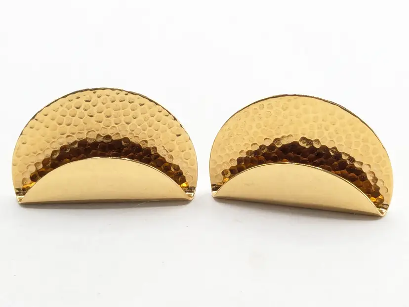 Good condition. Gold tone is bright and shiny with no color loss. Features a unique hammered texture in a stylish half-moon design. Signed Monet. Pierced earrings. Light weight. Measures 3/4" x 1". wen