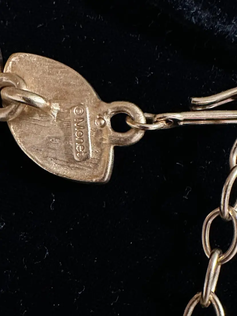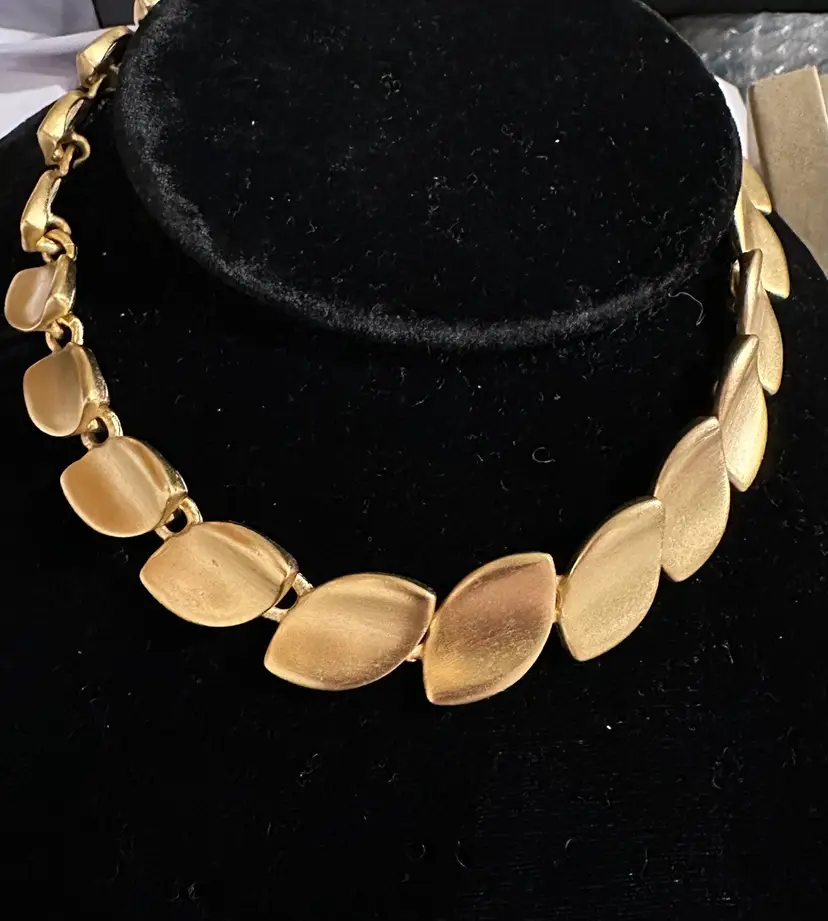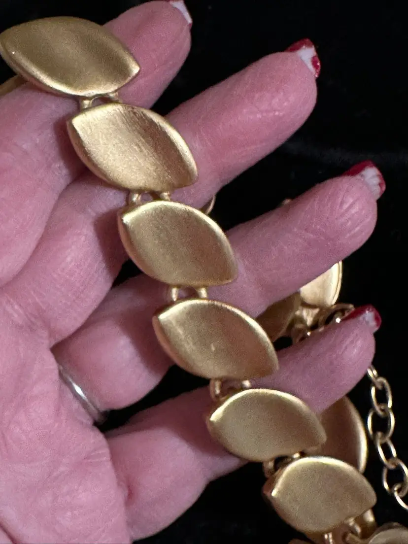Lovely 1980’s vintage Monet necklace. It is a matte brush gold finish leaf link. It measures 15” + 3.5” extension. It is in excellent condition.