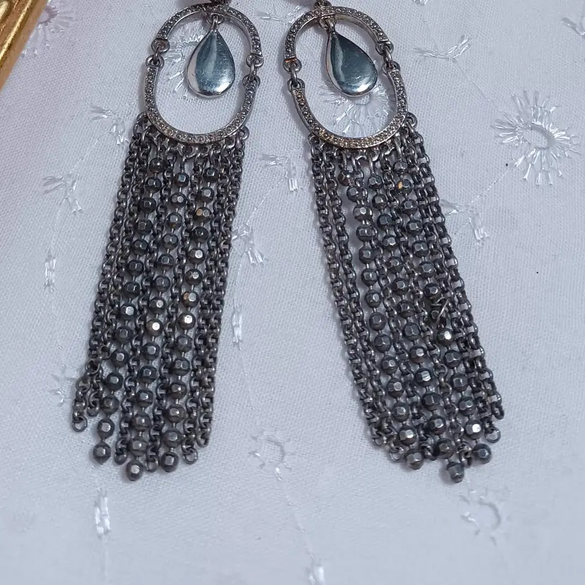 Add a touch of drama to your look with these vintage silver dangle stud earrings. Featuring elegant fringe chains and teardrop accents, they're perfect for a night out or a special occasion. Hangs at 2 1/4" Tested as silver*