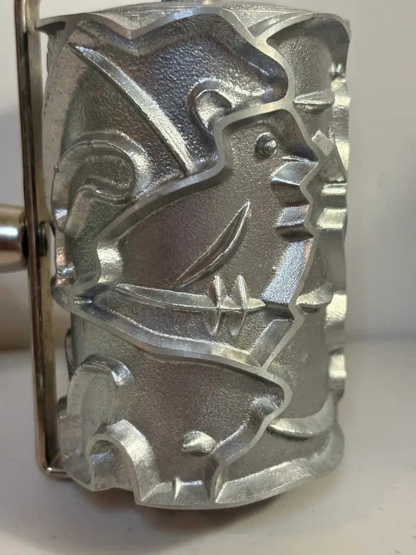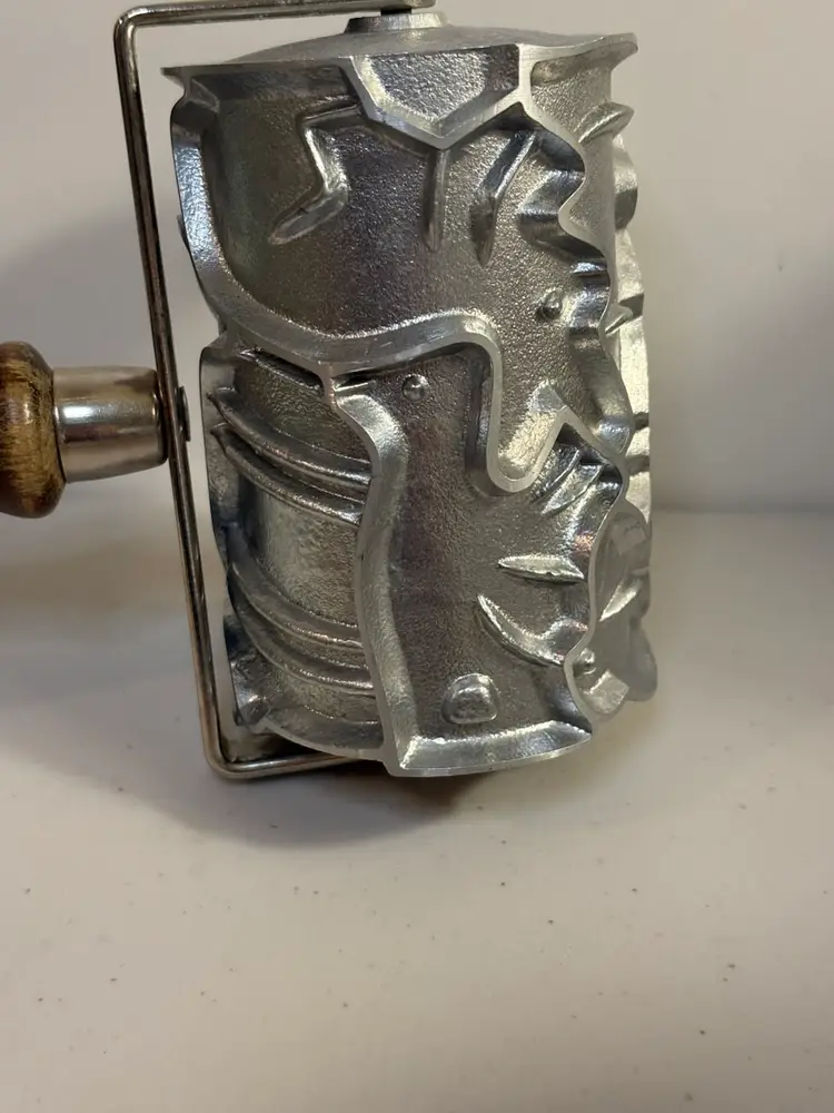 The Vintage Monopol Germany Baking Roller Cookie Cutter is a medium-sized cookie cutter featuring a Christmas pattern. Made of wood and metal, this single cookie cutter from the Monopol brand is a unique and collectible piece perfect for adding a festive touch to your holiday baking. Its German origin adds a touch of nostalgia to your kitchen, making it a charming addition to any baking enthusiast's collection.