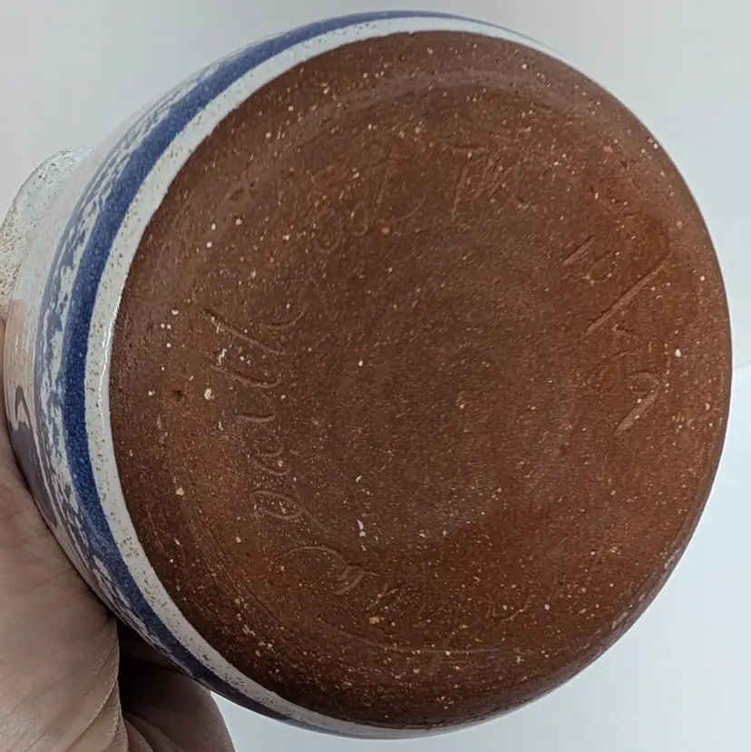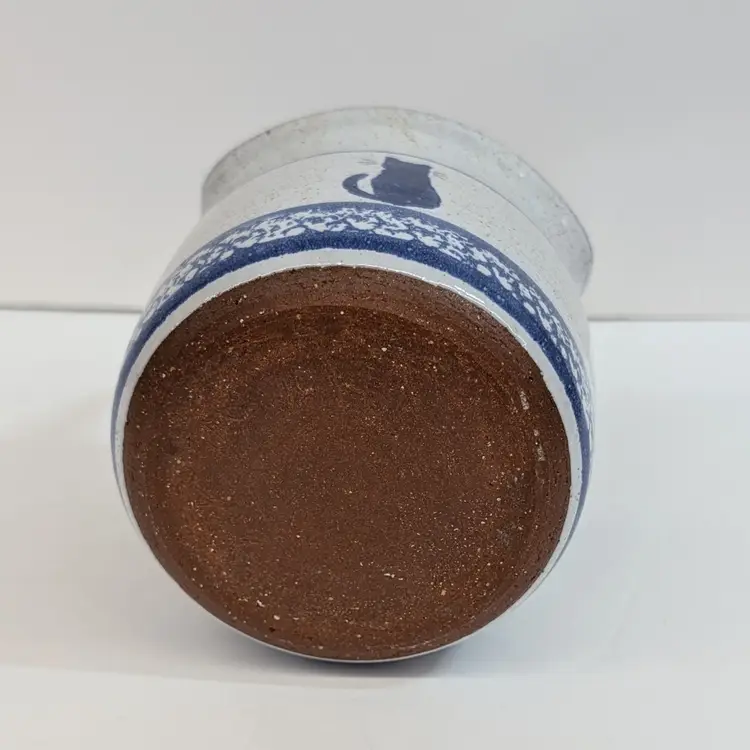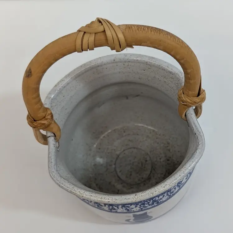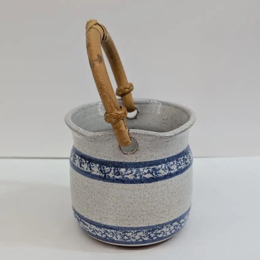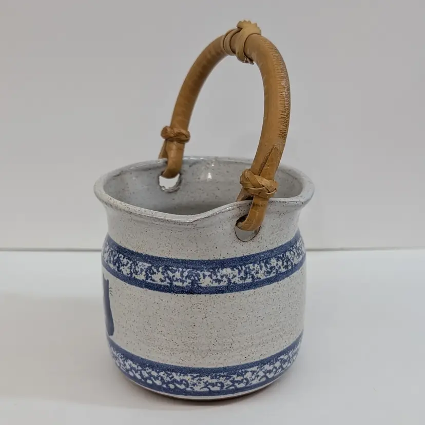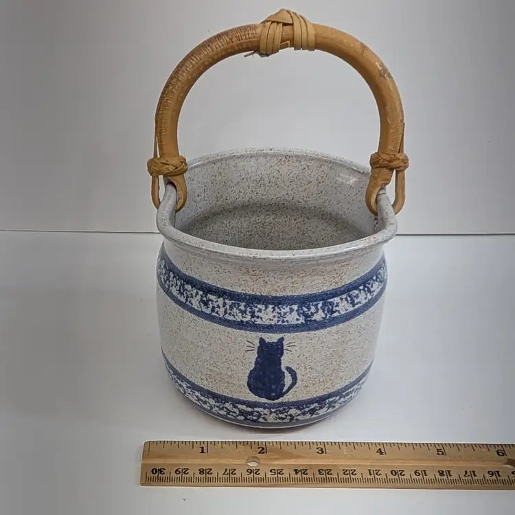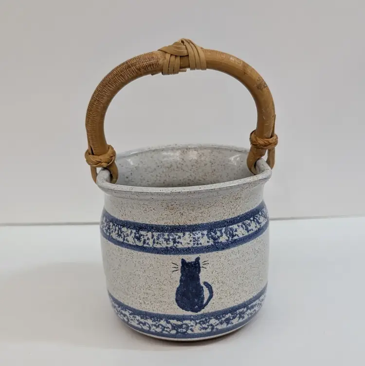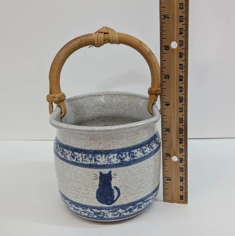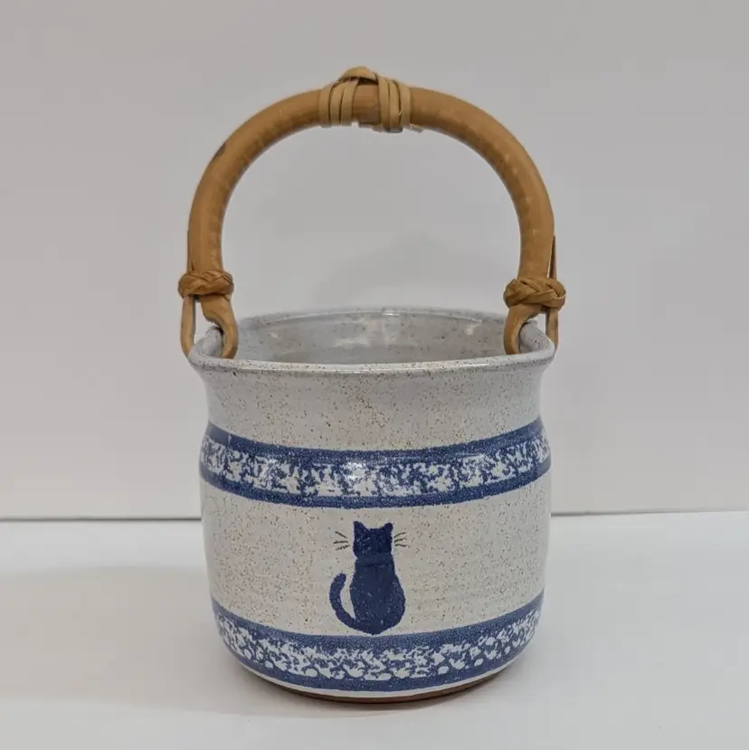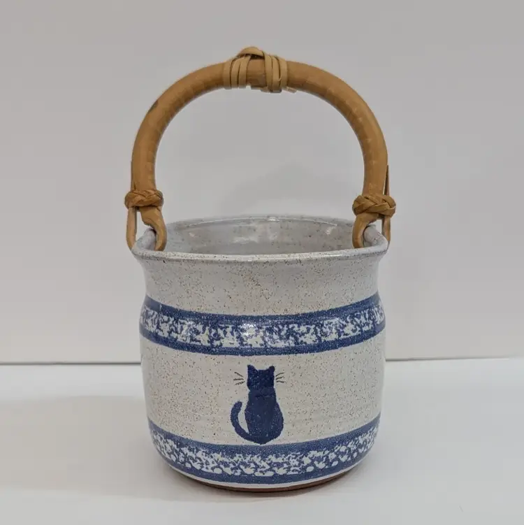 Speckled cream and blue glaze with a cat and sponge wear design are on this pottery basket with a bamboo handle. It is great for decor or a plant. Signed what looks to say "Montana Earth Pot TM 10/89." In nice, used condition with a little wear on the handle. Measurements ~ 4 x 6.75" with handle up.