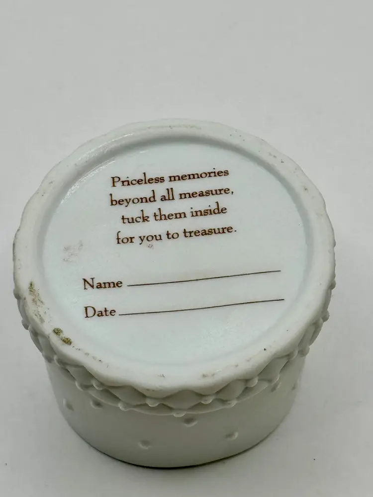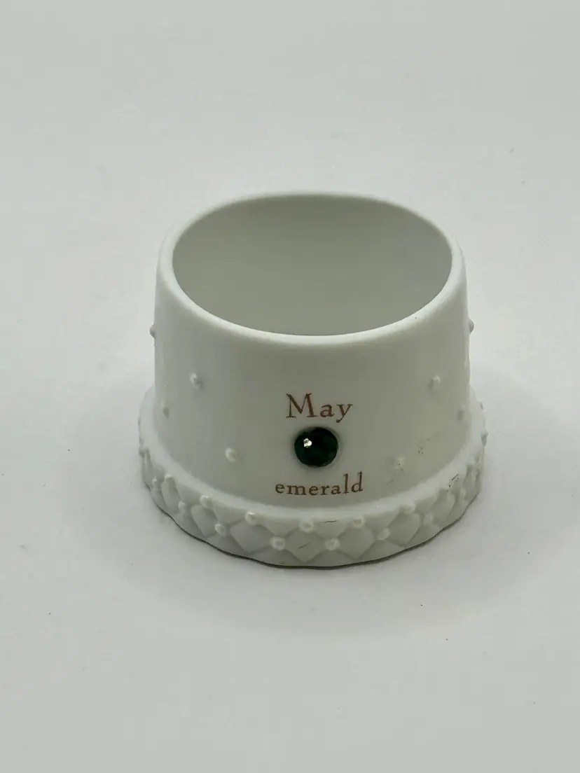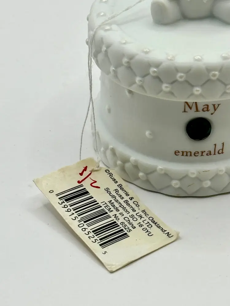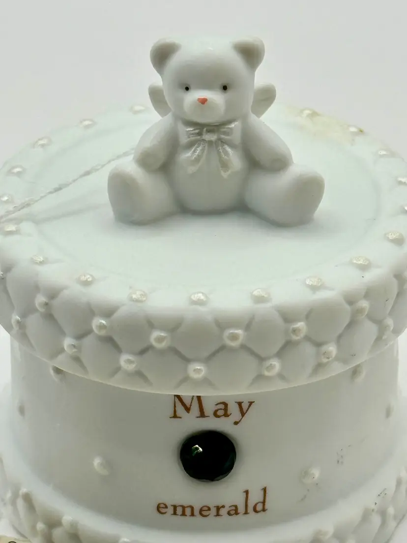 Cherish your tiny treasures with this vintage porcelain trinket box, adorned with a sweet teddy bear figurine on top. The month of May 'Emerald' inscription and gemstone detail add a touch of elegance, making it a perfect keepsake or gift. Complete with original tag, it's a delightful find for collectors. No visible damage. Measures 2x3x2.5. Weighs 6oz.