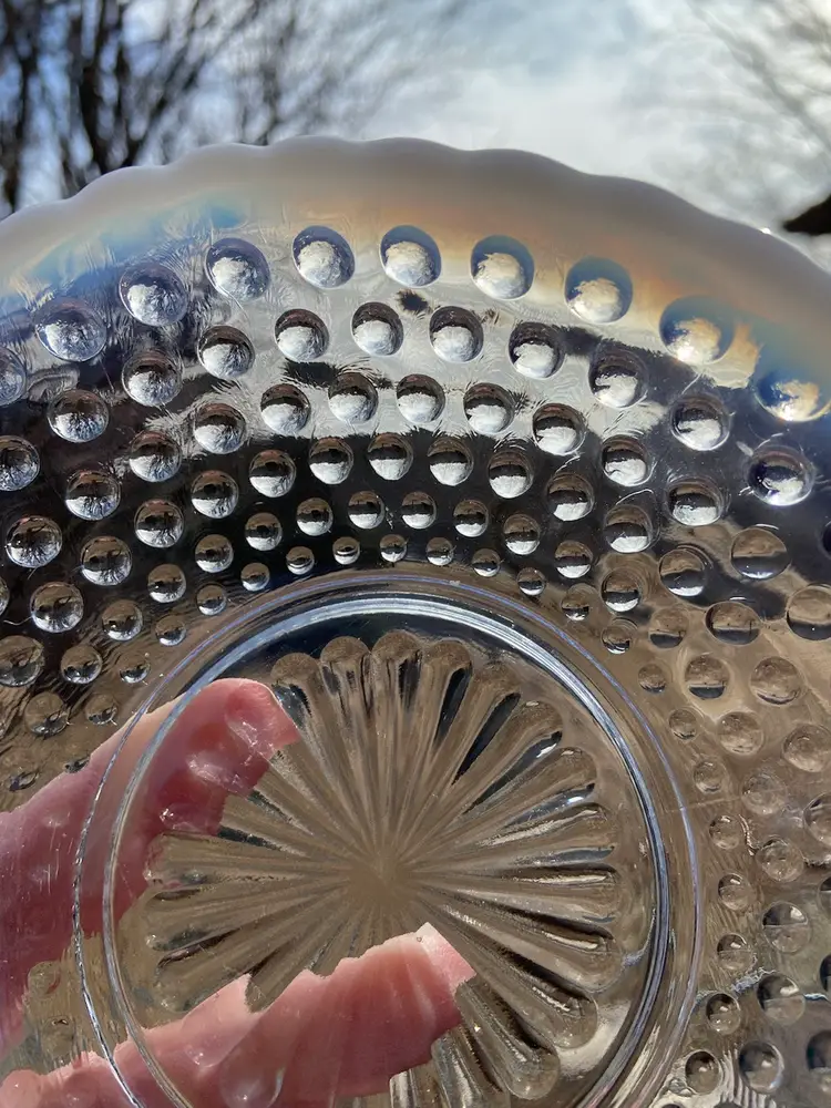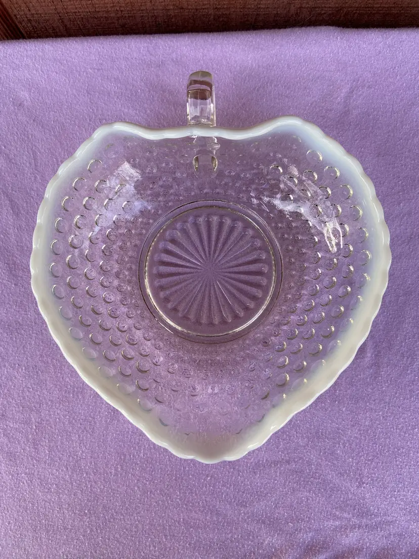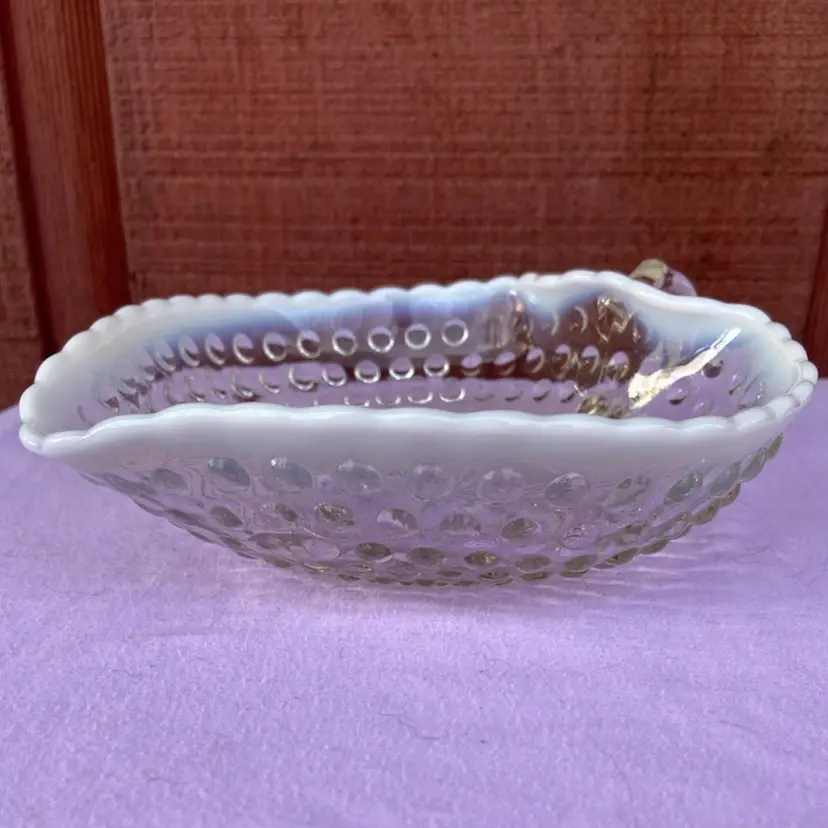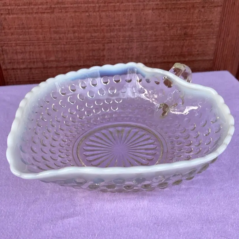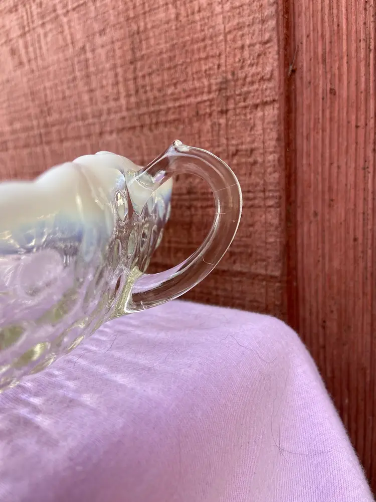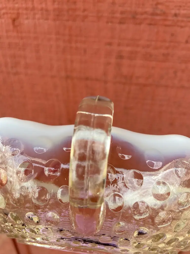 Approx 6.5”w x 7”d (including handle) x 2”h. No chips. Beautiful ring-of-fire in opalescence. See last two pictures for condition of handle. Fingernail catches on line.