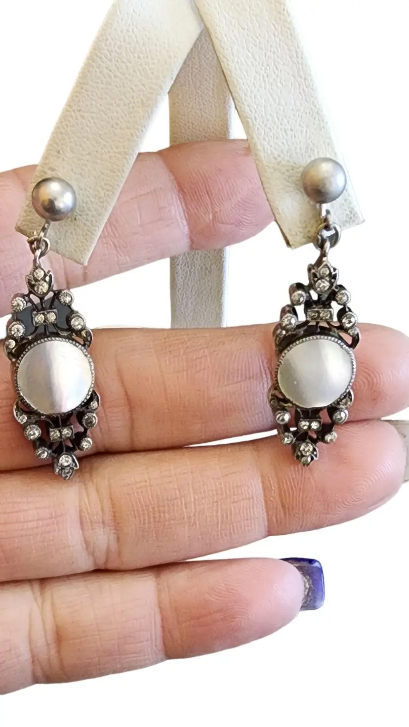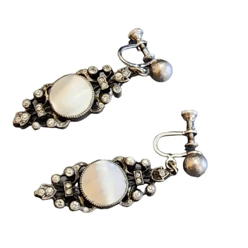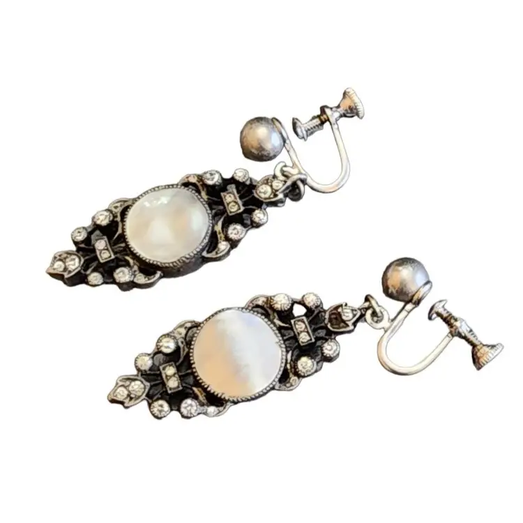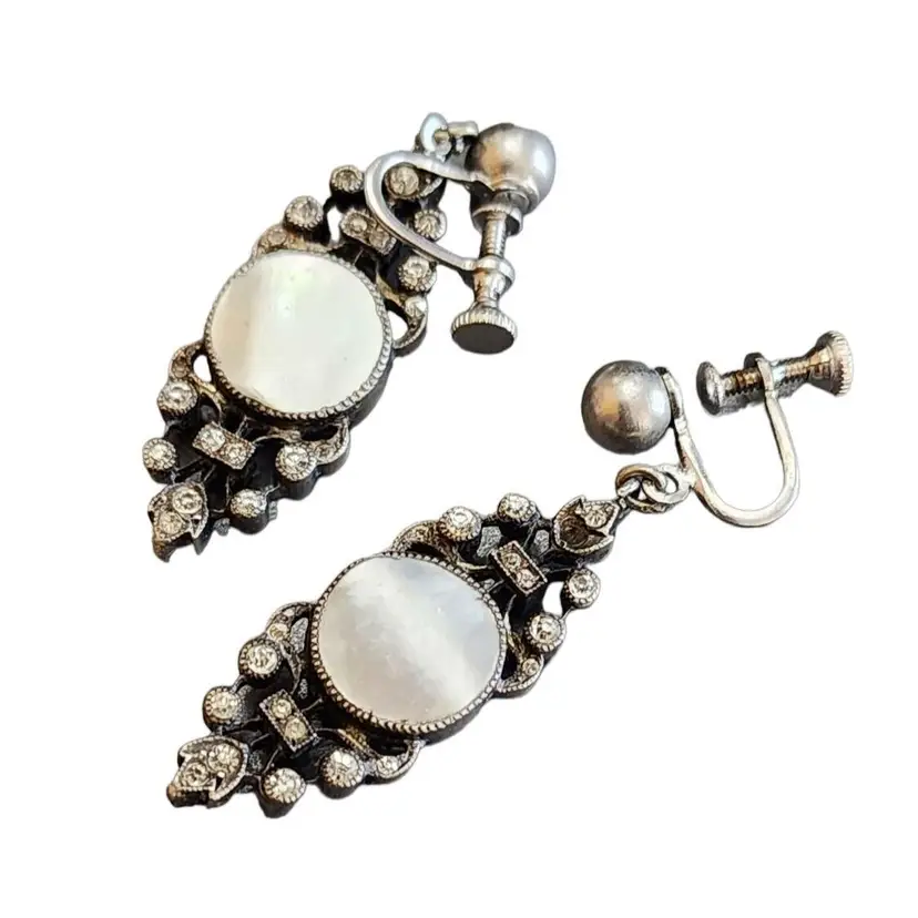Vintage MOP Silver Tone Rhinestone Double Sided Screw Back Clip Earrings (A2729)