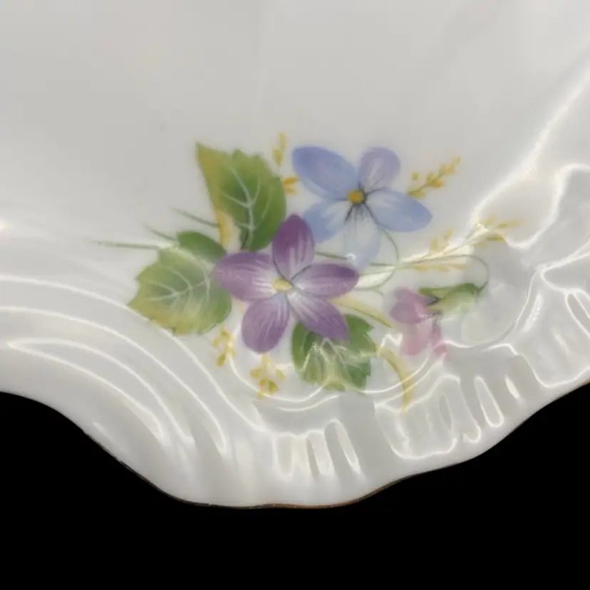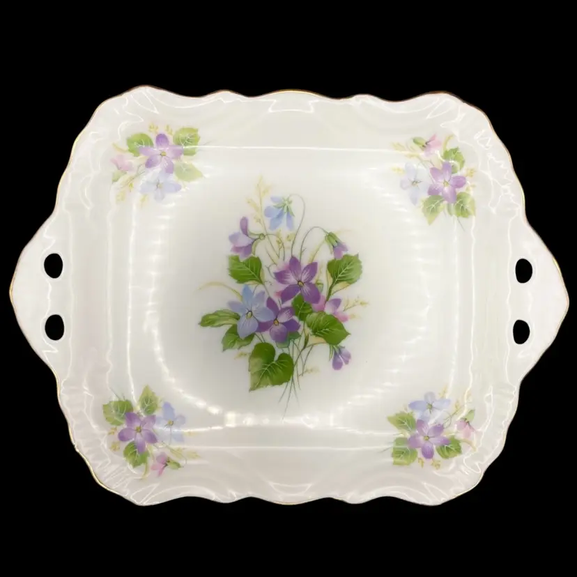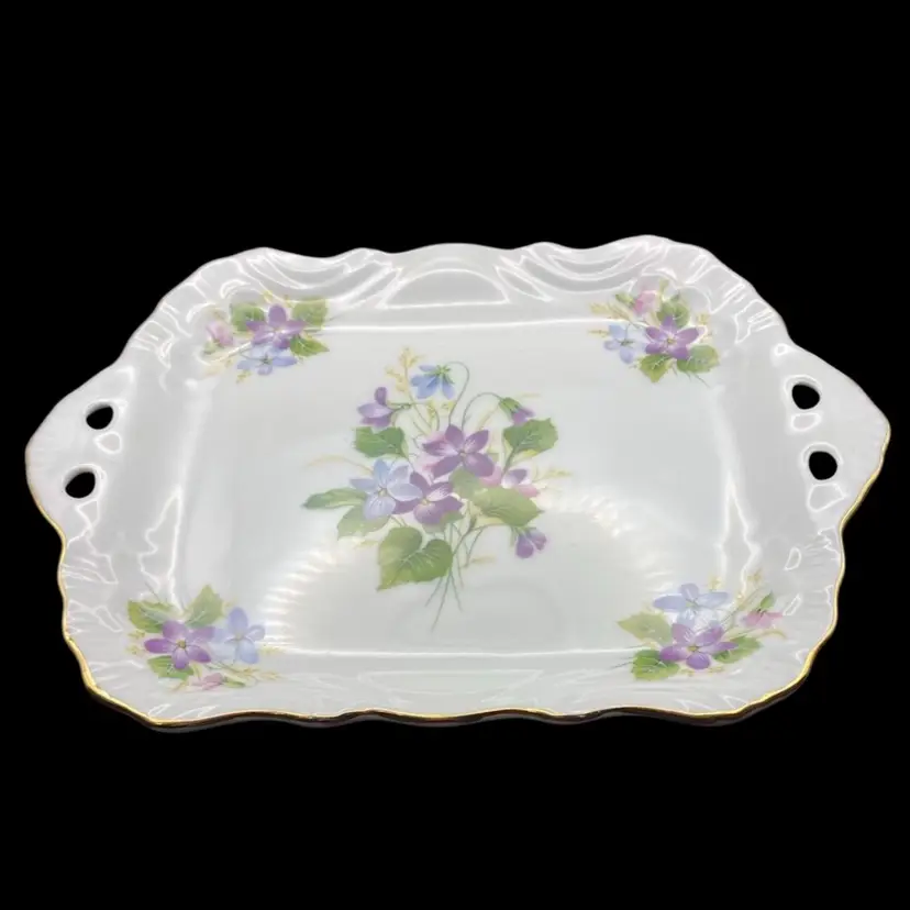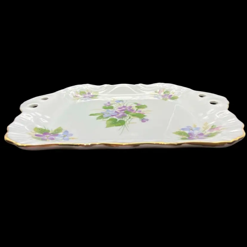This vintage decorative plate from the Morgana Collection features exquisite hand-decorated purple and periwinkle florals on fine bone china. The plate has gold edging and reticulated handles. The plate's intricate details embody the decorative style of the Morgana brand, perfect for any occasion or as a decorative piece in a room's aesthetic.