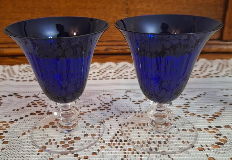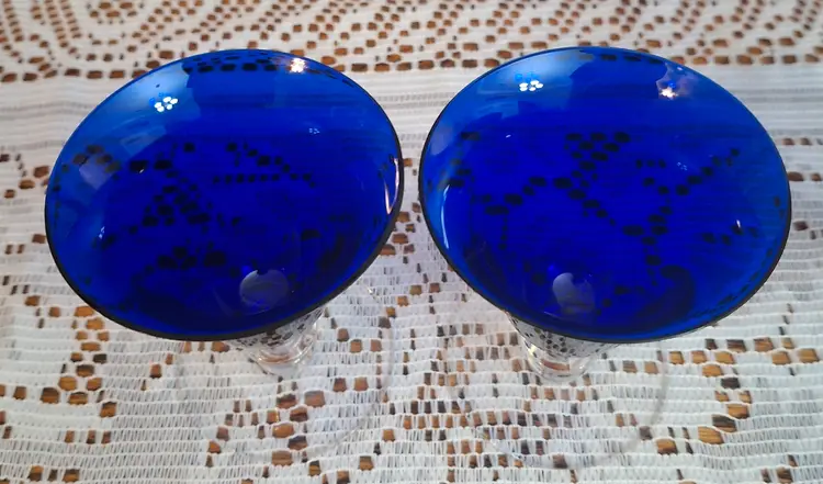 Vintage Morgantown Glass Radiant Blue Oyster/Fruit Cocktail Glass is 5" tall. This beautiful pair of glasses were made between 1957 and 1964 by the Morgantown Glass Company in West Virginia. The quality of the glass is outstanding with the rich, cobalt blue bowl sitting on the wafered glass stem. Set of 2 glasses. No chips, cracks or repairs. Please view the pictures and feel free to ask questions. Thank you for visiting my shop.