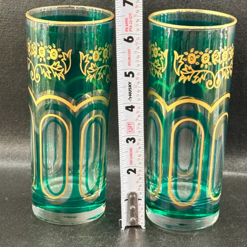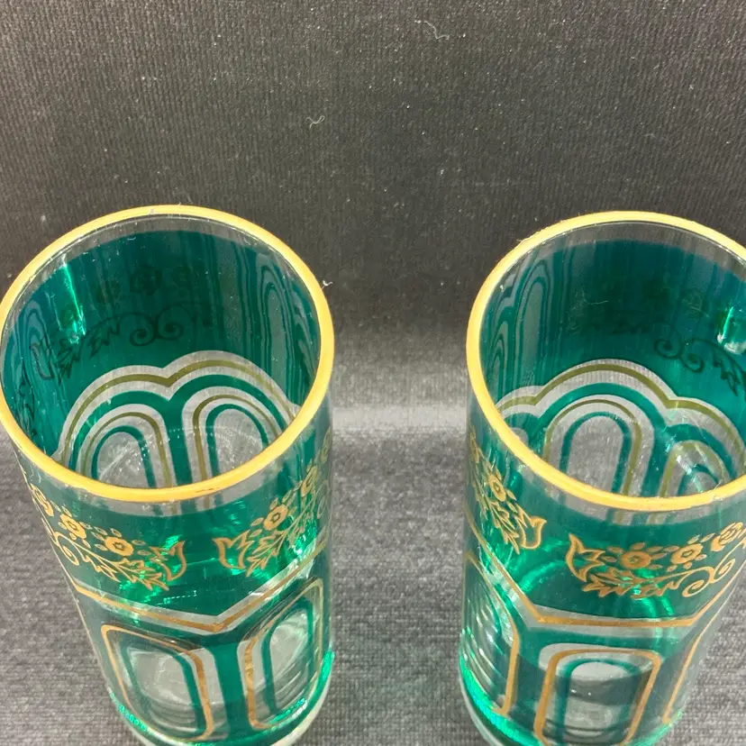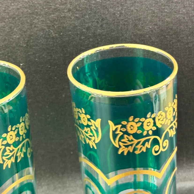 Black background makes the color appear green, but they’re beautiful shade of deep teal. No chips or cracks. Minimal wear to the gold around rim. See photos. Approximately 6.5” tall