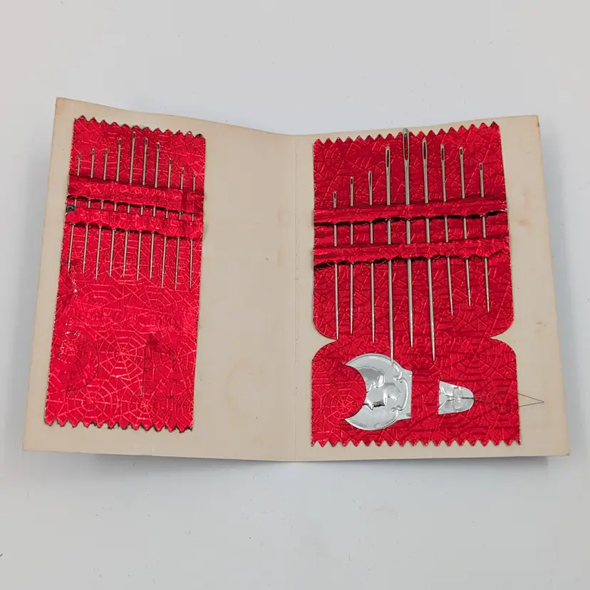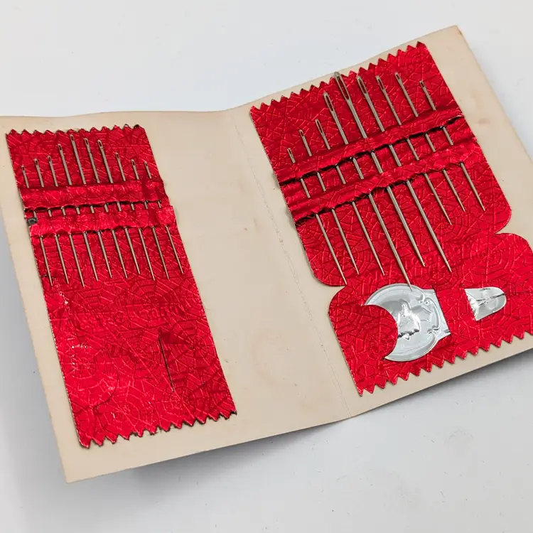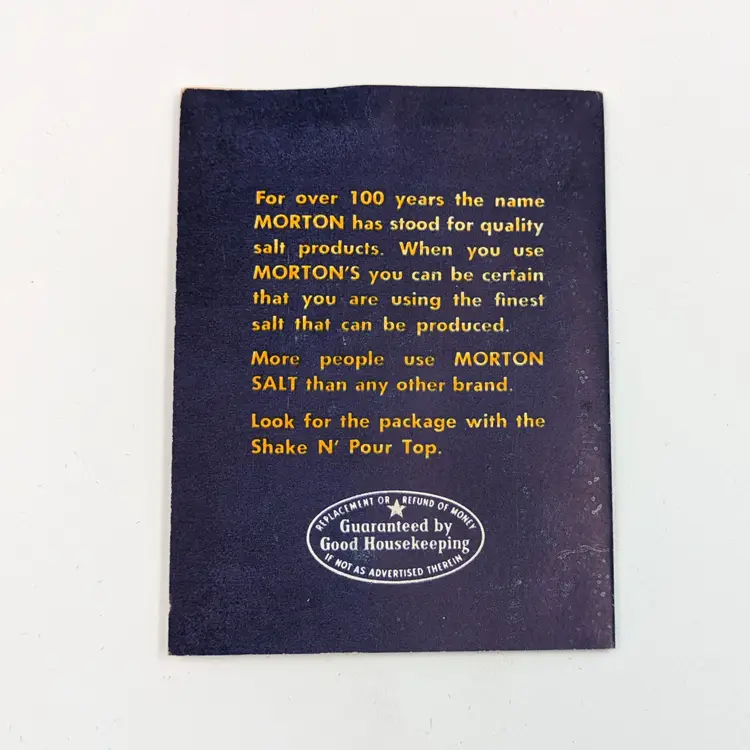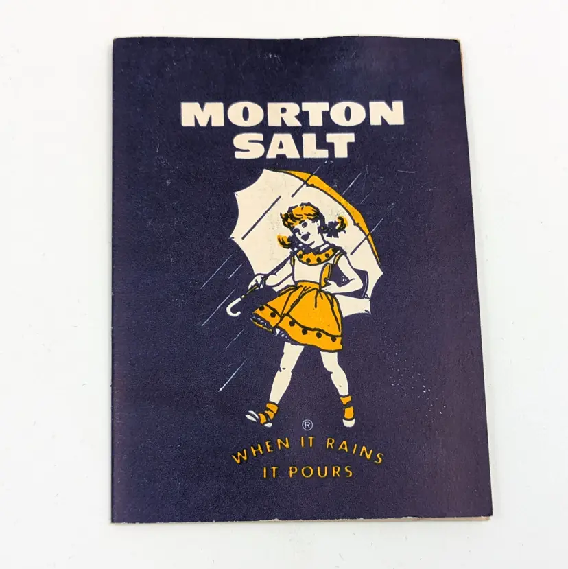 Charming vintage Morton Salt advertising needle booklet featuring the iconic Morton Salt Girl and 'When It Rains It Pours' slogan. The foil is stamped with a spider web pattern and marked Made in Western Germany on the back. Perfect for collectors of sewing related items or advertising memorabilia. In good vintage condition.