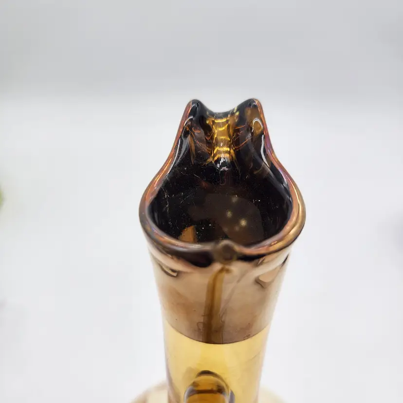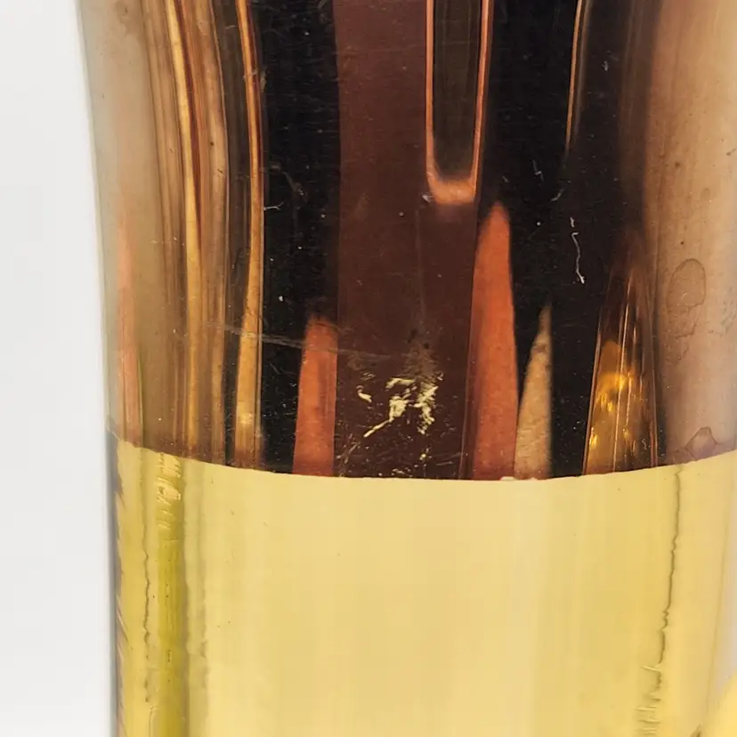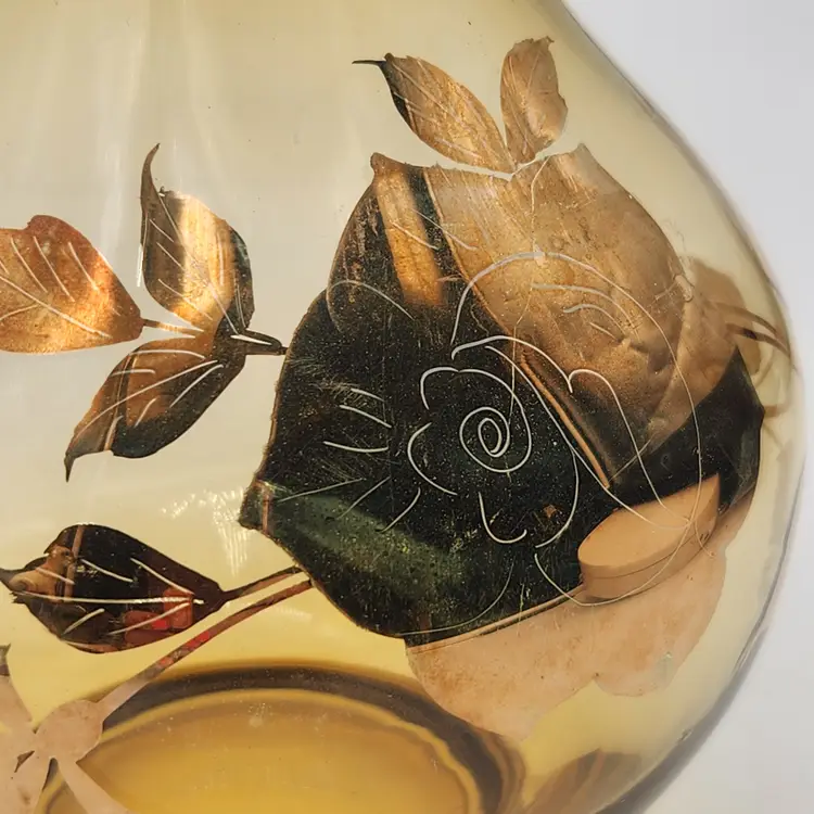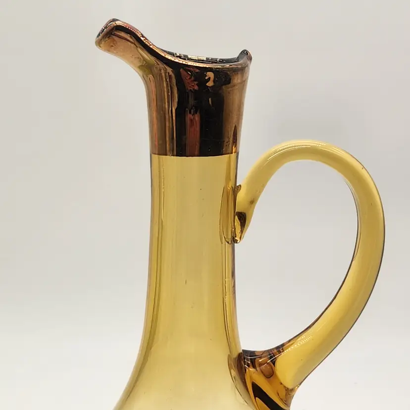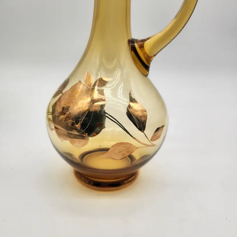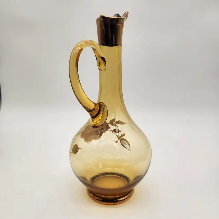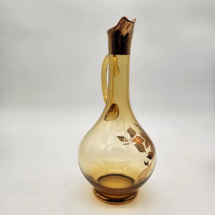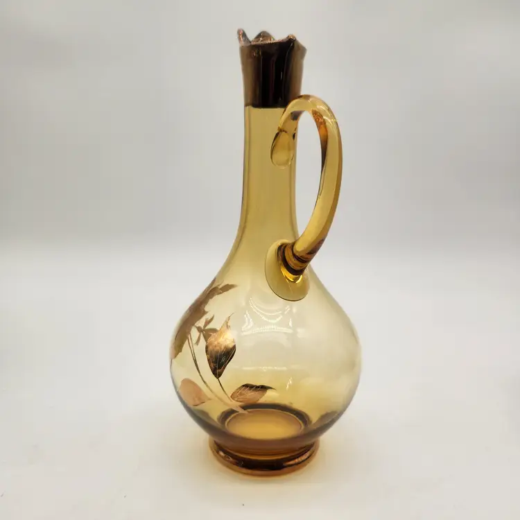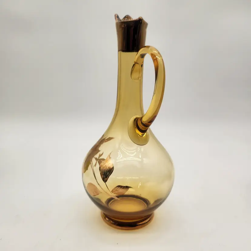 Keywords: MCM, Venetian Glass, Amberina, Barware, Hollywood Regency, Vintage Decor, Art Glass, Hand Painted, Gilded, Floral Etched, Retro Kitchen, Collectible Glass, Ewer, Bud Vase