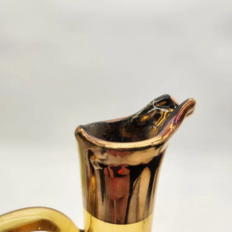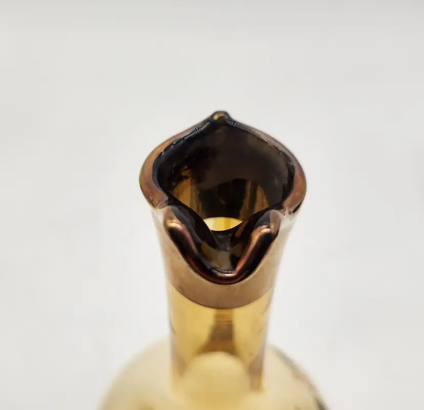 This elegant Moser pitcher with its graceful lines and gilding will add a touch of mid-century modern class to your bar or table. Handmade of beautiful amber glass in the Czech Republic, it features an iridescent gold overlay around the pouring spout and in a stunning rose design. Measurements: 10 1/2" tall, 5 1/2" at widest point. Good Condition: missing stopper, slight wear appropriate to the age of the piece on gold overlay (see photos). No chips or cracks. Priced accordingly.