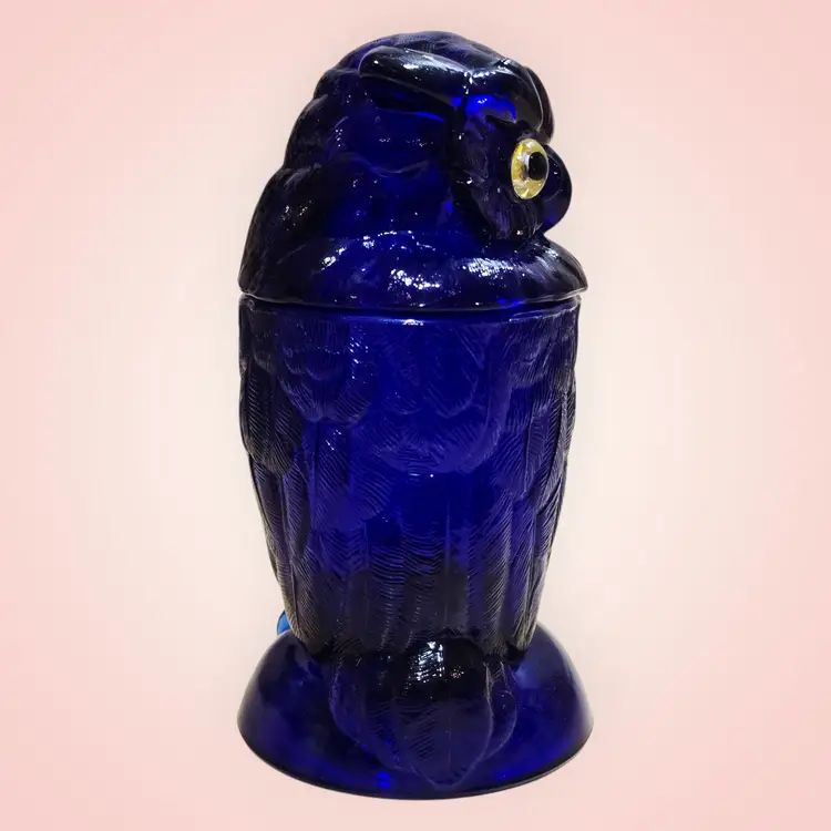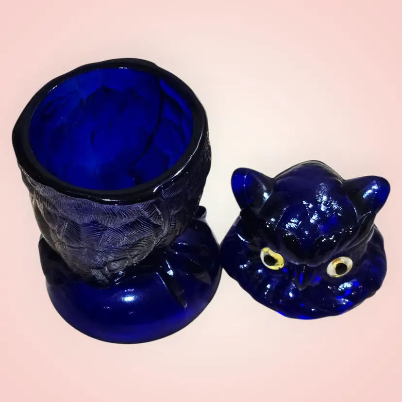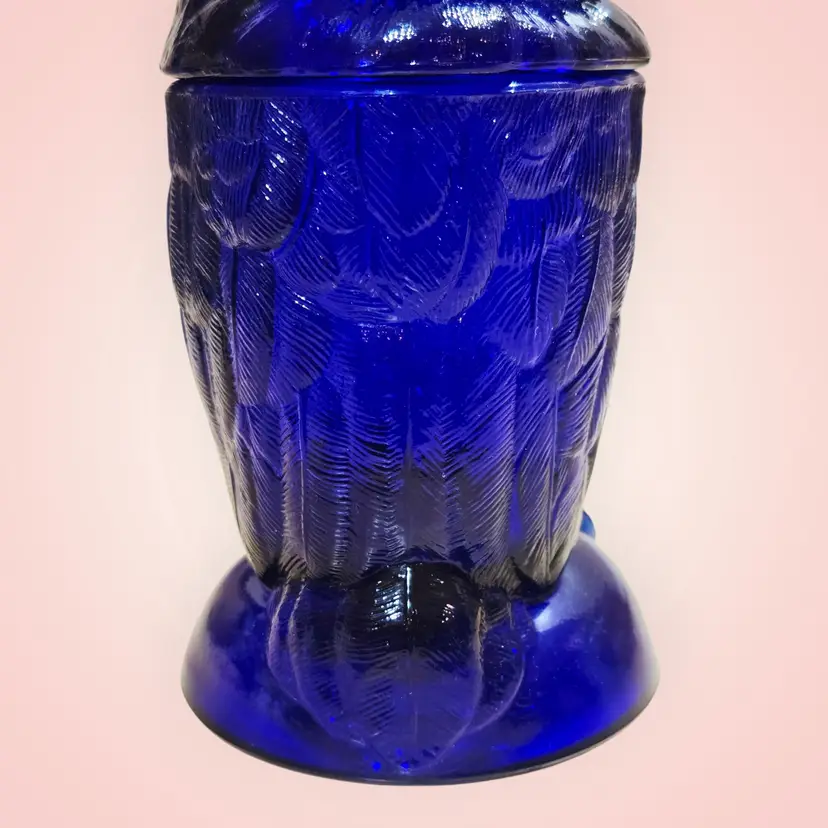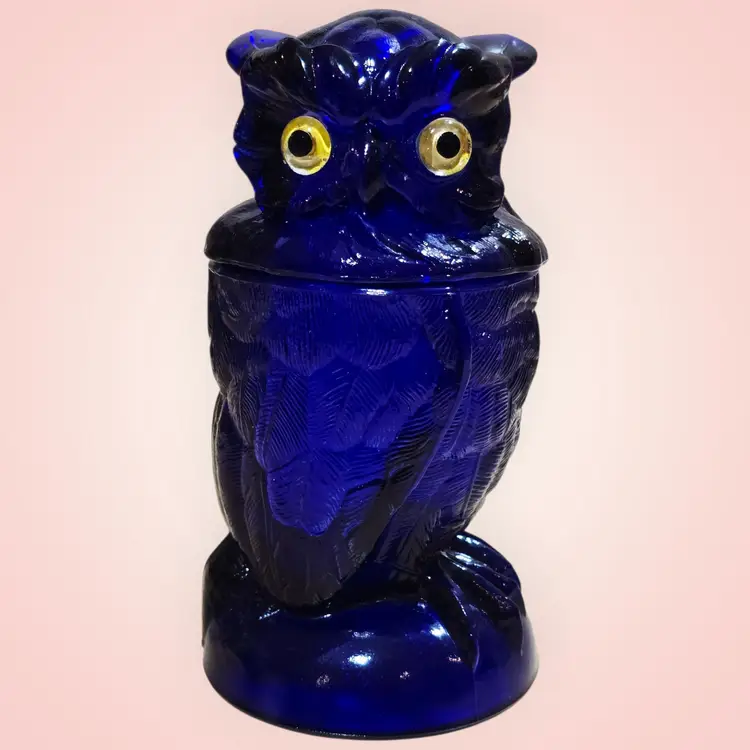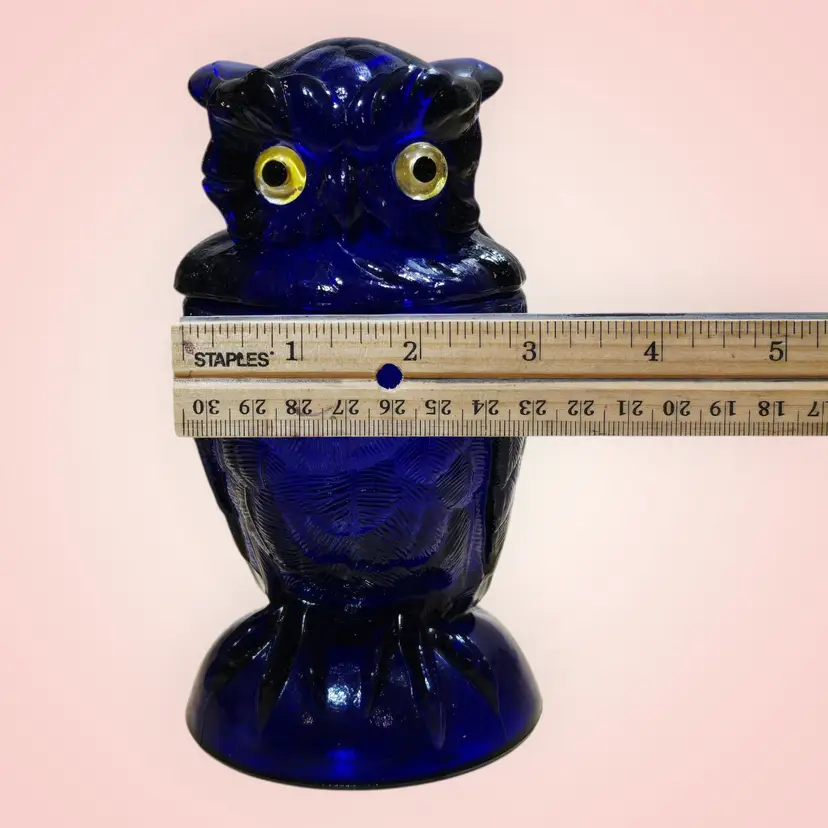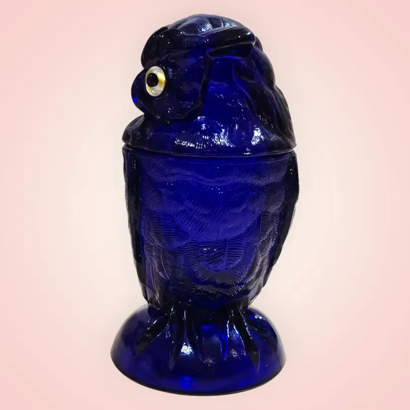 Vintage Mosser Cobalt Blue Glass Toby The Owl Covered Dish Candy Jar 6.5" Tall