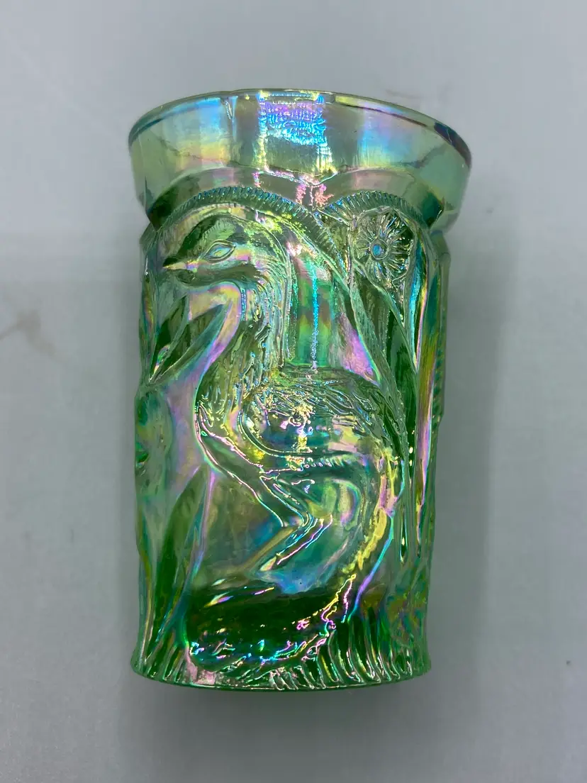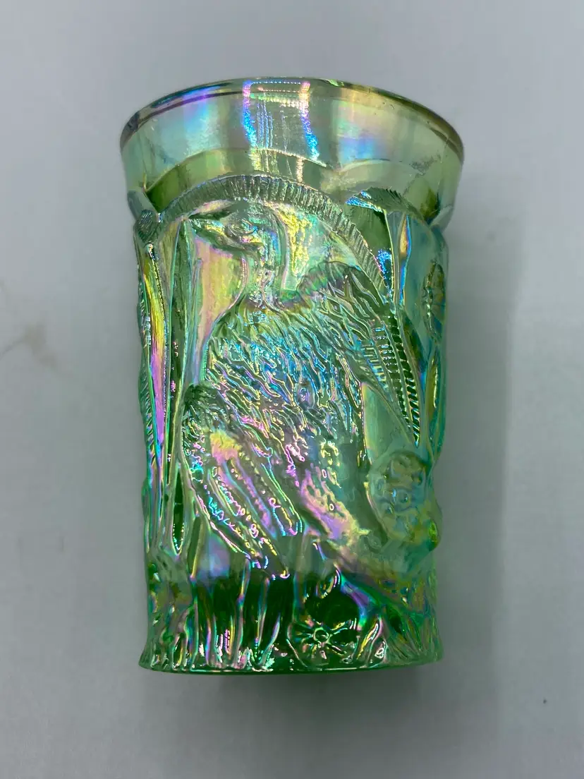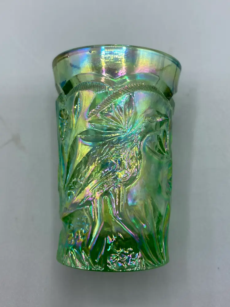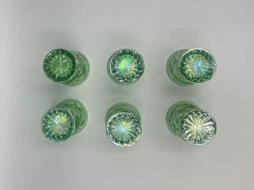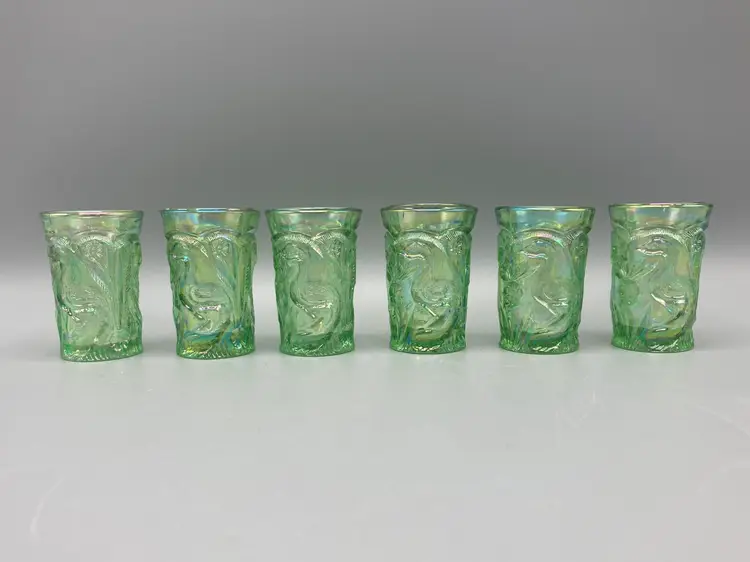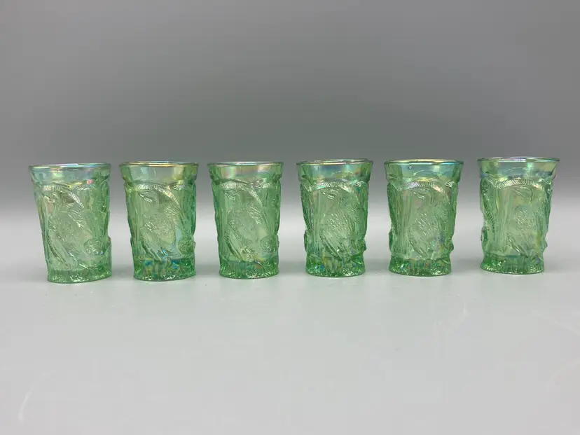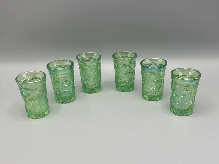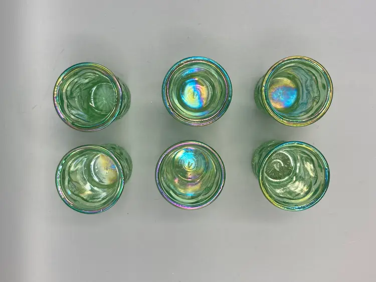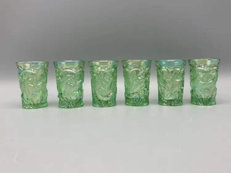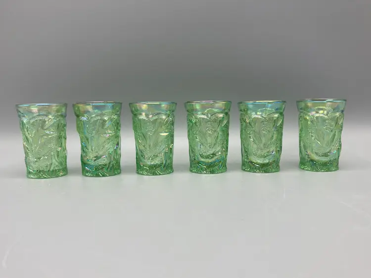 These miniature water glasses were produced for Dorothy Taylor of the "carnival glass encore" Contemporary Carnival Glass Club, based in Kansas City, Missouri. They were made to coincide with Encore's first national convention in 1977. They were modeled on an earlier full-sized version and were made by Mosser Glass.