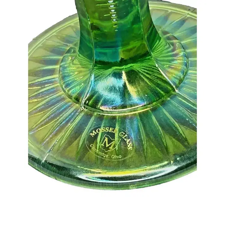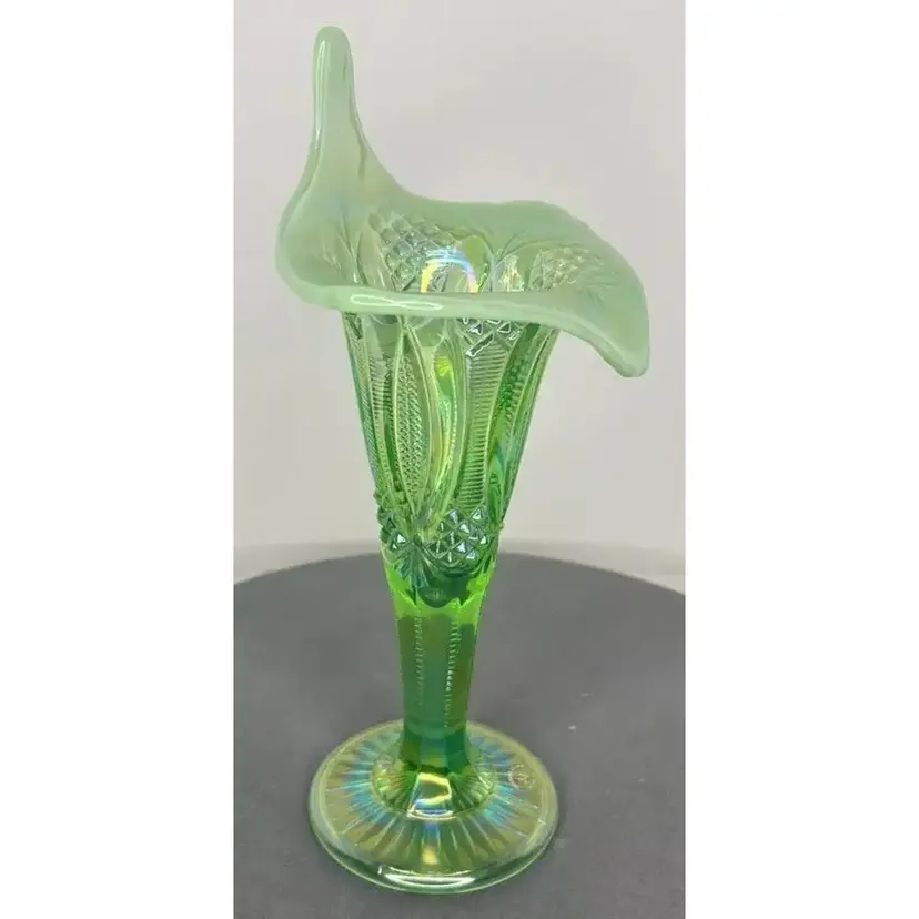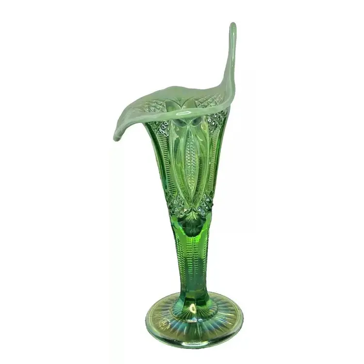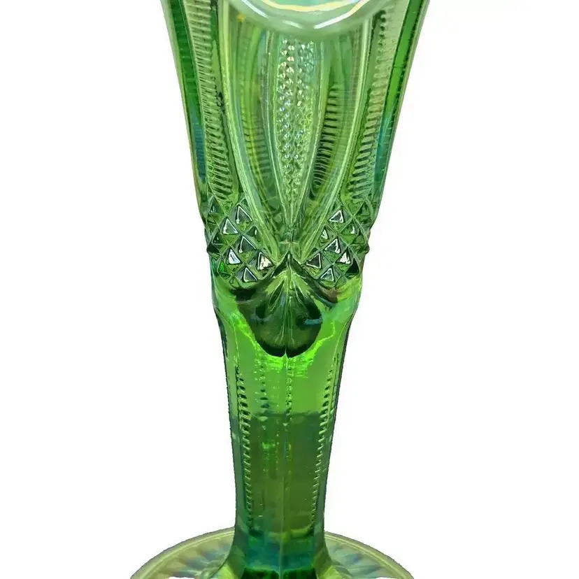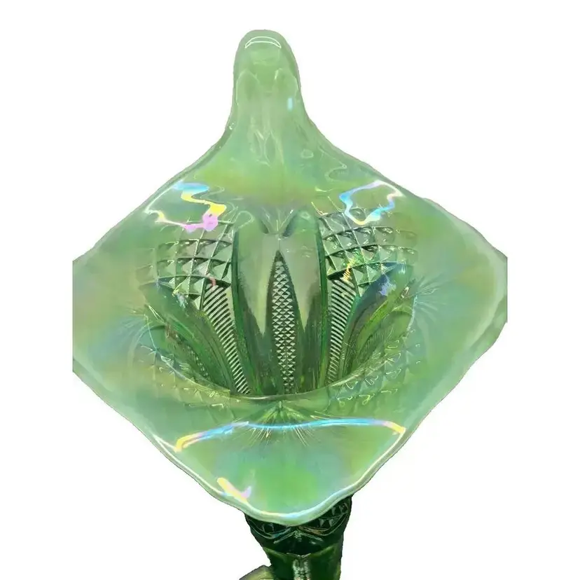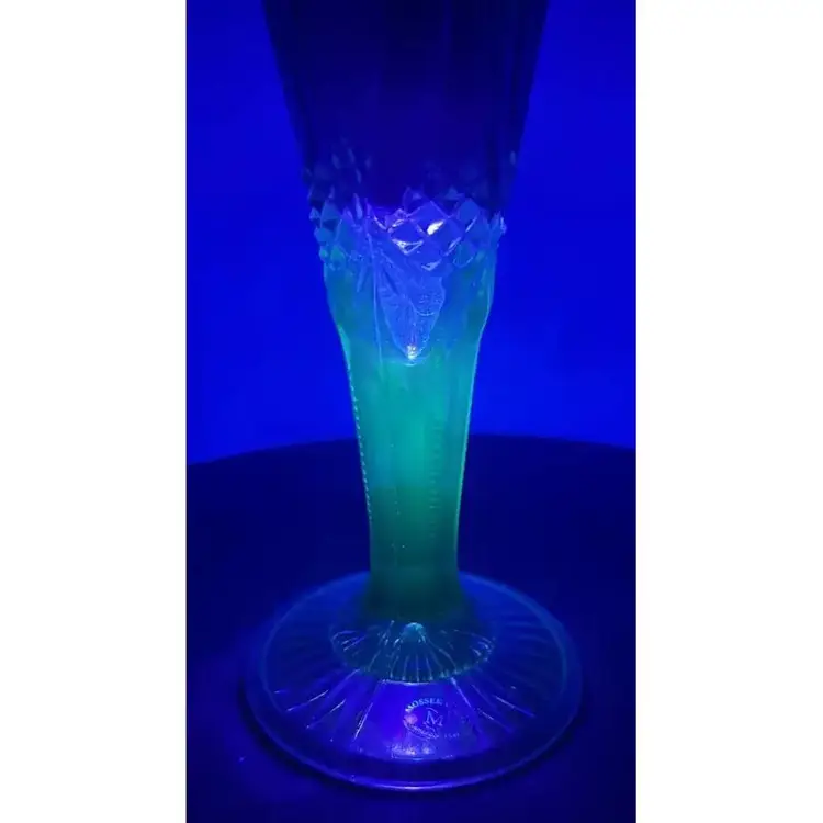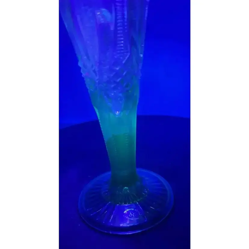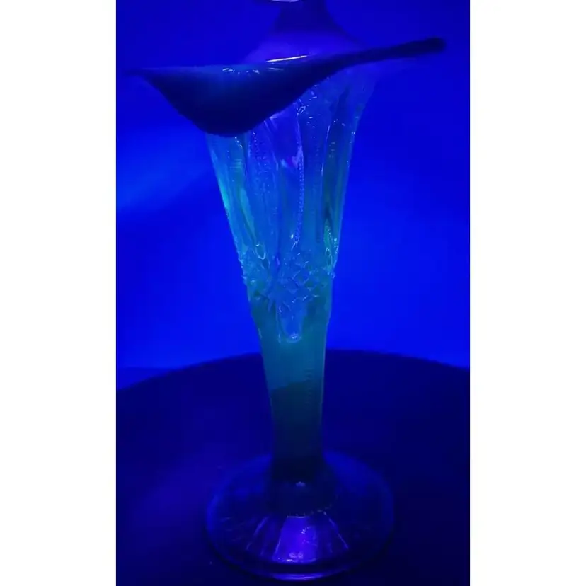 Mosser Vaseline Jack In The Pulpit Vase Opalescent Diamond & Zipper Pattern is UV reactive, has its original sticker and it is in wonderful vintage pre-owned condition, with NO chips or repairs. However, there appear to be two "cracks" which appear to have happened during the manufacturing process as they feel smooth and there is no chipping of the glass. Please review all pictures for proper assessment of its wonderful vintage pre-owned condition.
