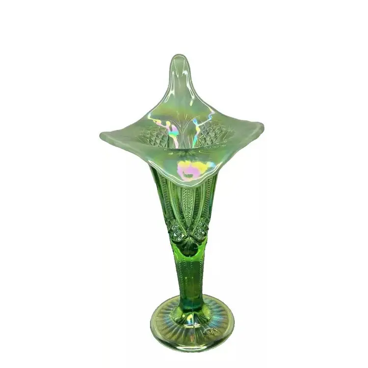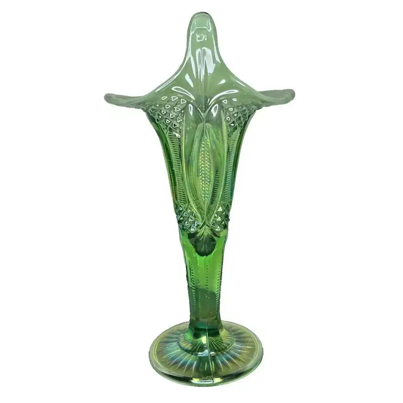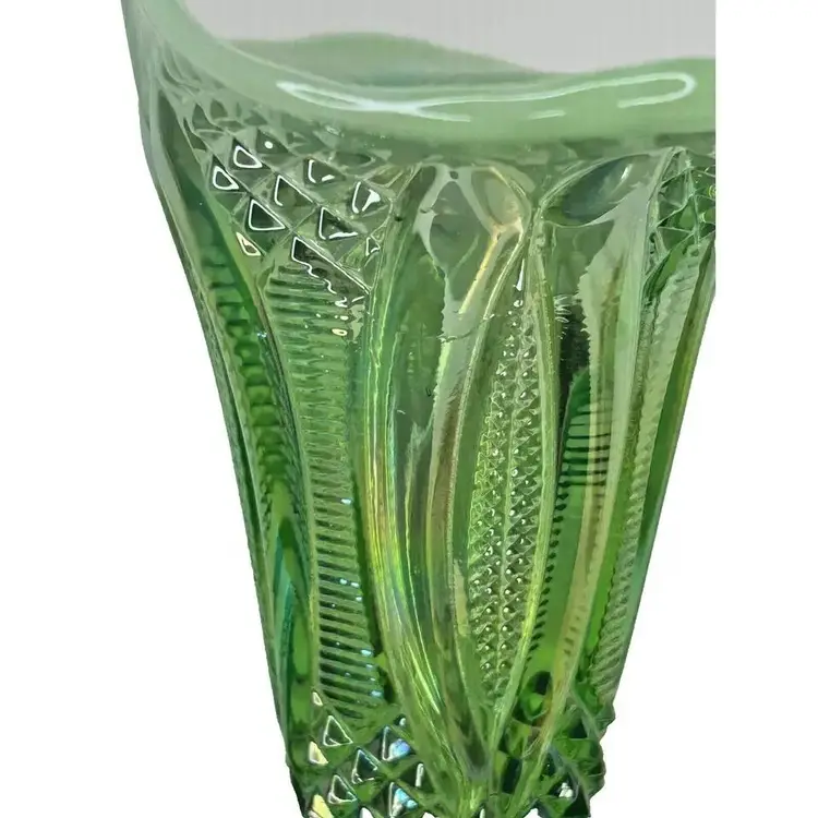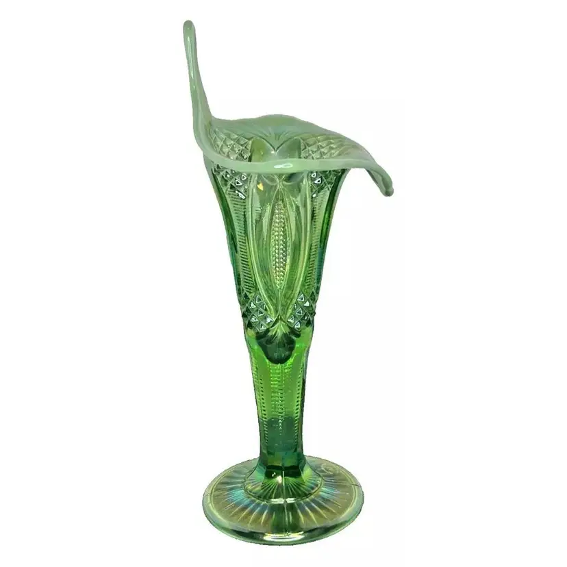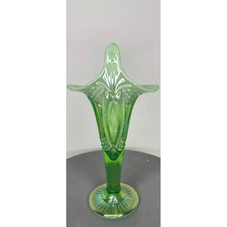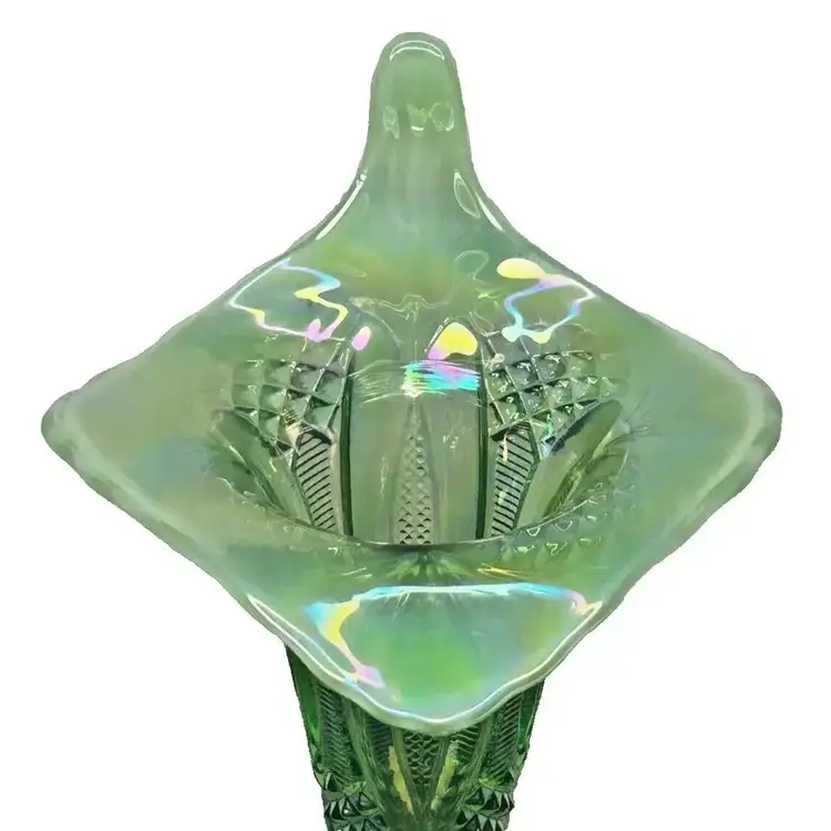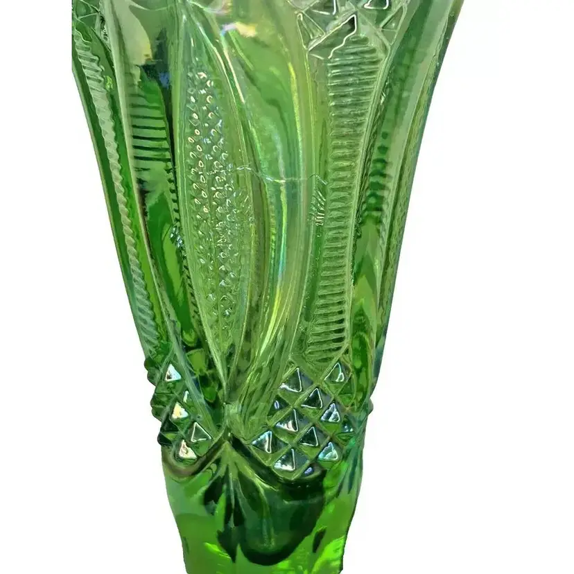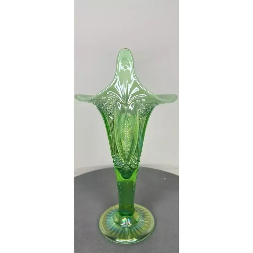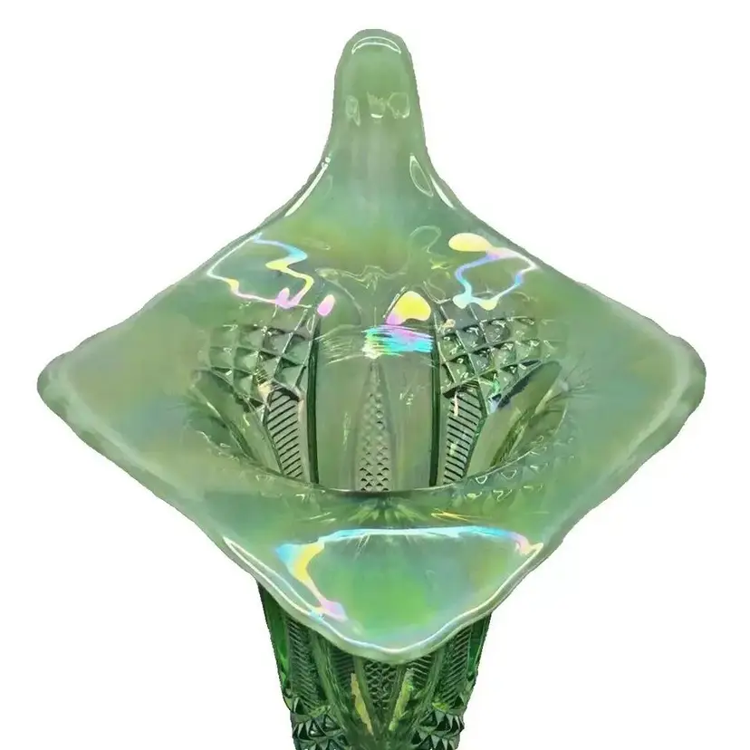 Mosser Vaseline Jack In The Pulpit Vase Opalescent Diamond & Zipper Pattern is UV reactive, has its original sticker and it is in wonderful vintage pre-owned condition, with NO chips or repairs. However, there appear to be two "cracks" which appear to have happened during the manufacturing process as they feel smooth and there is no chipping of the glass. Please review all pictures for proper assessment of its wonderful vintage pre-owned condition.