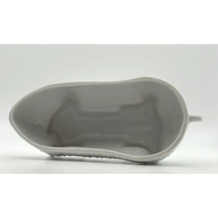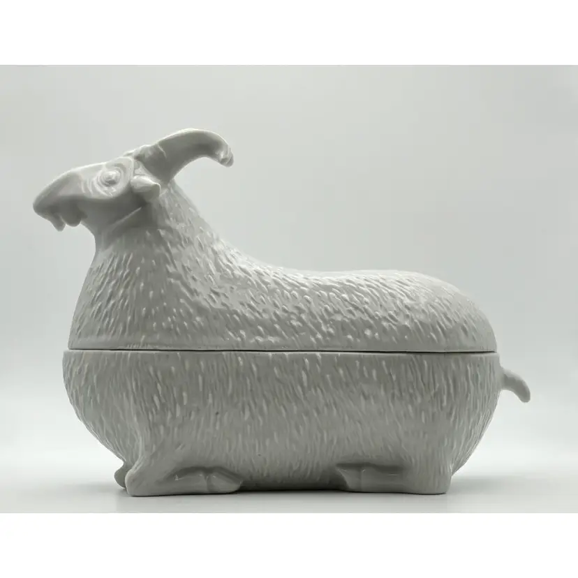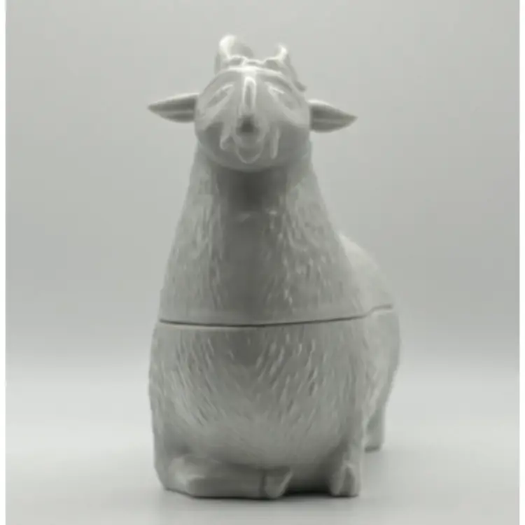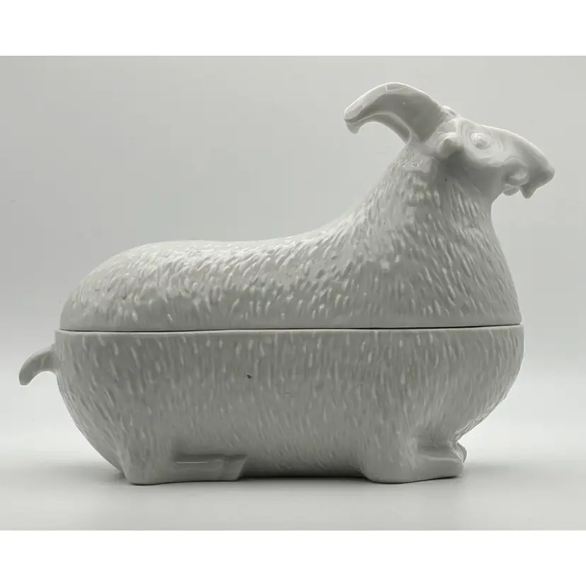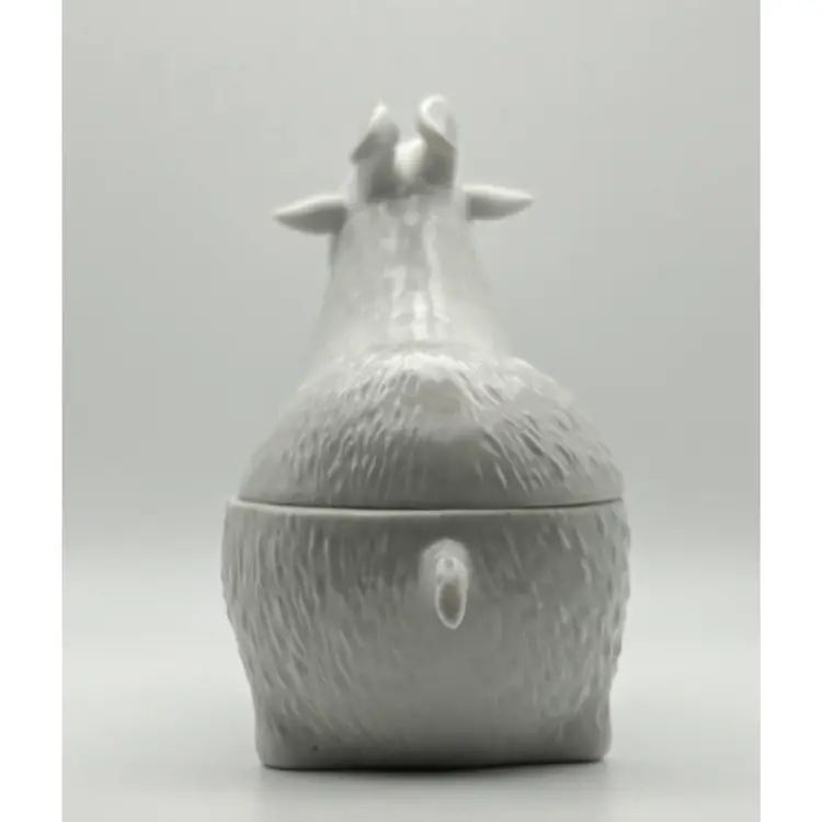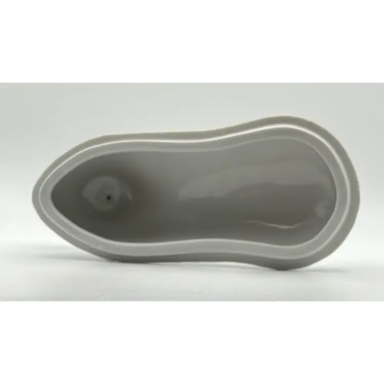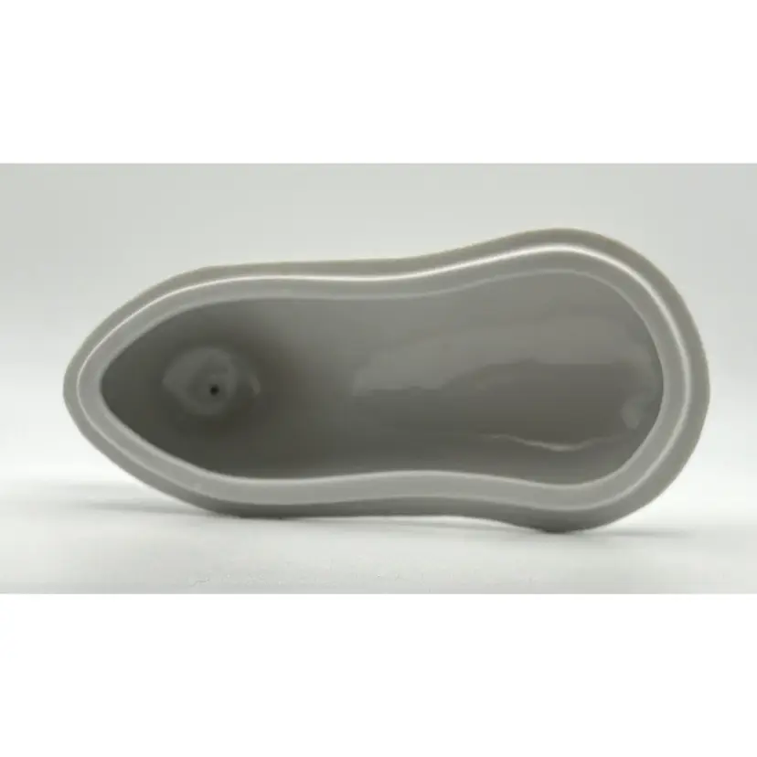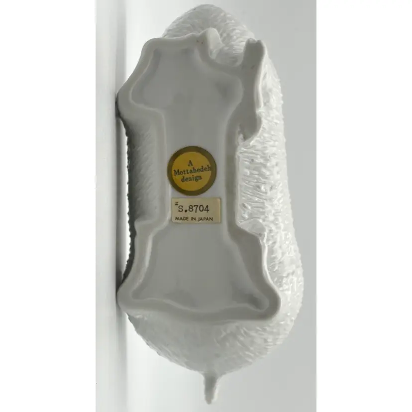 The dish measures 7 1/2" long x 5 1/2" high at the widest haunch point: no chips or cracks. The black spots on the dish are holes in the glaze.