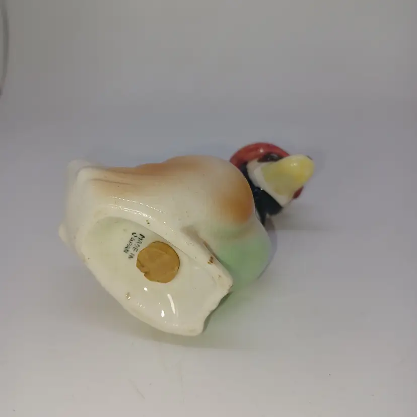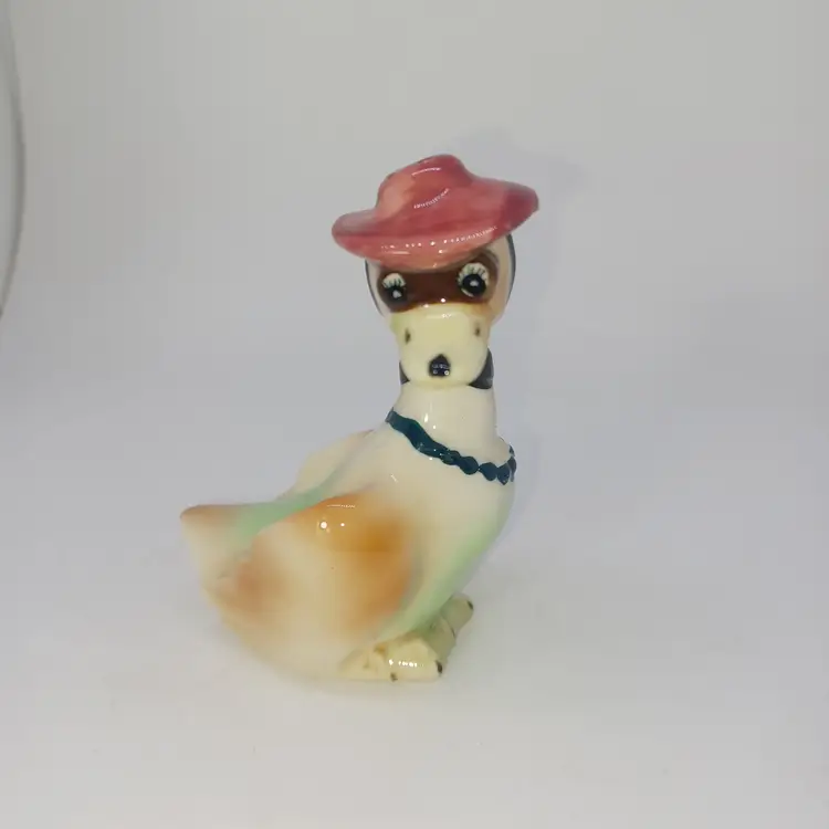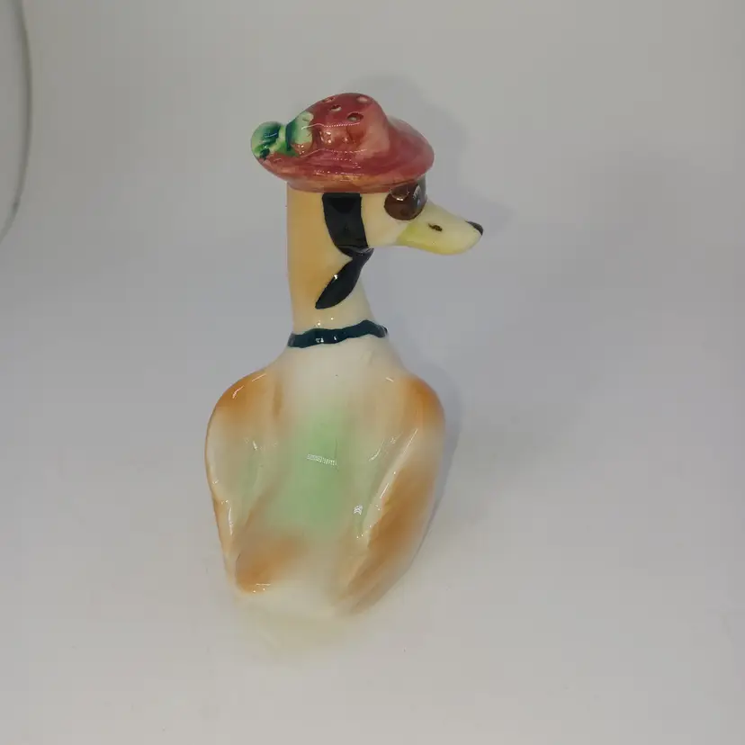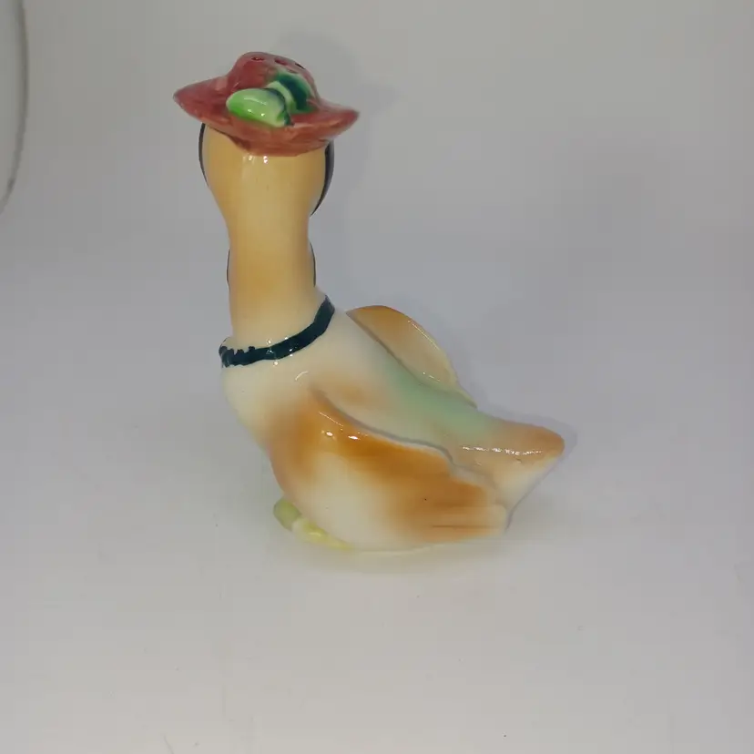 Vintage Mrs Duck salt Shaker she's wearing a red hat and a bandit mask marked made in Japan on the bottom with original cork measures approximately 3 1/2 in tall please see all pictures as they are the best description all items from a smoke-free home with pets experienced fragile shipper great replacement for your broken set I've also seen these used in dioramas and flower bouquets