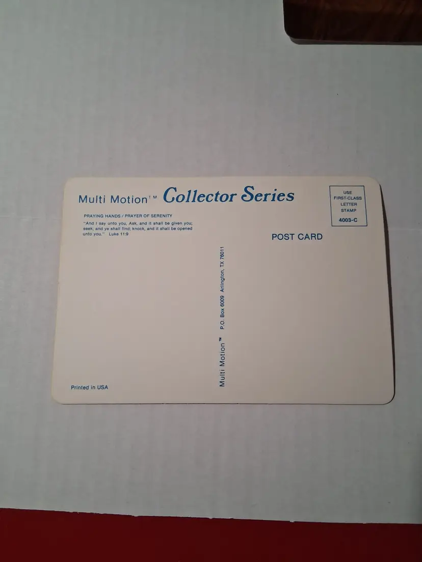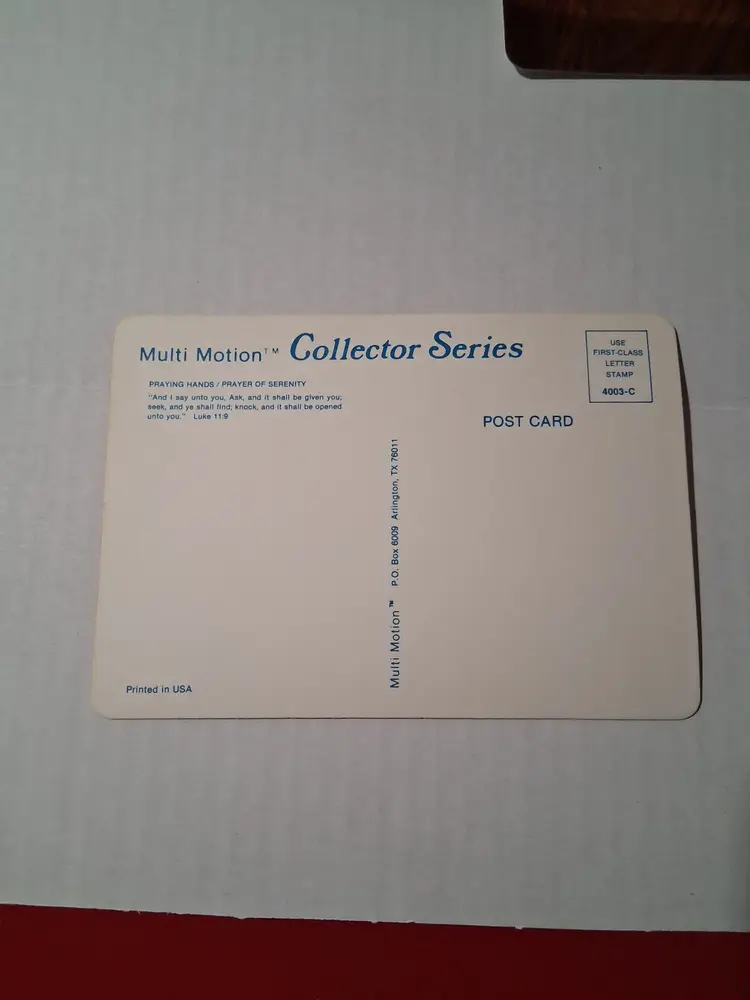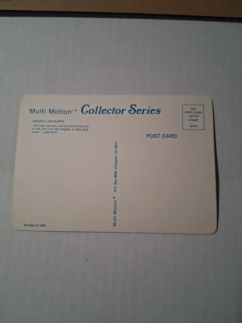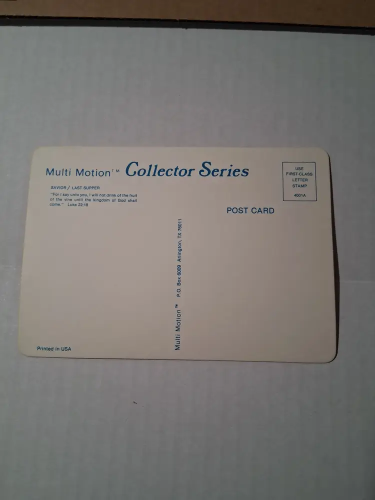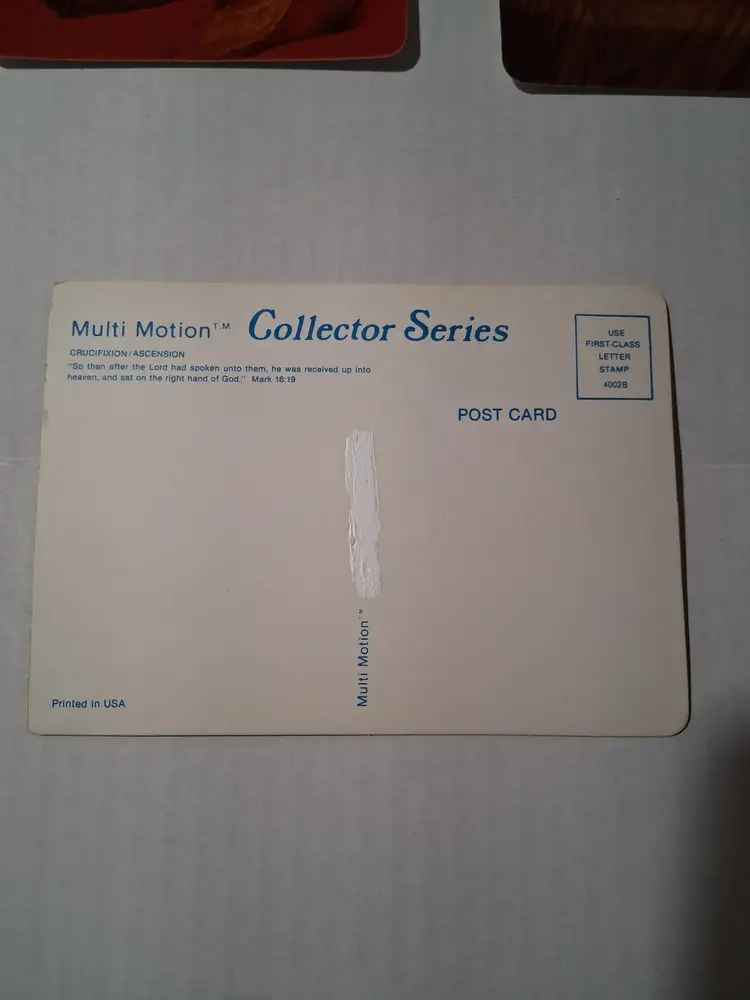 This is a vintage set of three postcards featuring Jesus Christ. The postcards are from the Multi Motion Collector Series and are in their original unposted condition. The postcards measure 6 3/8 x 4 1/2 inches and were published by Visual Panographics, Inc. The featured person is Jesus Christ and the subject is religious in nature. The postcards were made in the United States and the era is post-war (1945-Now). The city featured on one of the postcards is Golgotha, which is located in Israel. The postcards are in excellent condition and would make a great addition to any postcard collection.