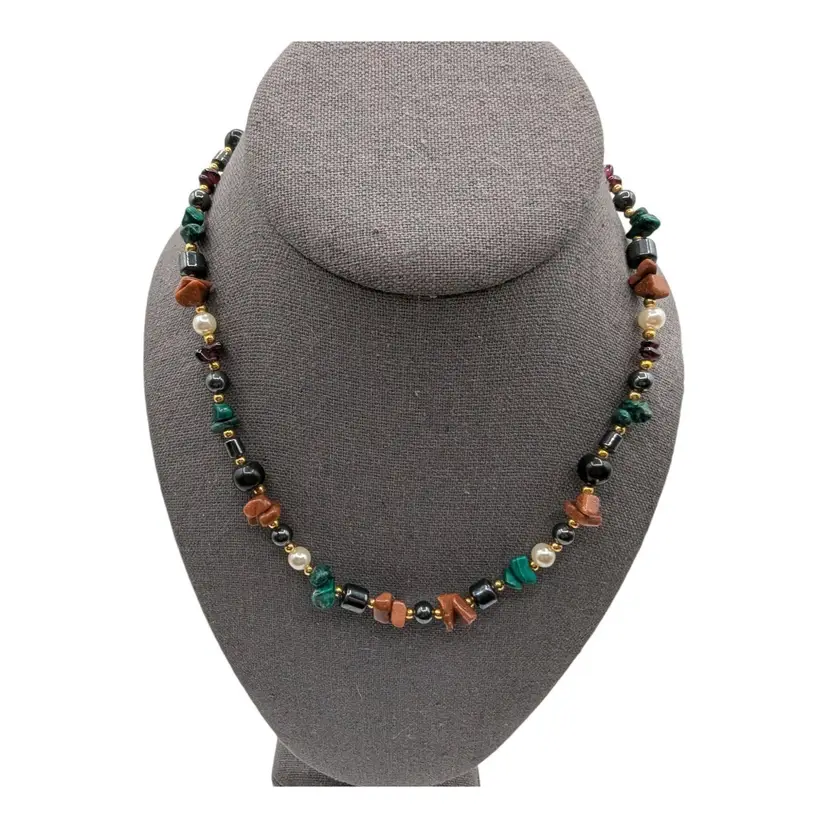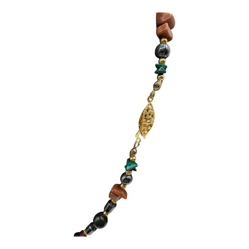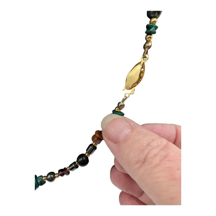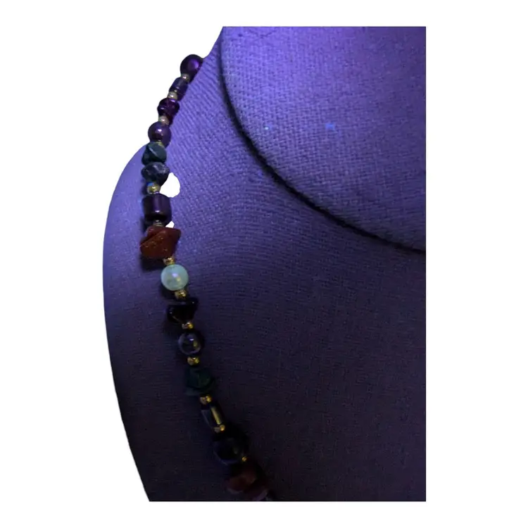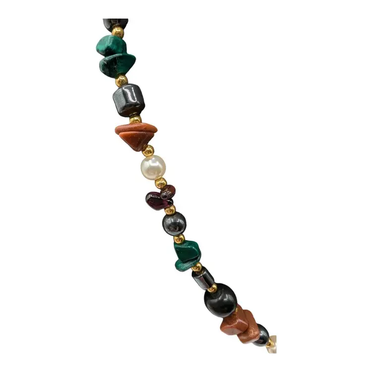 Beautiful vintage necklace featuring a mix of colorful stones and beads. Perfect for adding a unique touch to any outfit. No visible damage. 16"