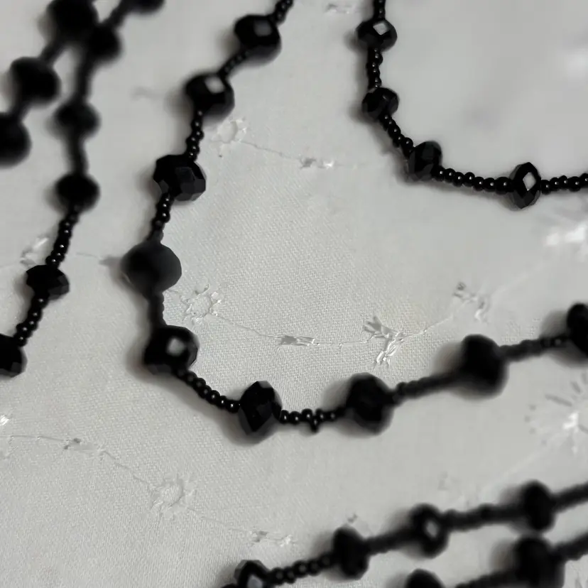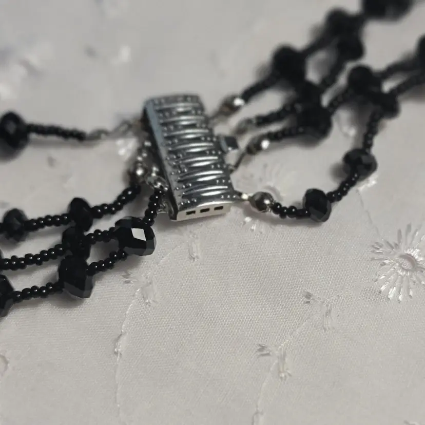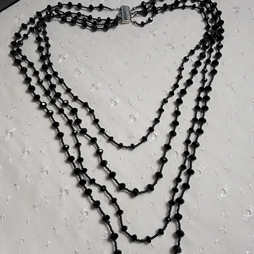 Add a touch of vintage charm with this elegant multi-strand black bead necklace. Perfect for dressing up any outfit with a classic flair.