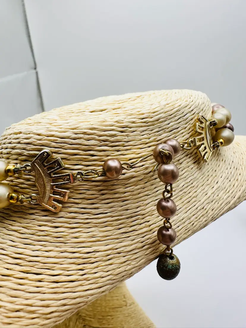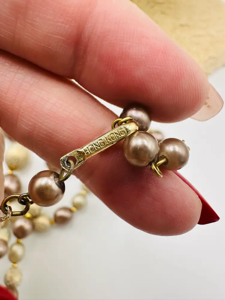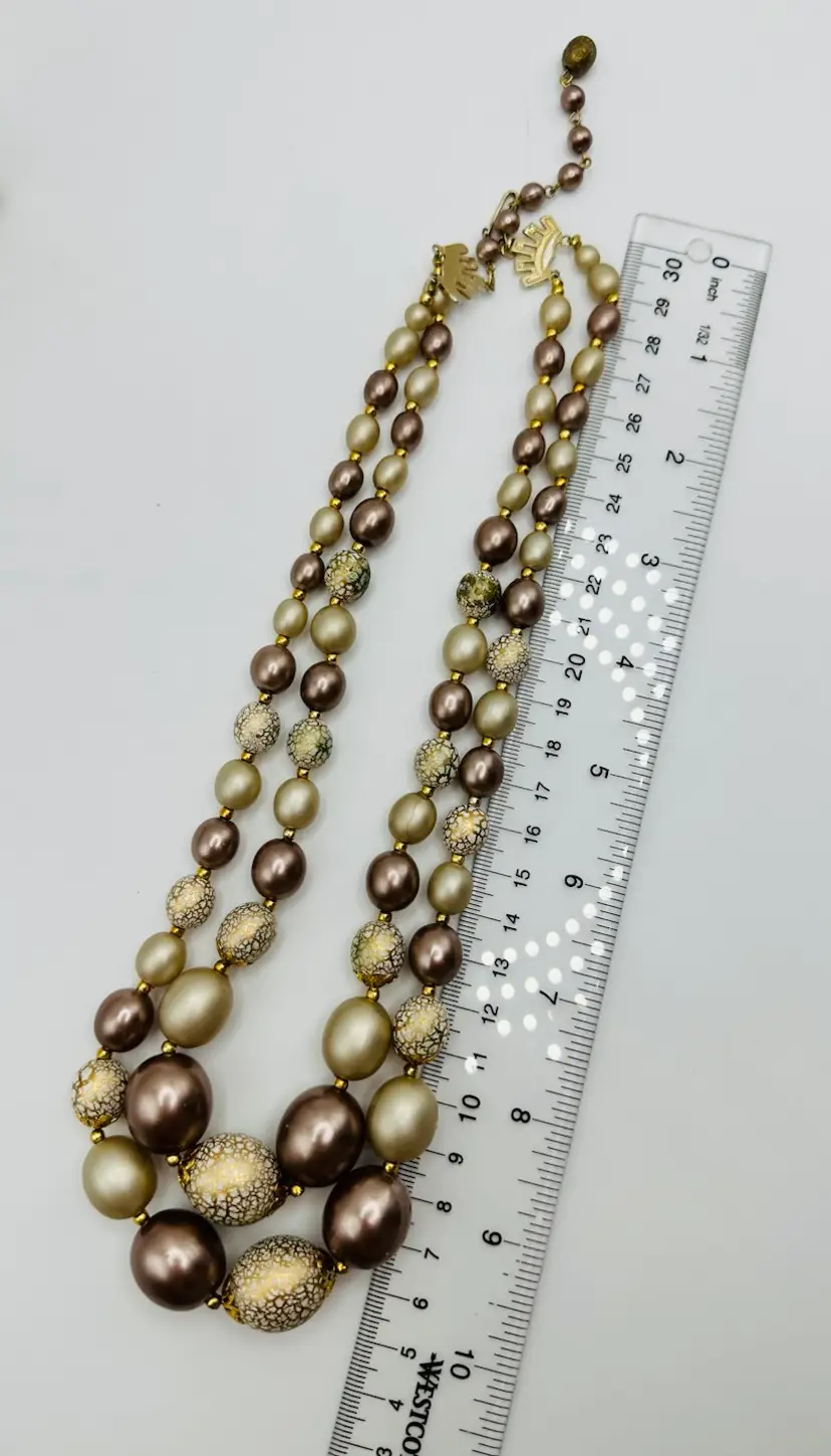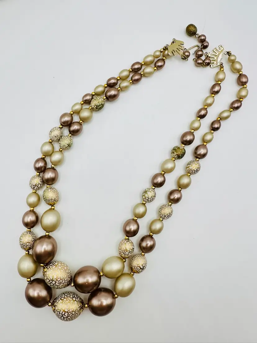 The Vintage Hong Kong 2 Strand Crackle Bead Necklace is a stylish and unique piece of fashion jewelry from the 1950s. Made in Hong Kong, the necklace features two strands of beige crackle beads with a hook closure. Signed by the Strand brand, this original piece is 18-20 inches in length and is sure to make a statement with its vintage charm. Perfect for adding a touch of retro flair to any outfit, this necklace is a must-have for any collector of vintage jewelry.