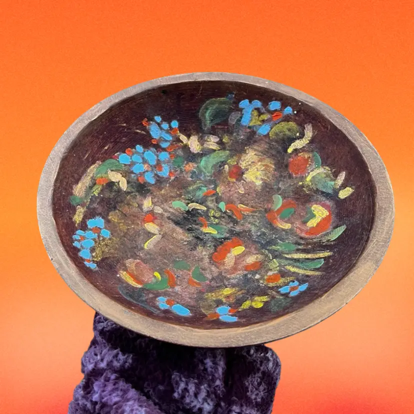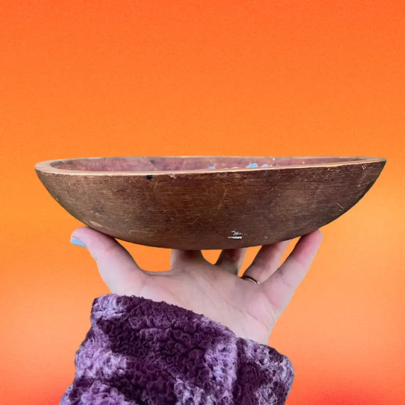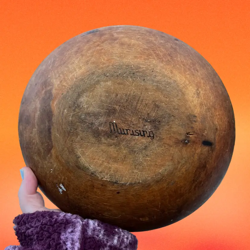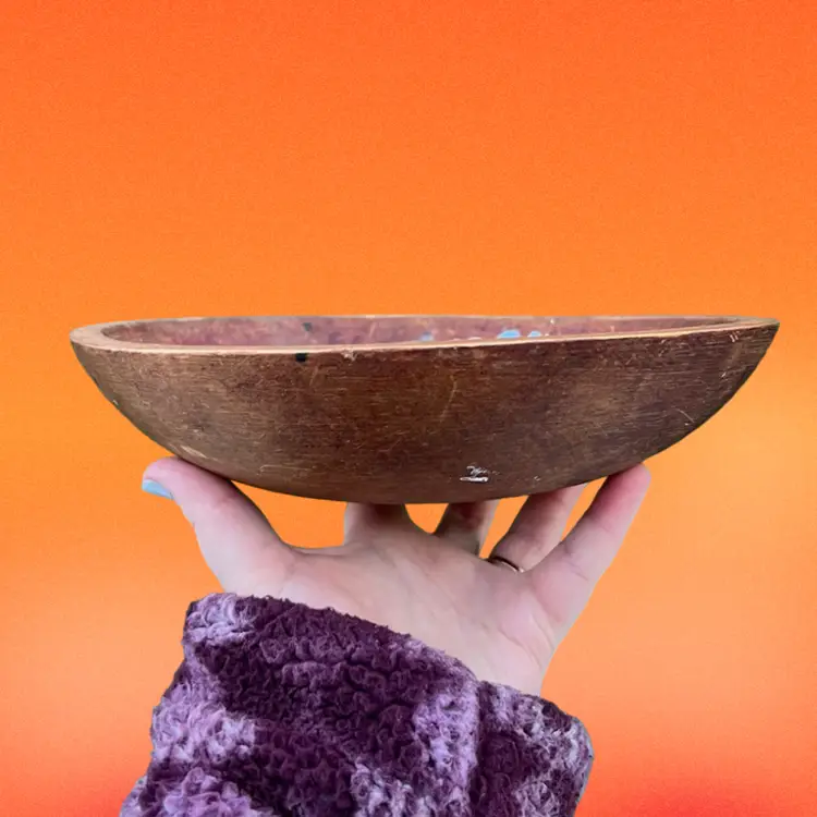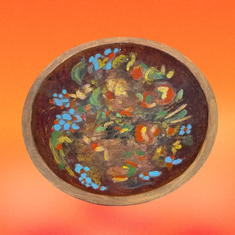 A really interesting dough bowl by munising. I couldn’t find any other painted like it, so it could be painted by a hobbyist. It certainly has some age and would be great for display, but not for food.