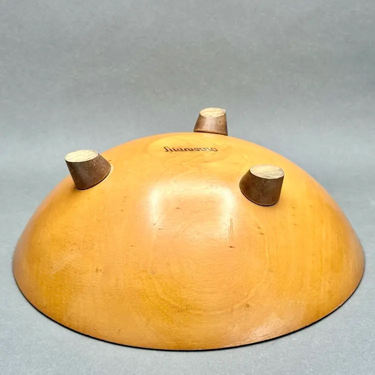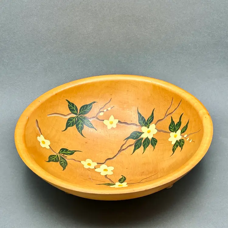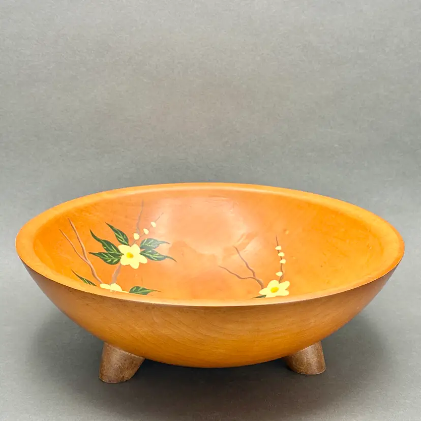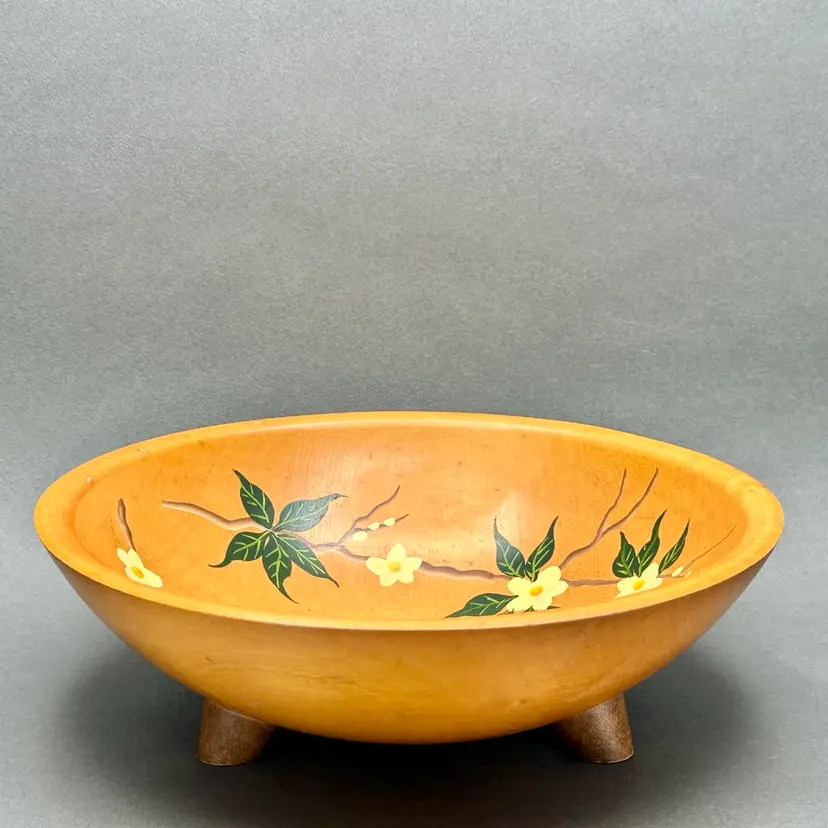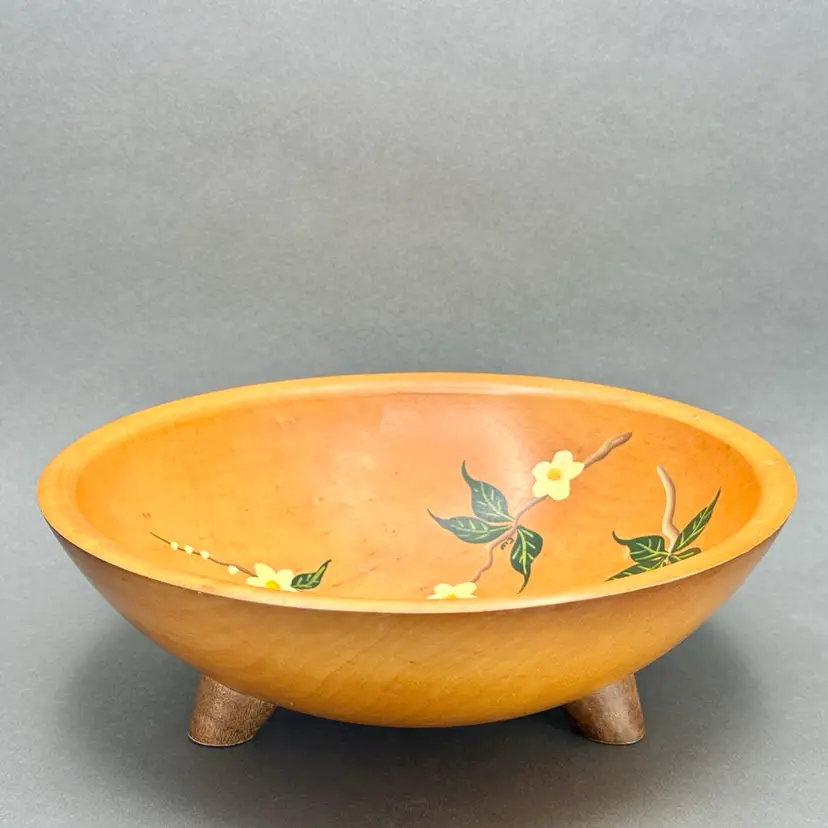 Vintage Munising Wood Products 3 footed wood serving/display bowl. Carved from a single piece of wood with hand painted white florals on vines. This bowl showcases the distinctive quality and rustic appeal of Munising Wood Products, which operated in Michigan's Upper Peninsula from 1911 to 1955.