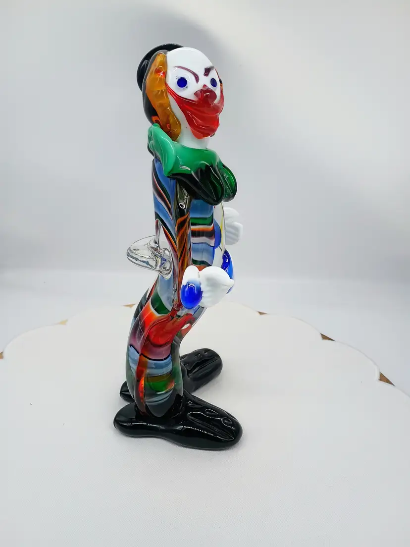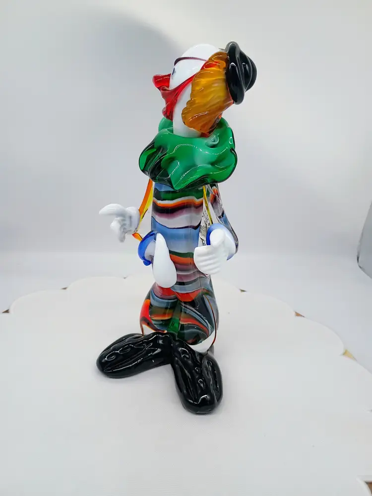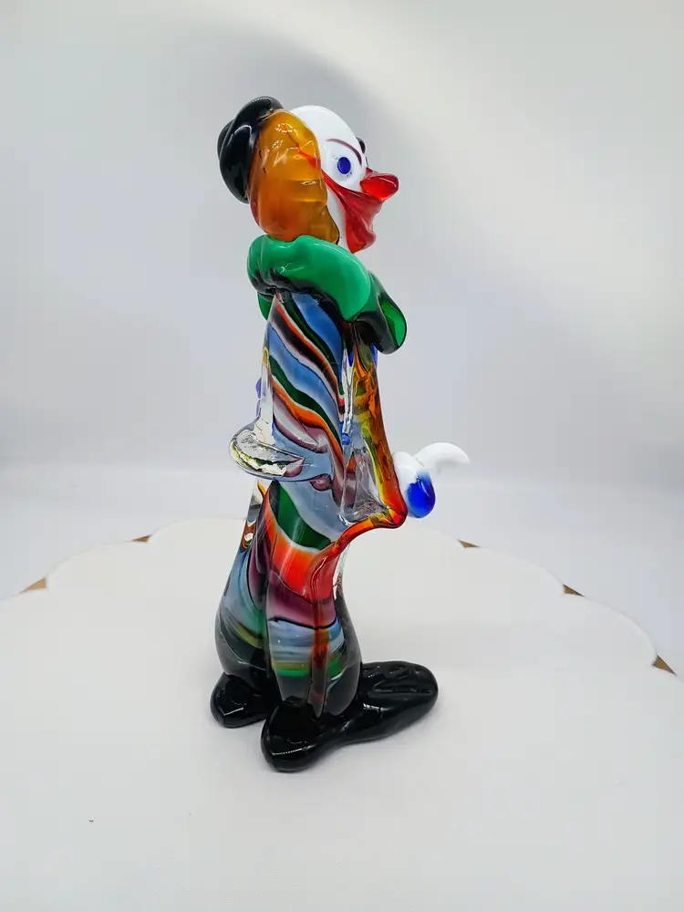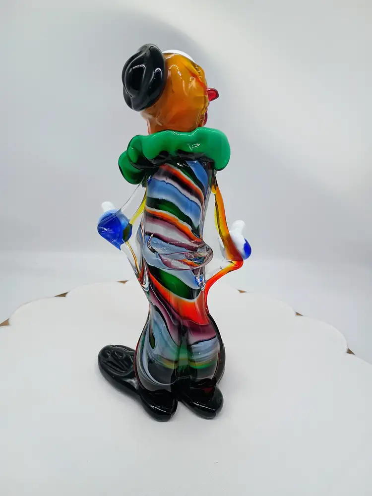 Vintage Murano 10.5 Inch Tall Art Glass Colorful Clown Figurine Sculpture. 10.5 inches tall 5 inches side to side and 4.25 inches front to back. This is preowned, No Chips cracks or flea bites found. Uncommon position with head turned looking over shoulder. Uncommon facial expression. Unsigned. This had a partial red and gold foil sticker but it came off during cleaning. There is some cadmium in this piece and most of the orange colored glass glows under UV light. Excellent condition. Ships USPS domestically and UPS/ USPS International Shipping globally.