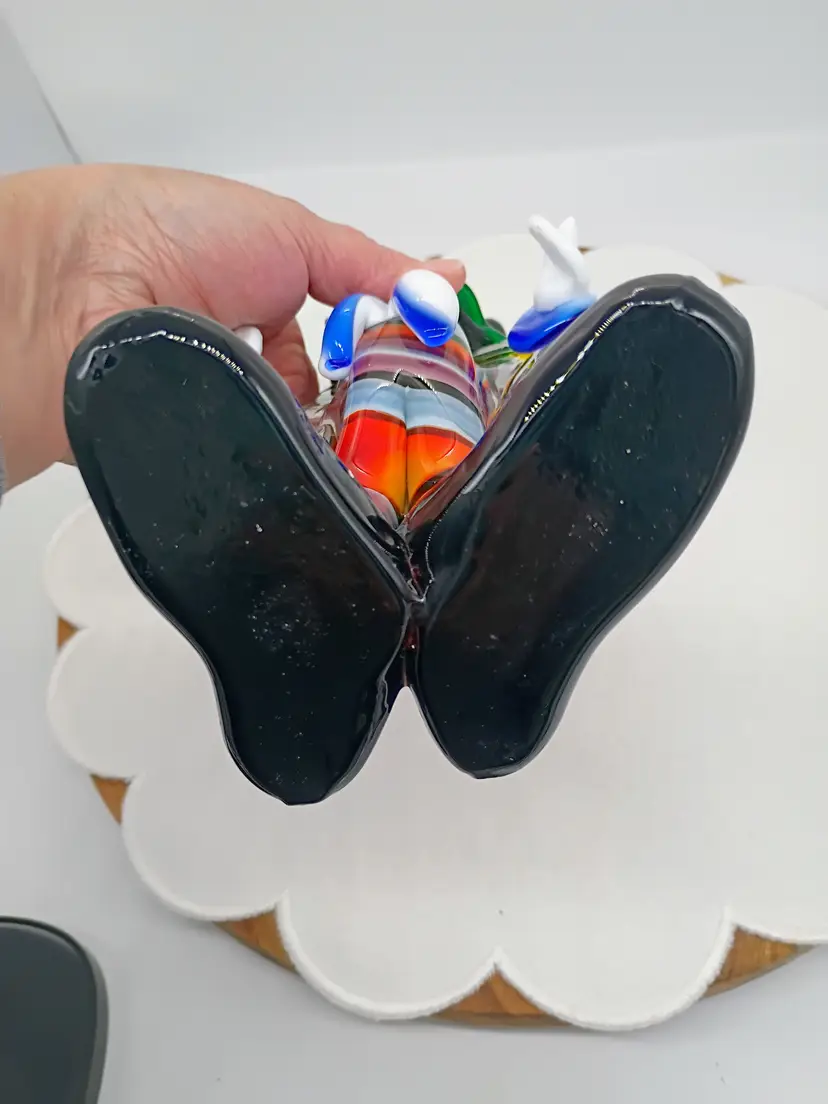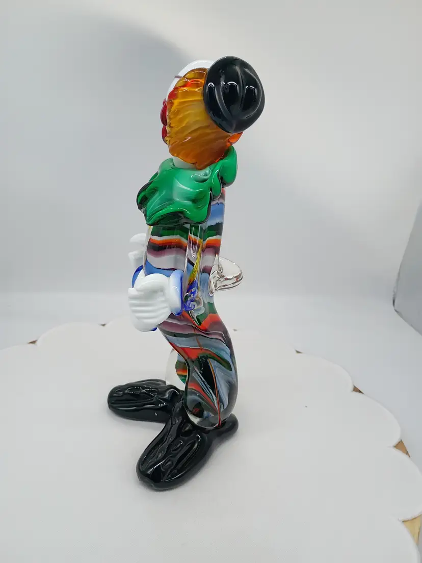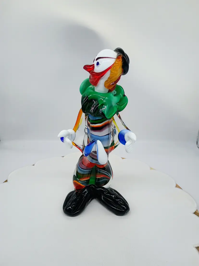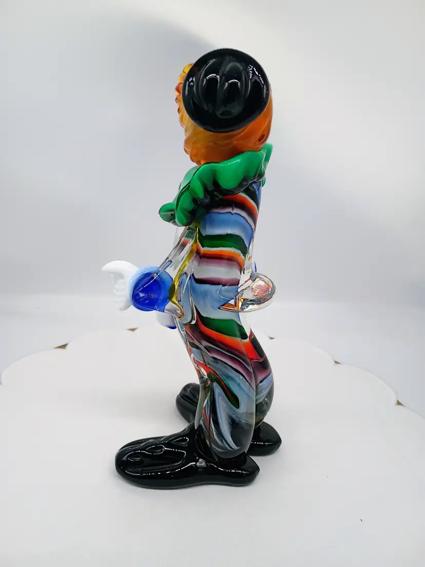 Vintage Murano 10.5 Inch Tall Art Glass Colorful Clown Figurine Sculpture. 10.5 inches tall 5 inches side to side and 4.25 inches front to back. This is preowned, No Chips cracks or flea bites found. Uncommon position with head turned looking over shoulder. Uncommon facial expression. Unsigned. This had a partial red and gold foil sticker but it came off during cleaning. There is some cadmium in this piece and most of the orange colored glass glows under UV light. Excellent condition. Ships USPS domestically and UPS/ USPS International Shipping globally.