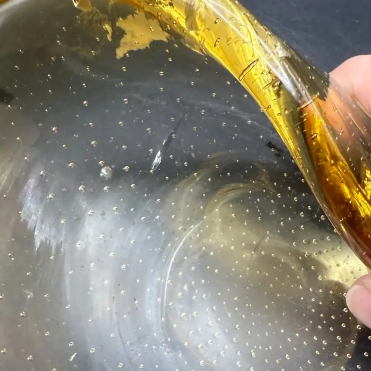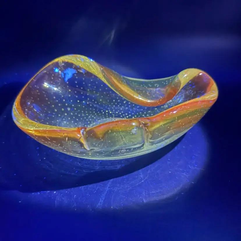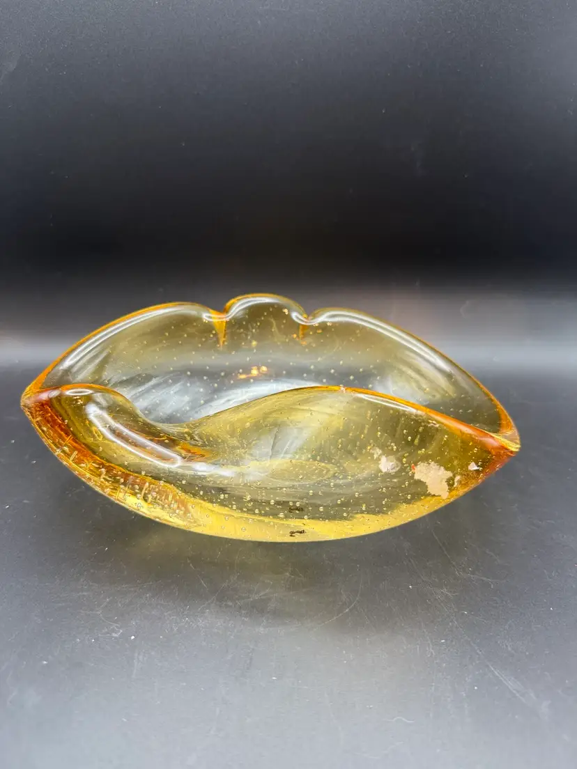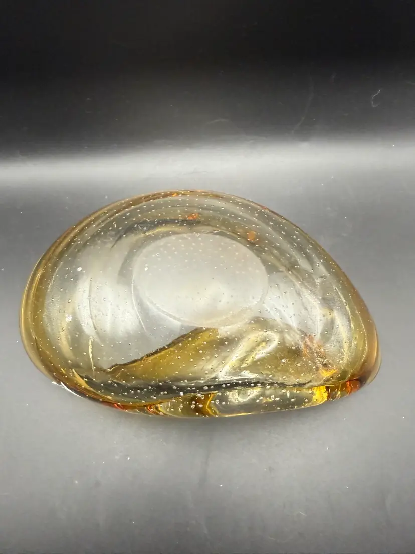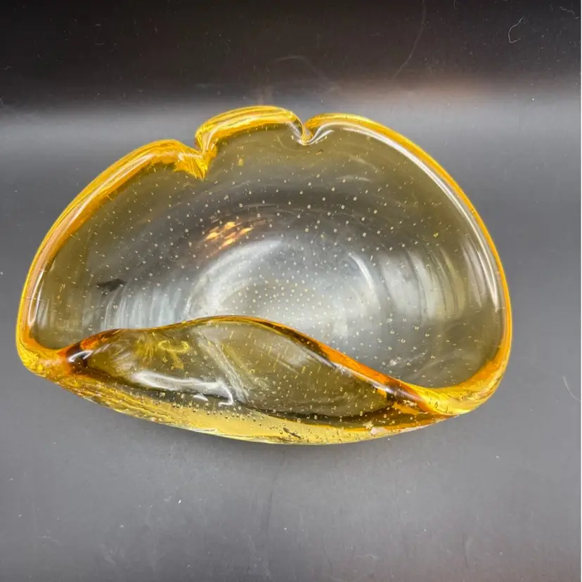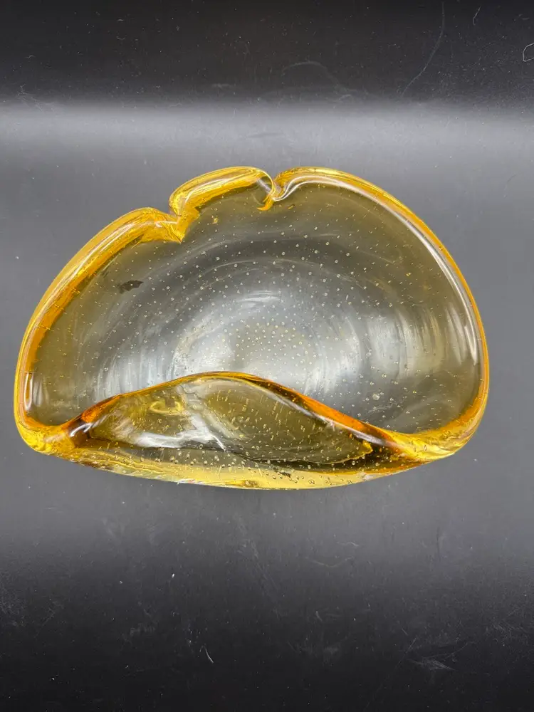 This piece is from the 1950s. This particular piece showcases the 'bullicante' technique, characterized by controlled bubbles trapped within the glass, creating a unique visual texture and depth. The use of amber hues and potential gold leaf inclusions further exemplifies the artistic flair and craftsmanship associated with Murano glass from the mid-20th century, often produced as decorative art pieces or functional items like ashtrays. Note: small internal flaw