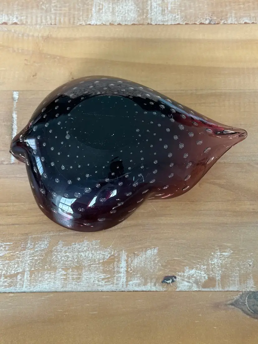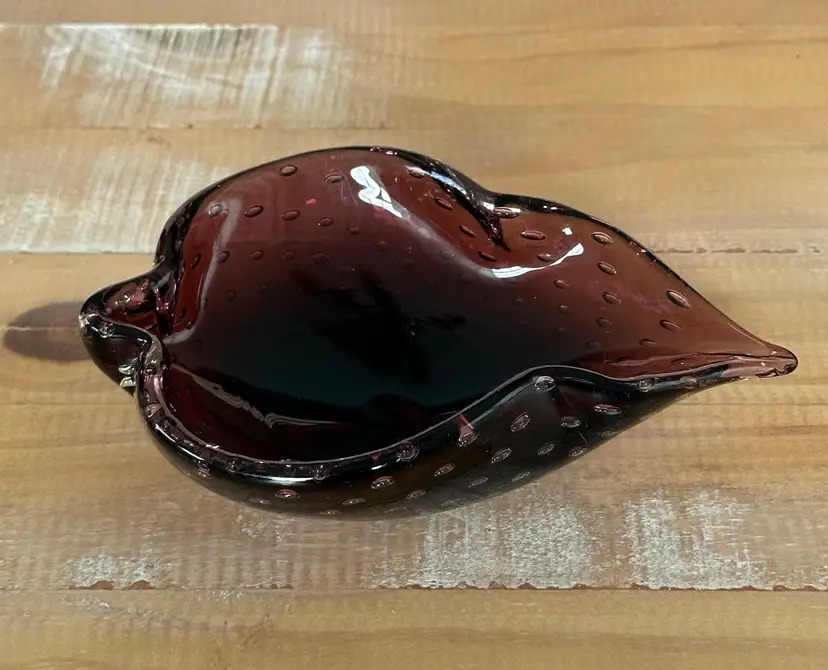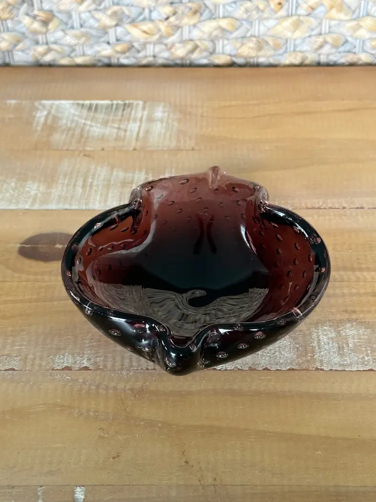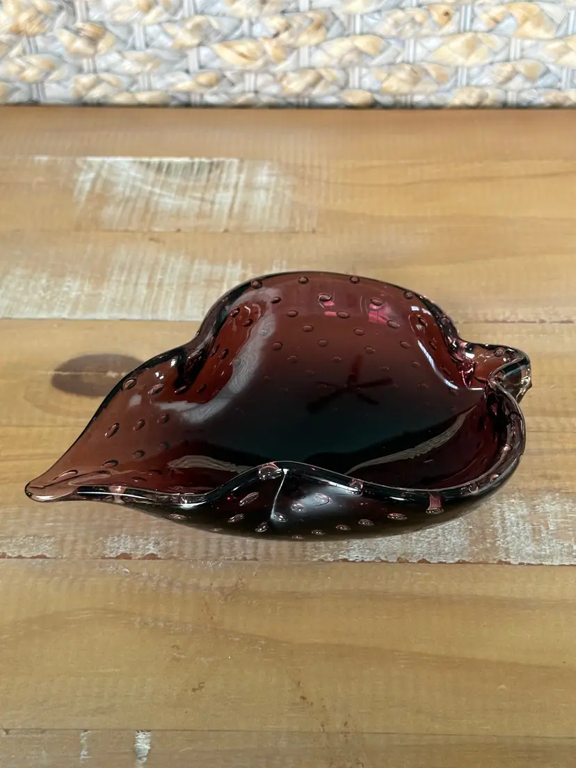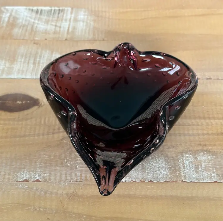This vintage Murano? amethyst bullicante in a cased art glass cigar ashtray candy bowl is a stunning decorative piece that adds a touch of elegance to any space. Handmade and featuring intricate art glass production, this purple glass bowl exudes a unique charm and style. With its craftsmanship and vintage appeal, it is a standout addition to any collection of decorative bowls or unique glass pieces. Its dimensions of 7" in length, 5.25" in width, and 1.75" in height make it a versatile and eye-catching item for display.