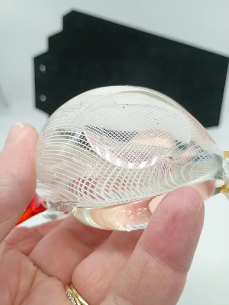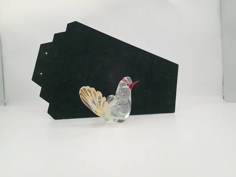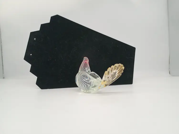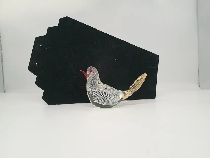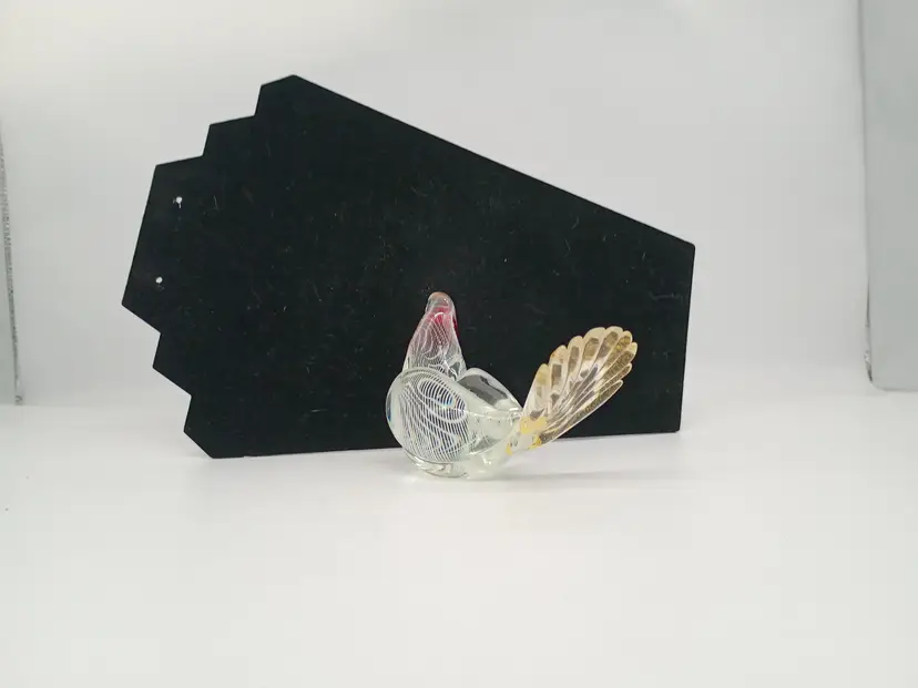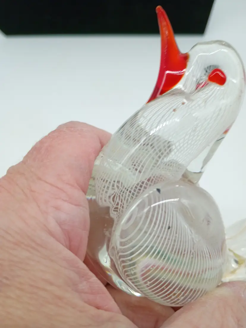 Vintage Murano Art Glass Bird White Latticinio and Gold Aventurine Tail with Red beak and eyes.. This is 5 inches long, 3 inches tall and 2.25 inches wide. Clear polished pontil. This is preowned, There are no chips cracks or flea bites. On one side there is a ash piece in the glass it's tiny near the ash piece there is a tiny area that isn't completely fire polished. This is probably a second due to the imperfection of the ash. It really doesn't photograph well but you can feel it look at last photo.( its about the size of a pencil eraser). This is unsigned . Still displayable and overall in VG condition. Ships USPS domestically and USPS International Shipping globally