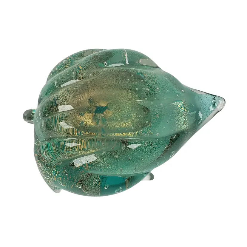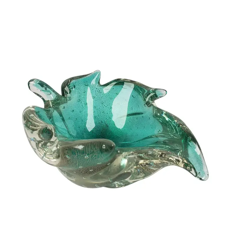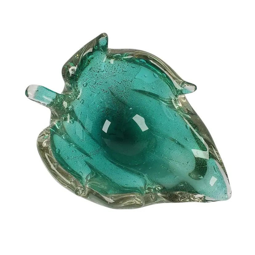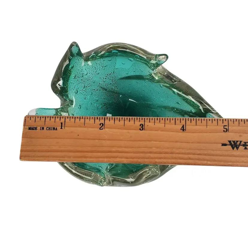 Vintage Murano Art Glass Leaf shape pin dish / bowl Thick, heavy glass Hand blown Bullicante, controlled bubbles Gold aventurine Clear to aquamarine green sommerso 5 3/8: long X 3 3/4" wide X 2 1/4" tall Actual weight - 1 pound 1 ounce Offering as found at in Augsburg, Bavaria, Germany Condition - No chips, nicks, cracks or scratches. See photos.