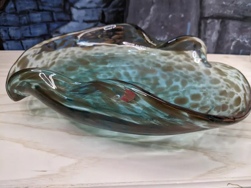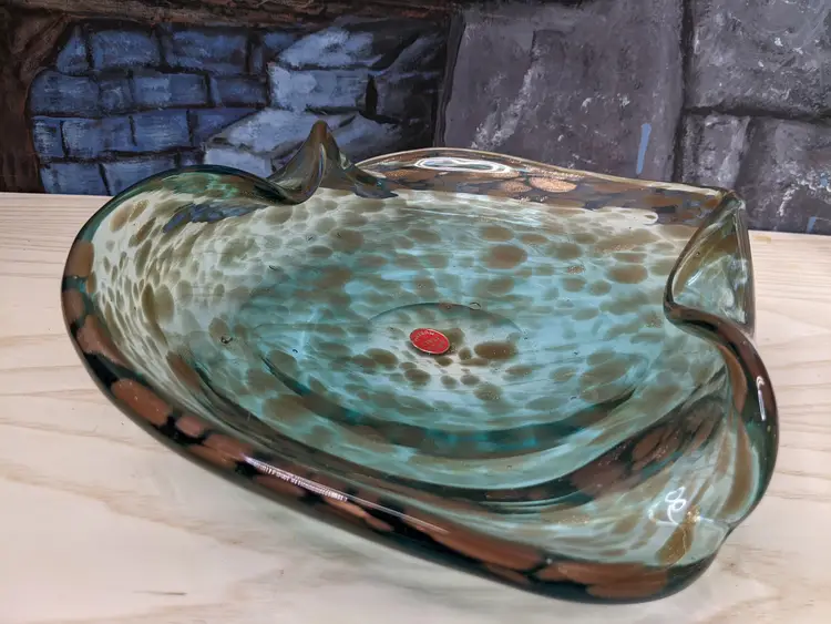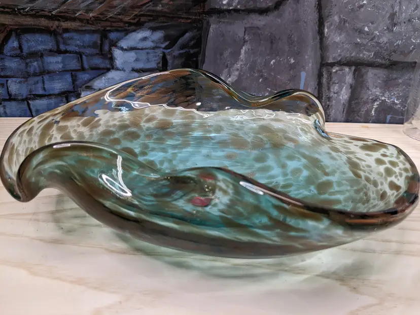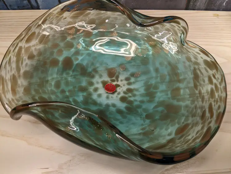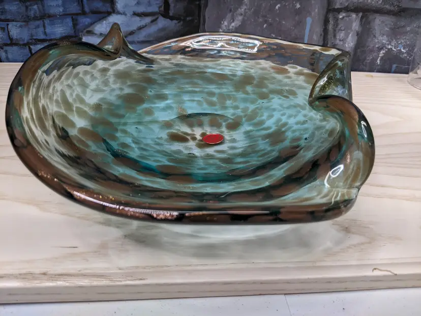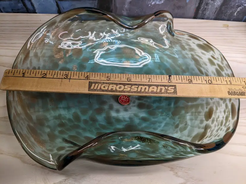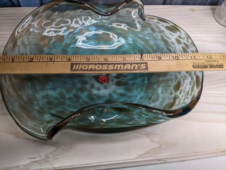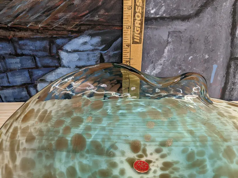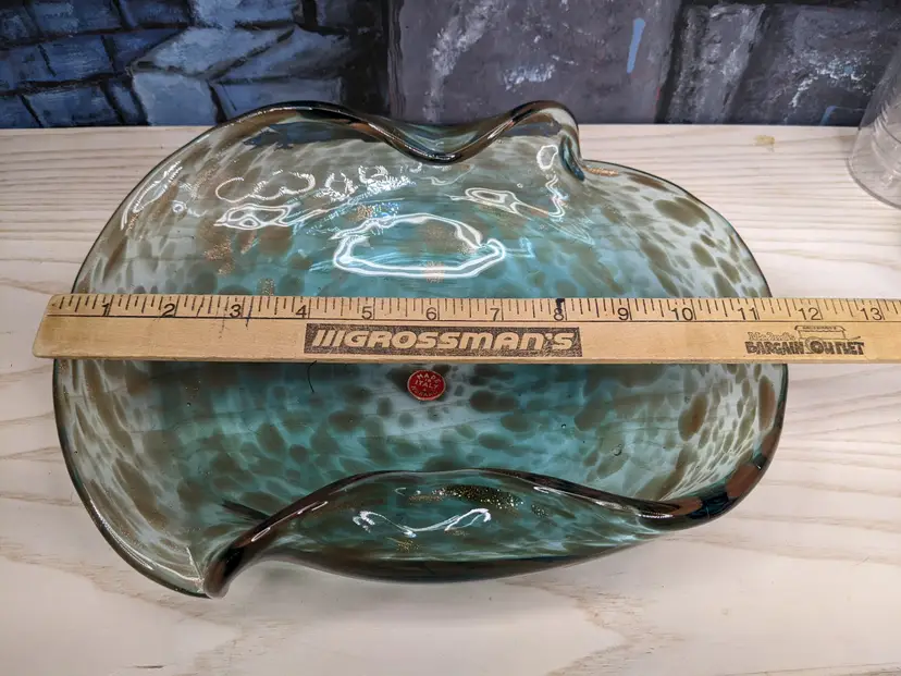 Vintage Murano Art Glass Mid Century Moden AVEM Has a Teal blue base color with Gold copper Aventurine .Made in the Wave shape Dish Bowl perfect Centerpiece. It is 11.5"long 8 1/2 in wide and 3in tall . It has the red and gold Murano made in Italy Label Tag . It has a clear smooth bottom . It is not signed Very good condition there is a small bit of bubbles in the glass a couple are on the surface . There are no cracks or chips . Beautiful piece of glass . Please check the photos for details. Comes from a smoke free home. It is very heavy glass.