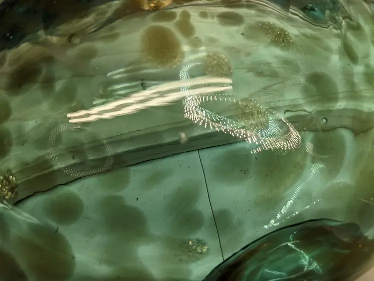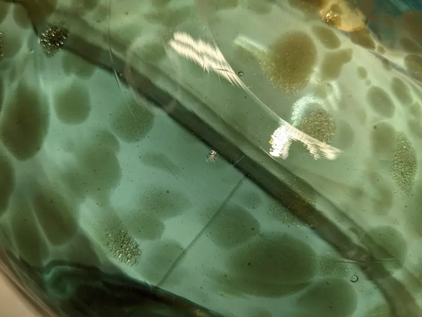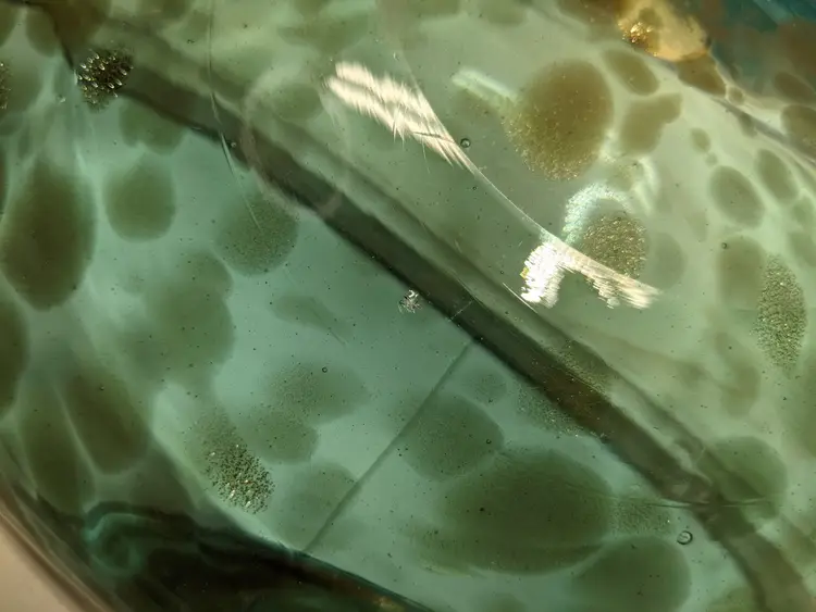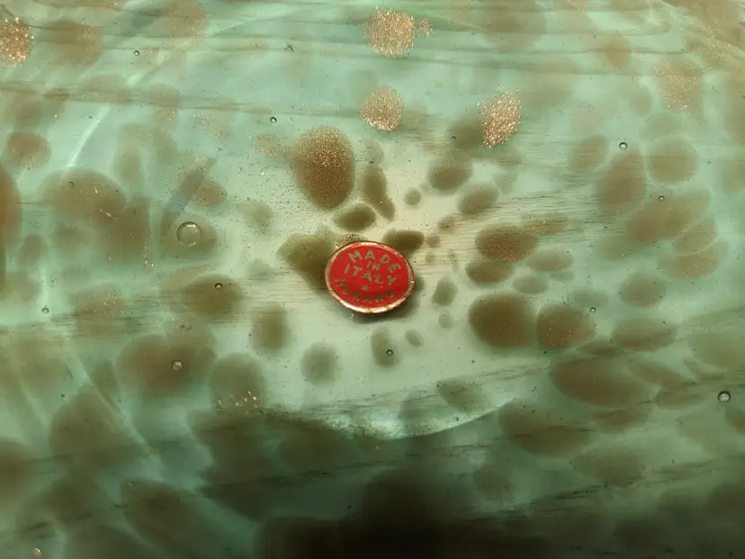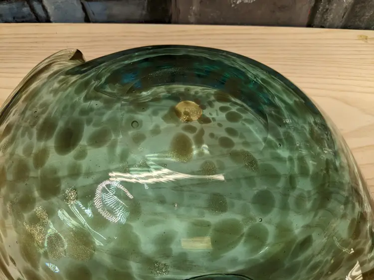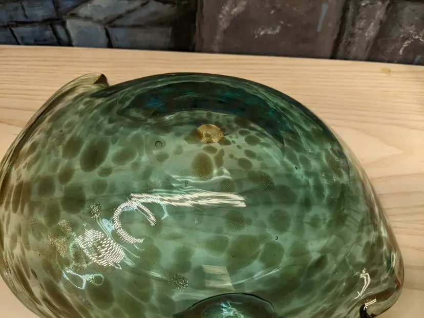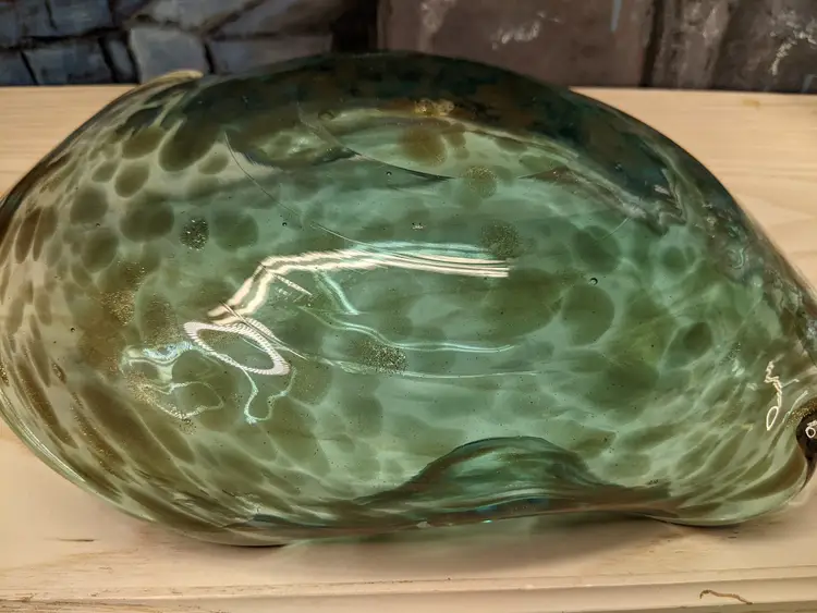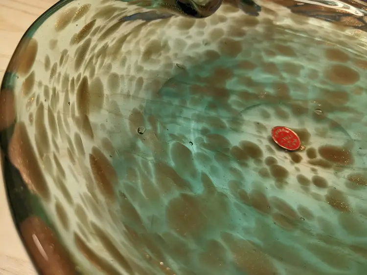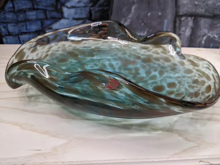 Vintage Murano Art Glass Mid Century Moden AVEM Has a Teal blue base color with Gold copper Aventurine .Made in the Wave shape Dish Bowl perfect Centerpiece. It is 11.5"long 8 1/2 in wide and 3in tall . It has the red and gold Murano made in Italy Label Tag . It has a clear smooth bottom . It is not signed Very good condition there is a small bit of bubbles in the glass a couple are on the surface . There are no cracks or chips . Beautiful piece of glass . Please check the photos for details. Comes from a smoke free home. It is very heavy glass.