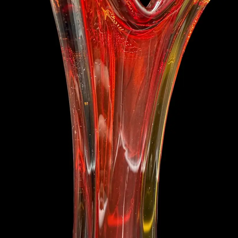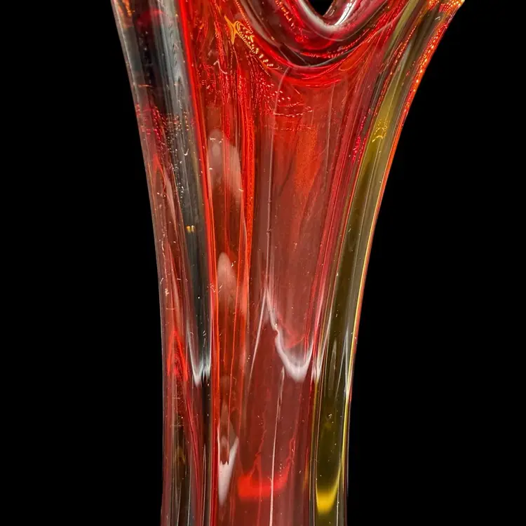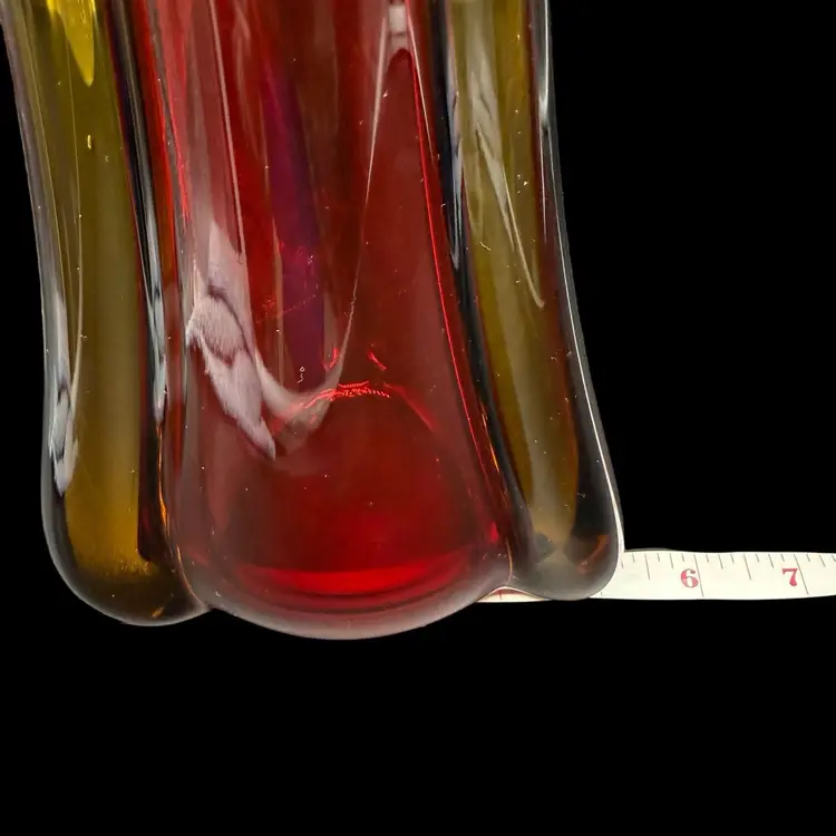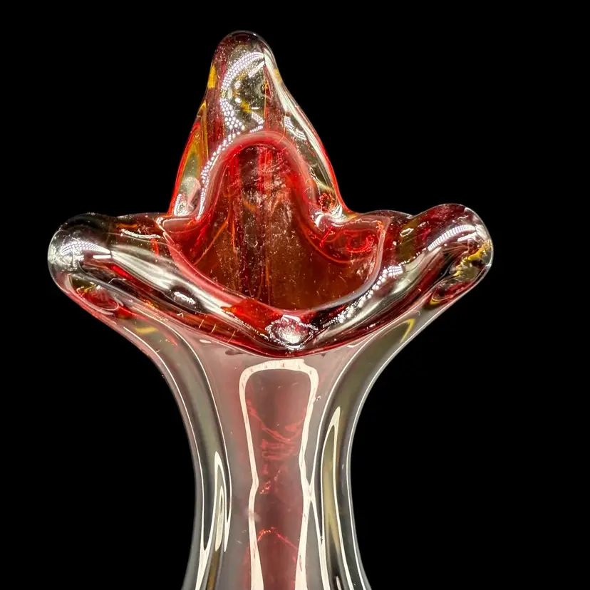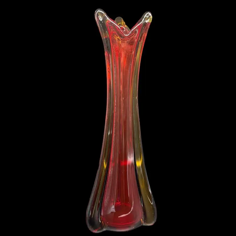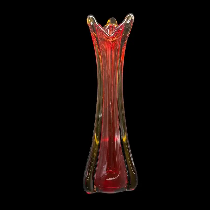 This vintage Murano art glass vase in crimson and amber Sommerso color is a stunning piece of Mid-Century Modern home decor. Handmade in Italy, this abstract art piece features a solid multicolor design, typical of the 1960s production style of Murano glass. Standing at 14.5 inches tall, this collectible vase is perfect for displaying flowers or as a standalone decorative item. With its unique Italian craftsmanship and artistic flair, this Murano vase is a must-have for any collector of vintage art glass.