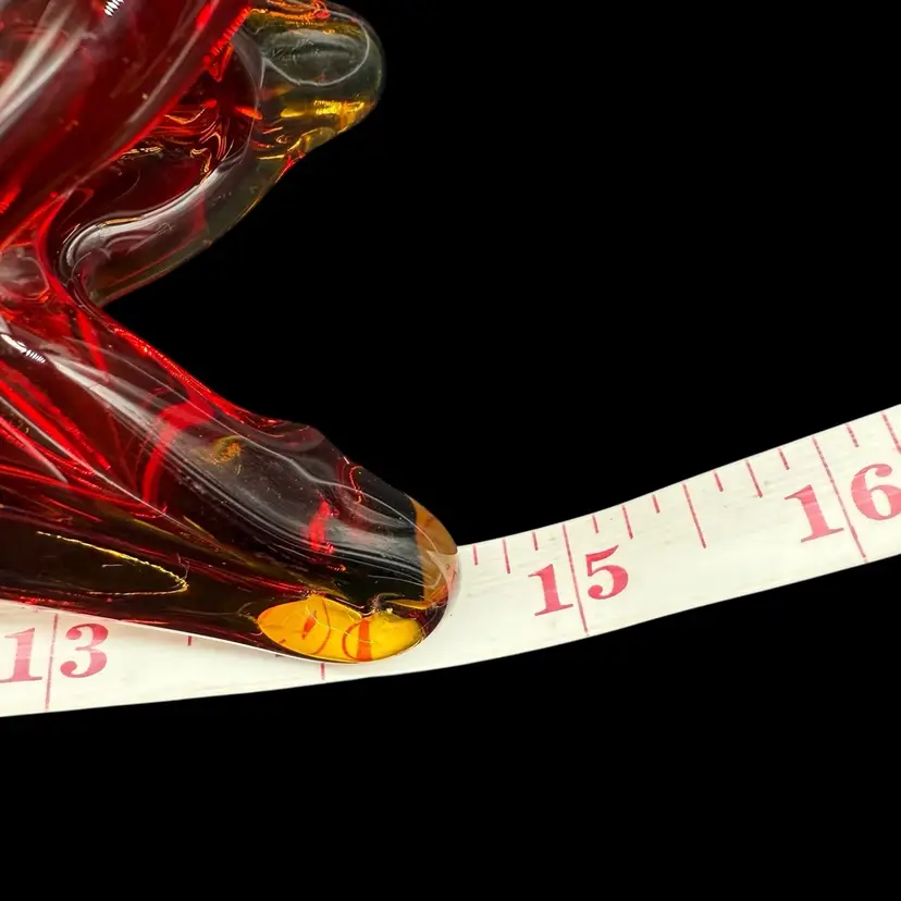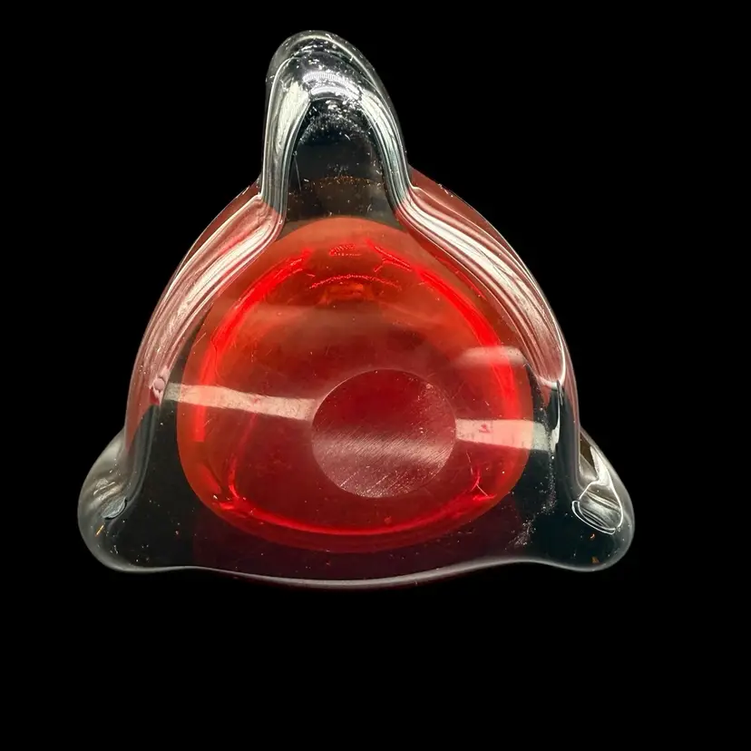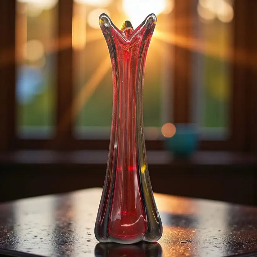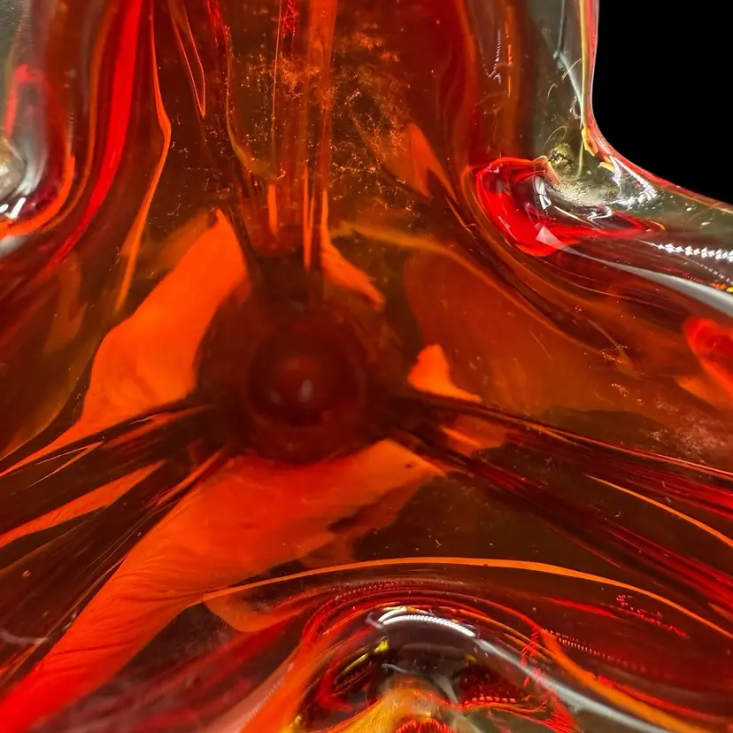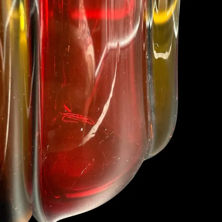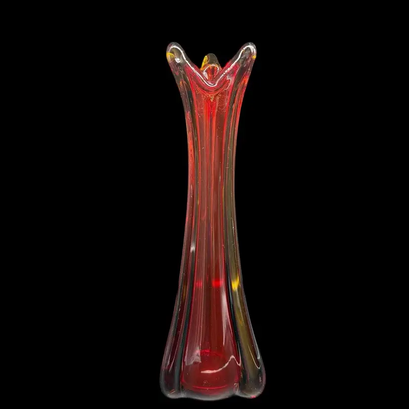 This vintage Murano art glass vase in crimson and amber Sommerso color is a stunning piece of Mid-Century Modern home decor. Handmade in Italy, this abstract art piece features a solid multicolor design, typical of the 1960s production style of Murano glass. Standing at 14.5 inches tall, this collectible vase is perfect for displaying flowers or as a standalone decorative item. With its unique Italian craftsmanship and artistic flair, this Murano vase is a must-have for any collector of vintage art glass.