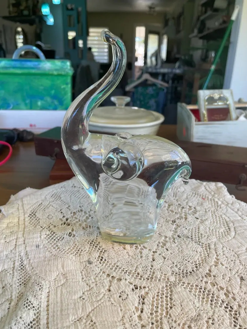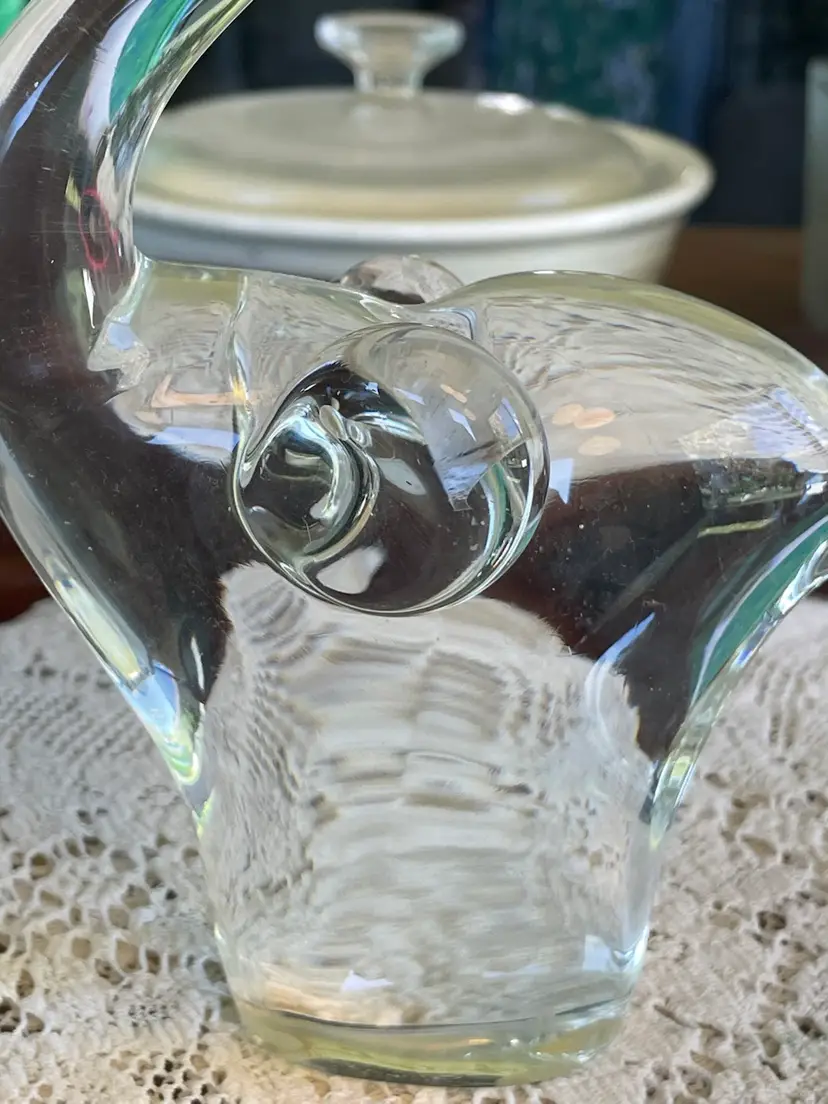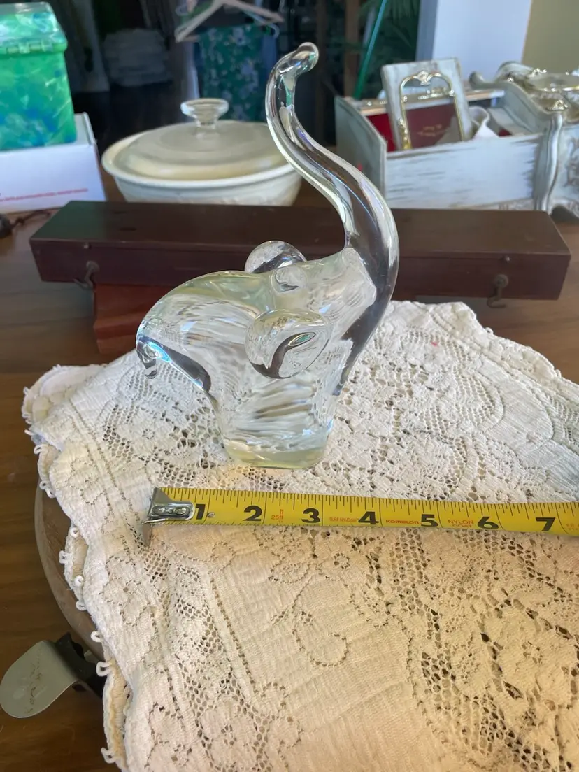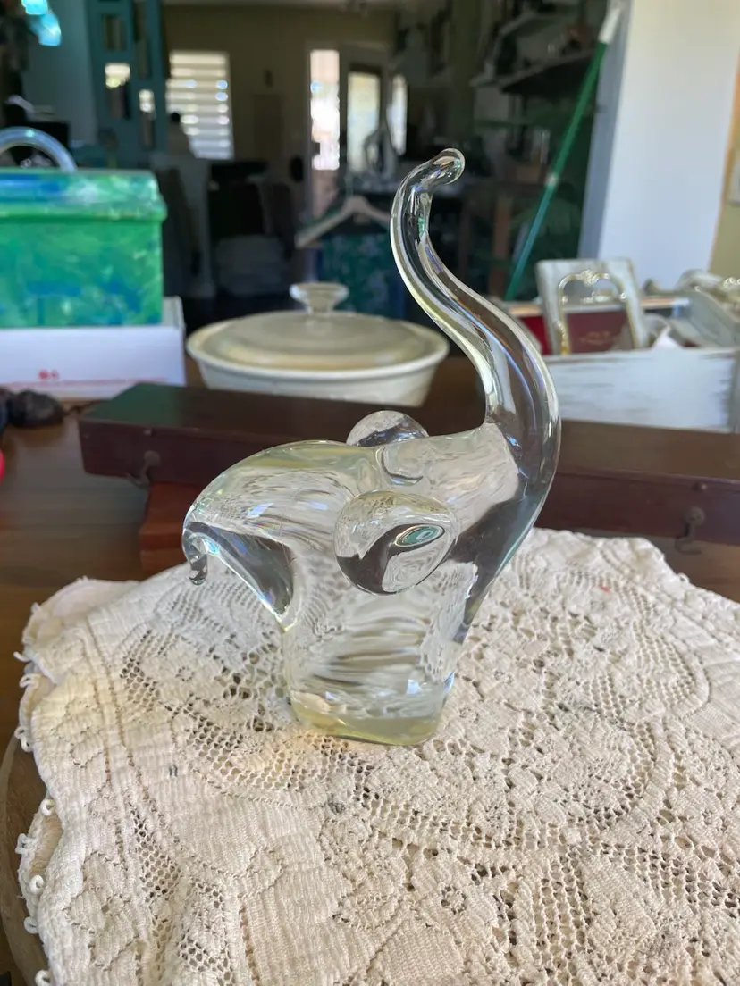 This is a vintage Murano art glass elephant sculpture, likely signed by Licio Zanetti. The sculpture is made of clear, hand-blown glass with a stylized depiction of an elephant with its trunk raised. It is a piece of Italian art glass from the 1980s.