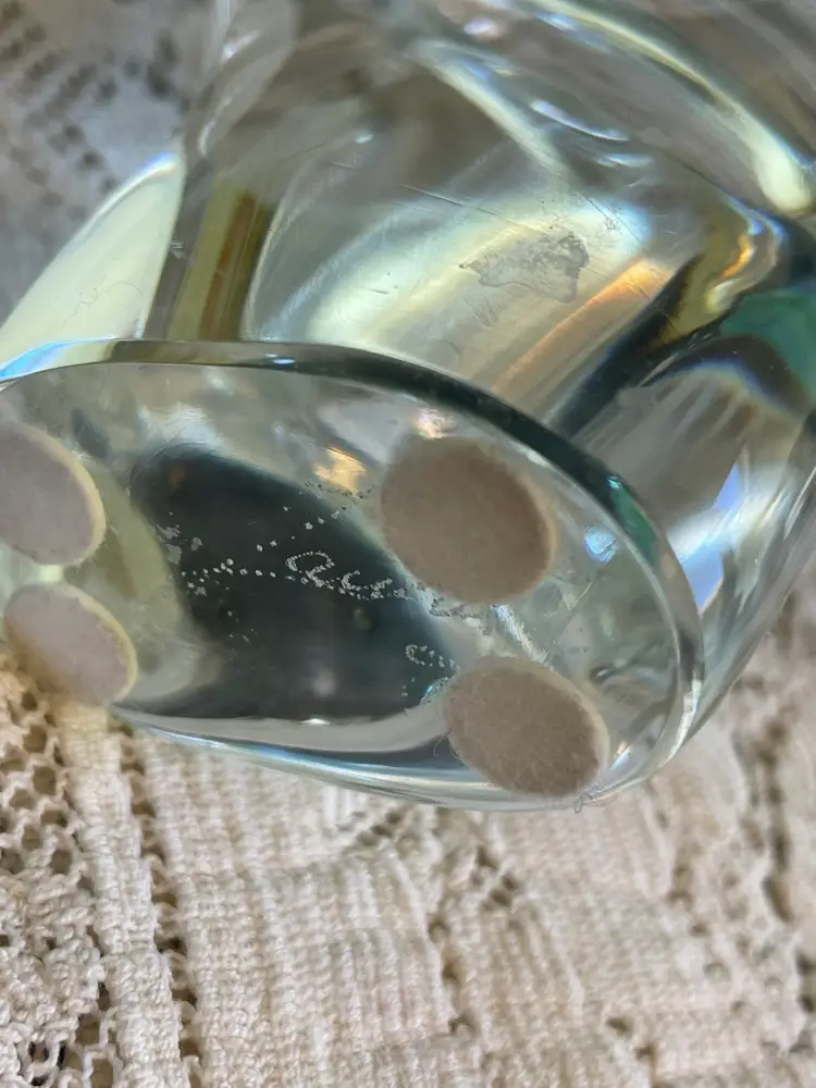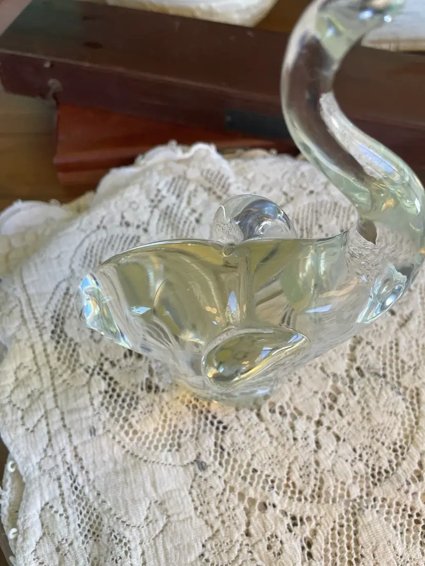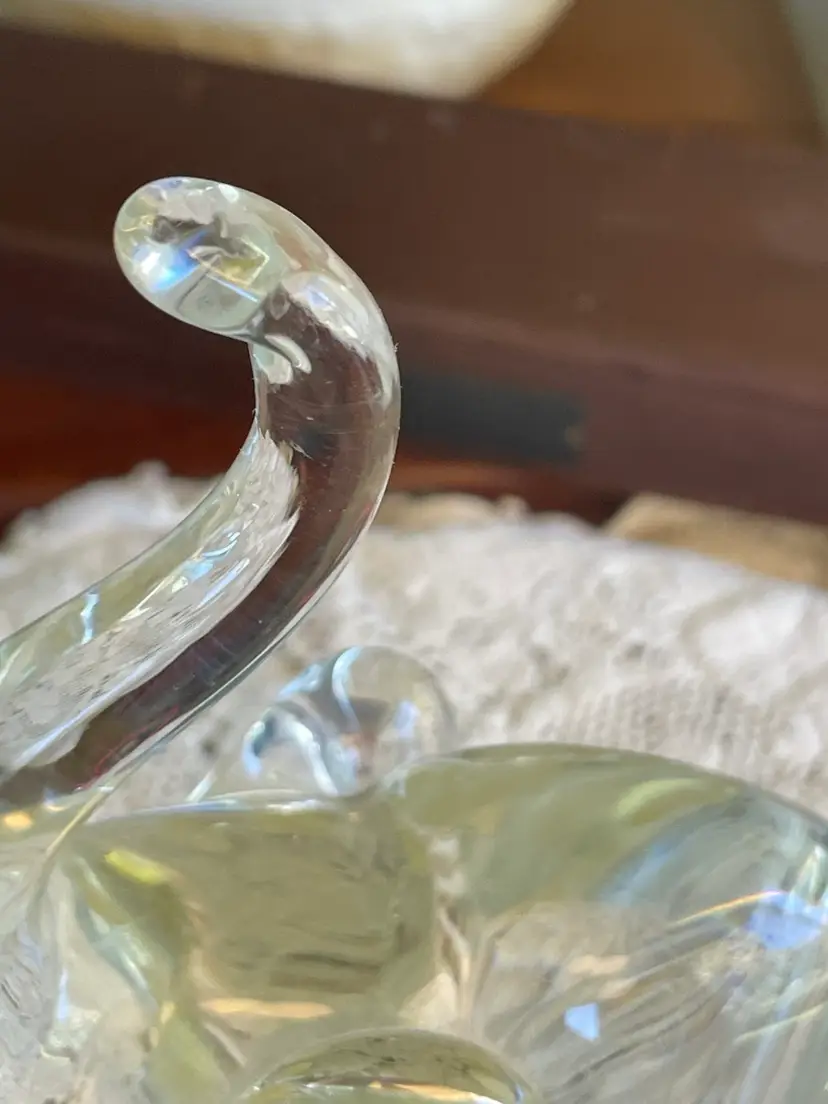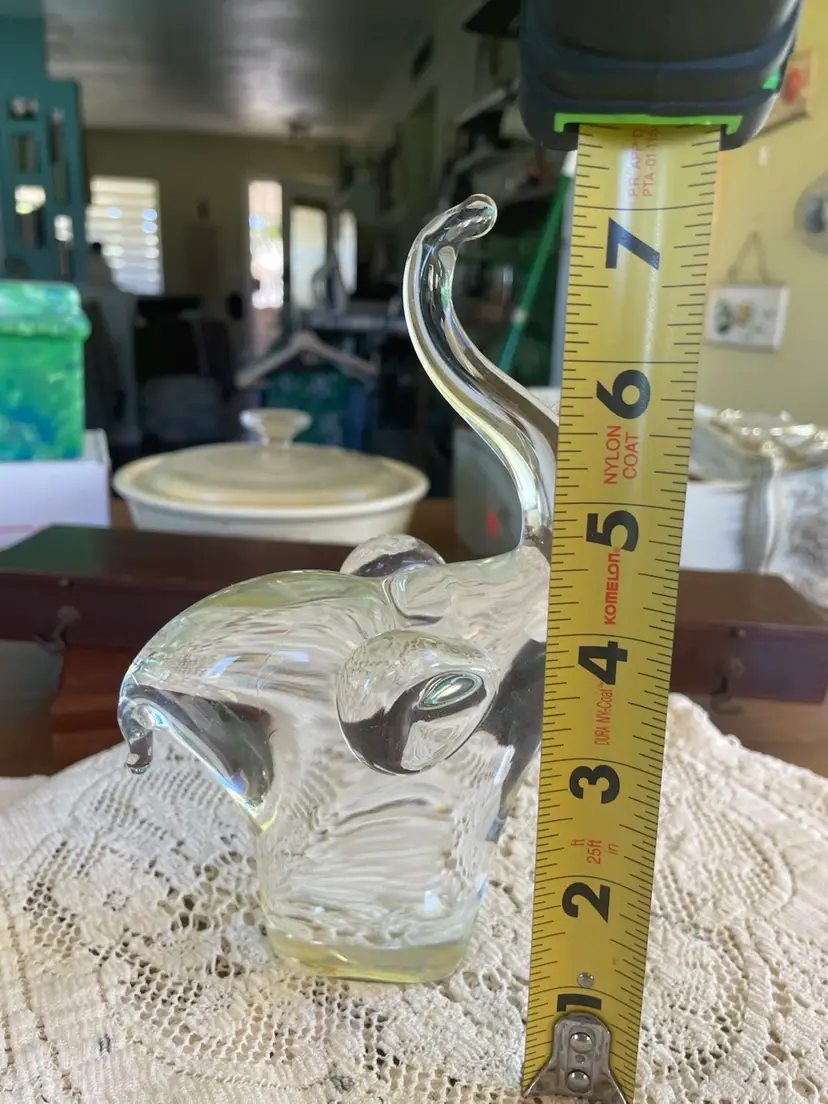 This is a vintage Murano art glass elephant sculpture, likely signed by Licio Zanetti. The sculpture is made of clear, hand-blown glass with a stylized depiction of an elephant with its trunk raised. It is a piece of Italian art glass from the 1980s.