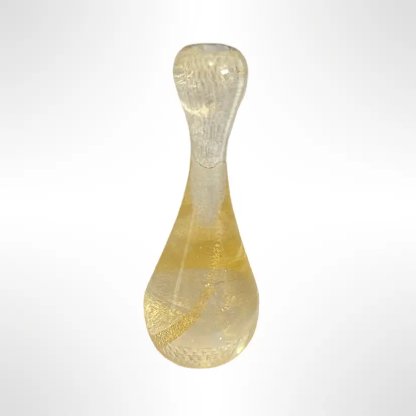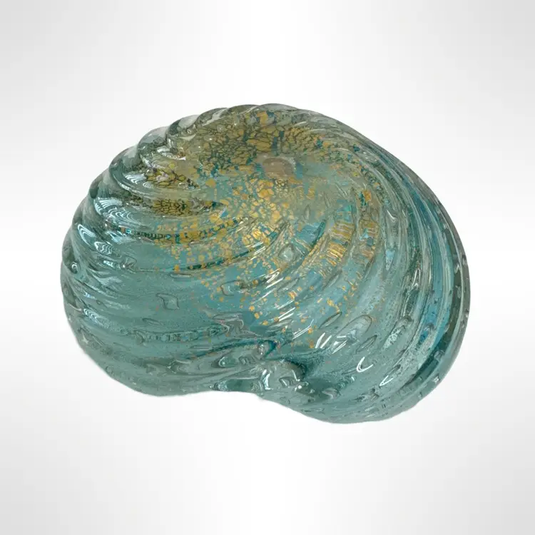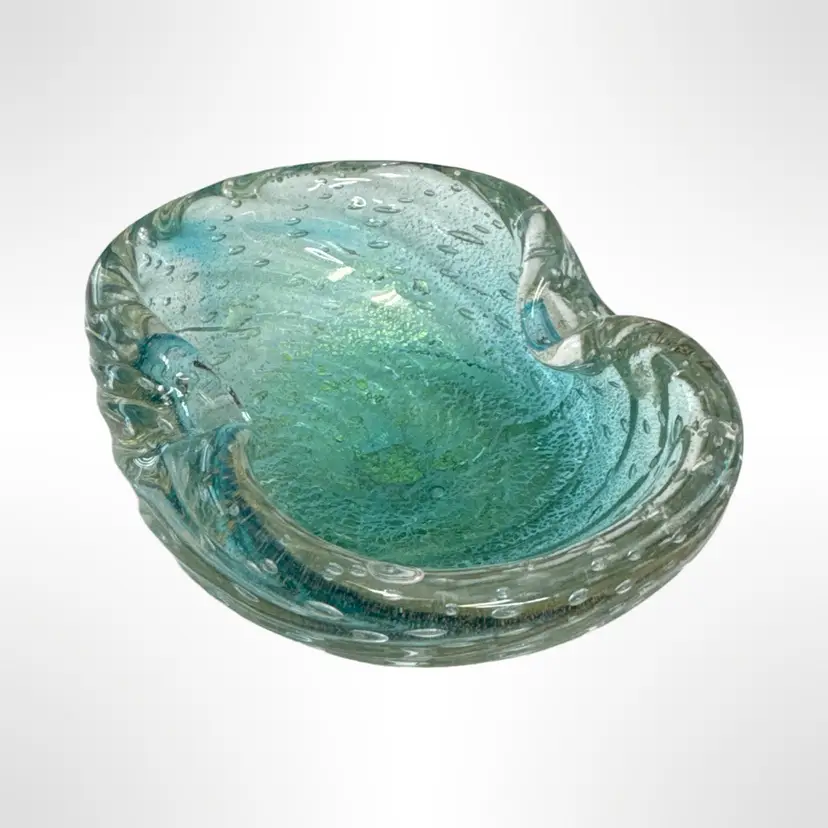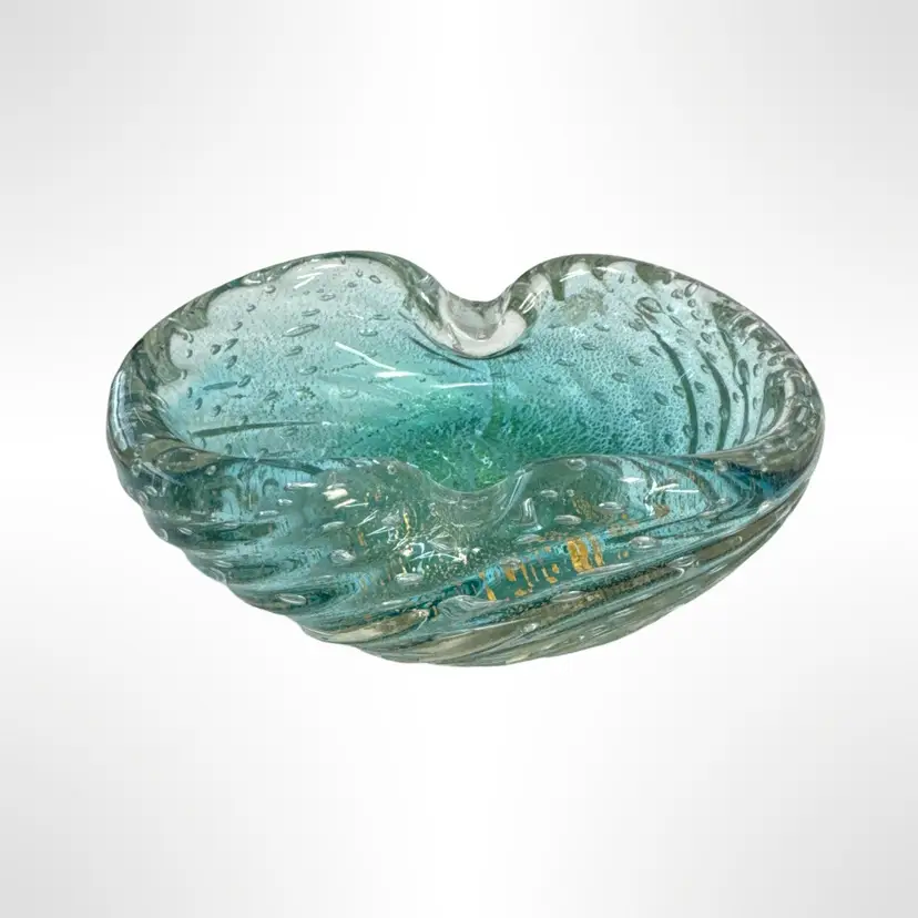 Beautiful vintage Murano art glass ashtray and cigar stubber set. The ashtray is clear swirled with a light blue and gold flecks, and the stubber is clear with gold swirl. Both are in excellent condition with no chips, cracks, or other damage. The ashtray measures approximately 5” x 4” x 2”.
