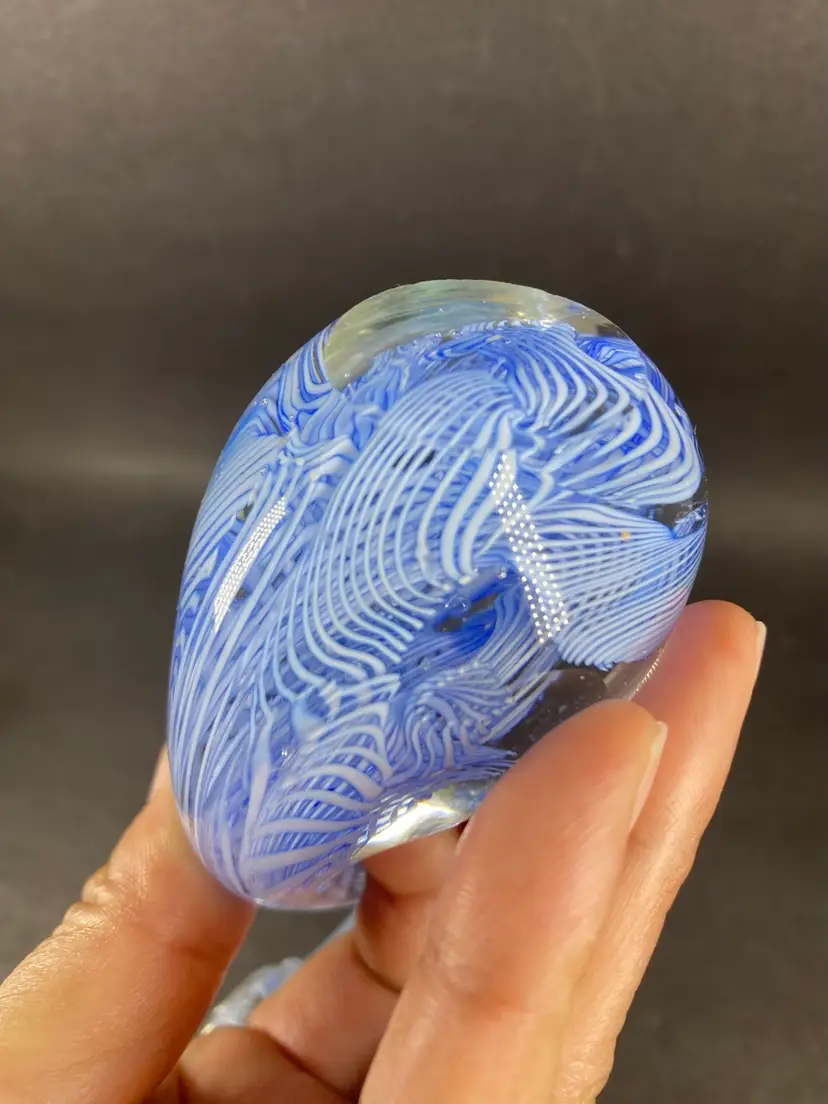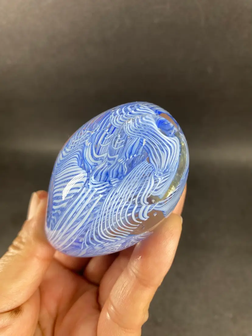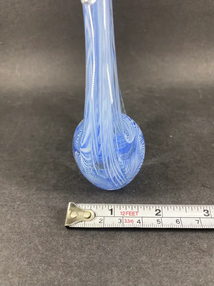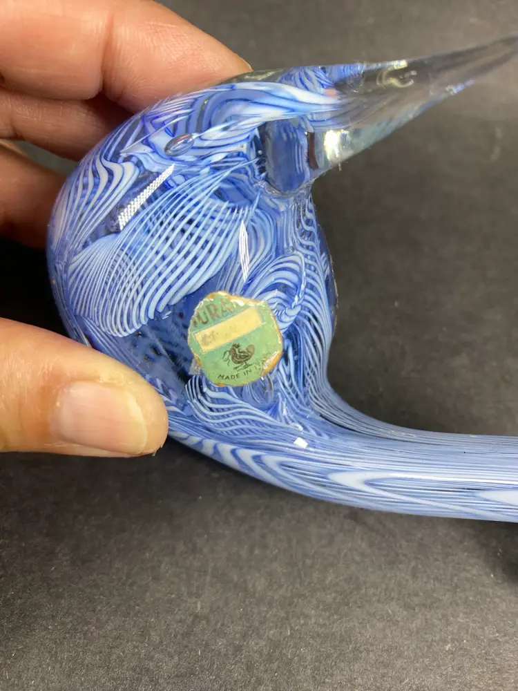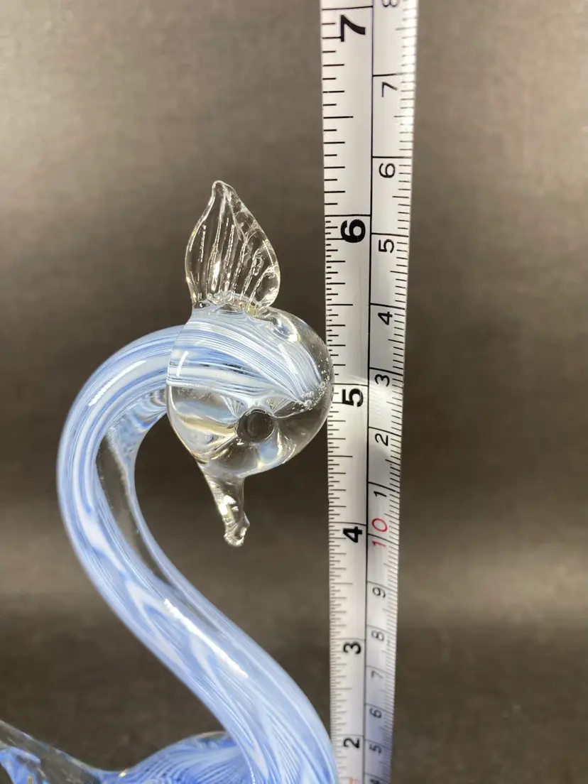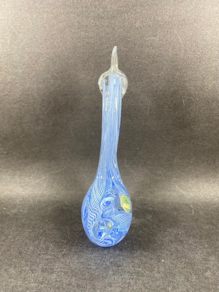 This vintage Murano Glass Blue Latticino Swan Figurine is a handmade piece of art glass originating from Venice, Italy. The figurine features a intricate hand-blown craftsmanship, showcasing the signature Murano brand. The blue color and decorative subject of a swan make it a unique and collectible piece for any pottery and glassware enthusiast. Perfect for adding a touch of elegance to any space, this original figurine is a beautiful representation of traditional glassmaking techniques.