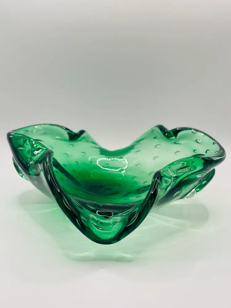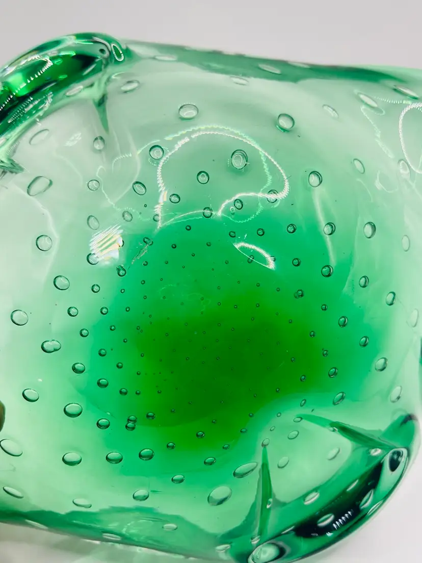 This is a beautiful piece! Vintage Murano green glass bowl. This has a beautifully polished bottom, and the controlled bubble throughout. This stands 2 inches tall and is 8 inches across. There are no chips or cracks, there is a scratch on the edge of the bottom that can be seen in the last photo.