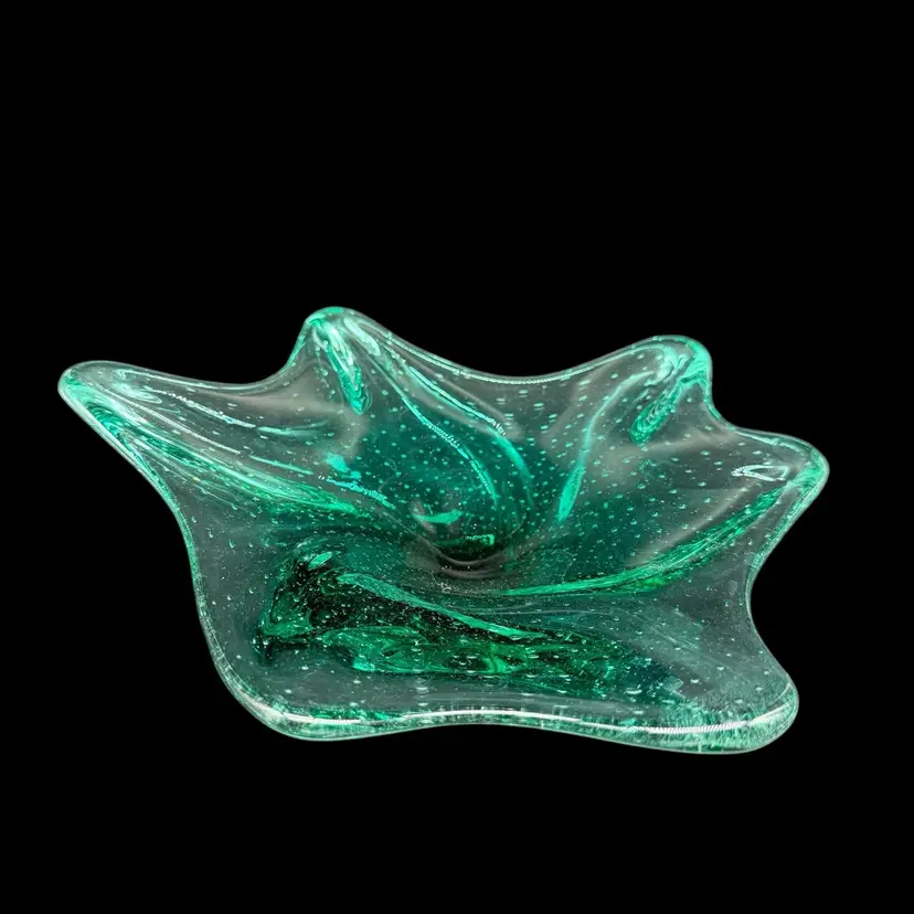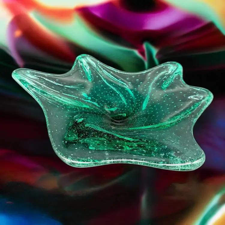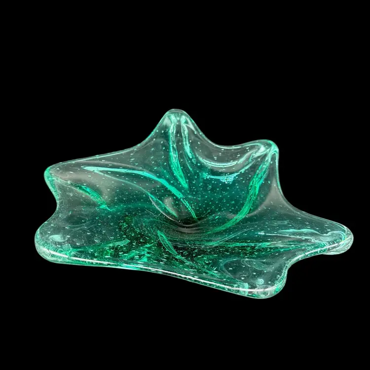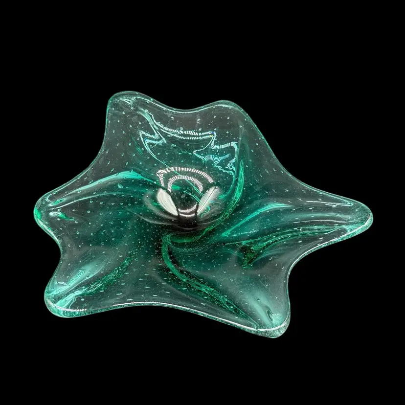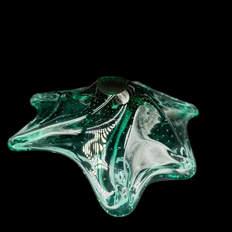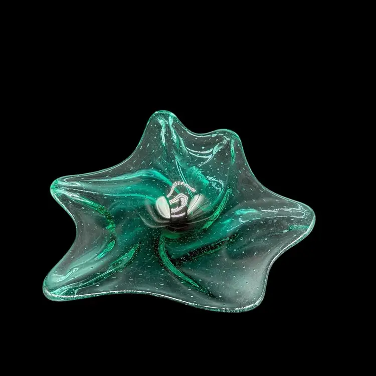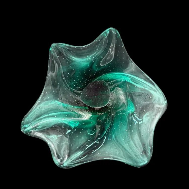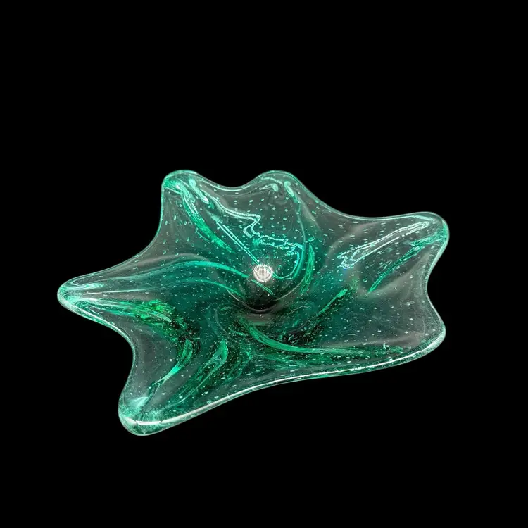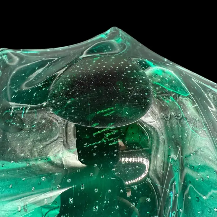 This Vintage Murano Hand Blown Art Glass Free Form Bowl is a unique and beautiful piece of Italian glass art. Handmade in Italy, this green bowl features a solid pattern with controlled bubbles, creating an abstract and artistic shape. Perfect for all occasions, this decorative bowl is one of a kind, showcasing the intricate craftsmanship and artistic flair of Murano glassmaking. This piece is a stunning addition to any home decor or collection.