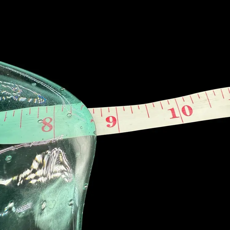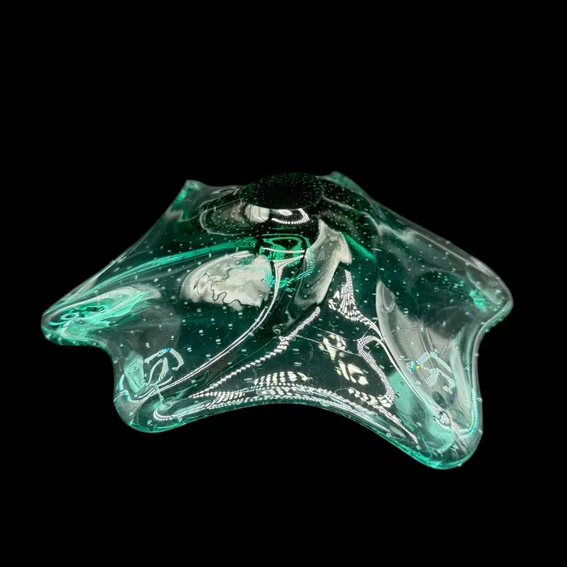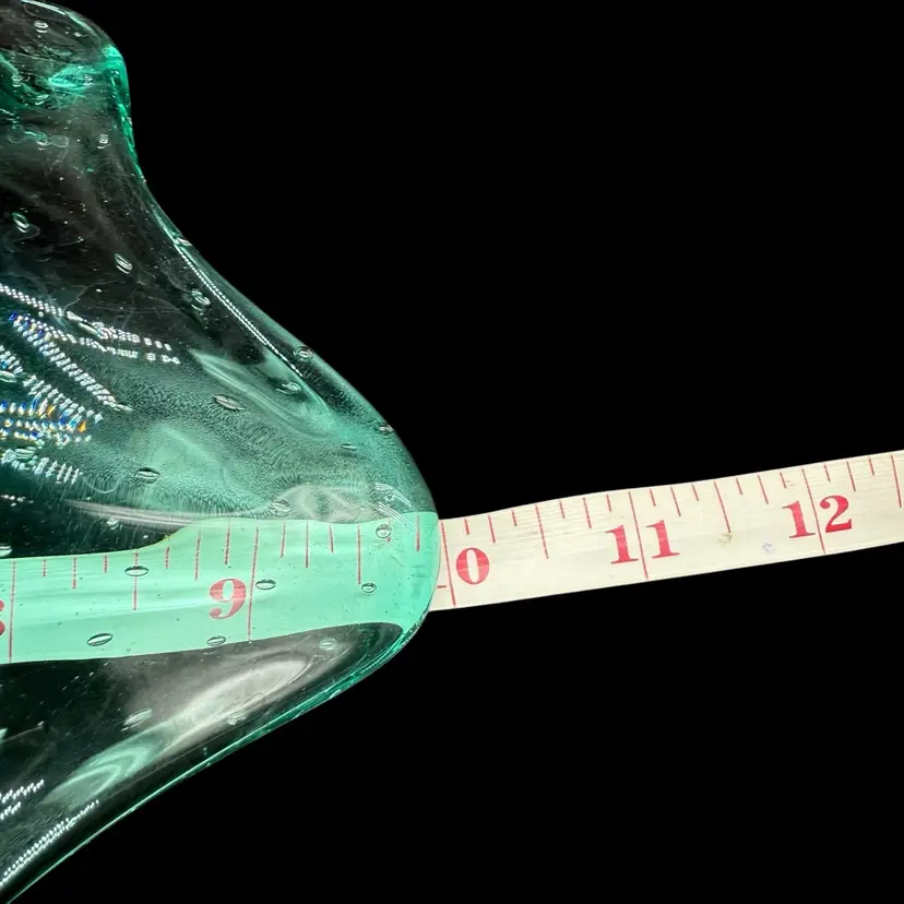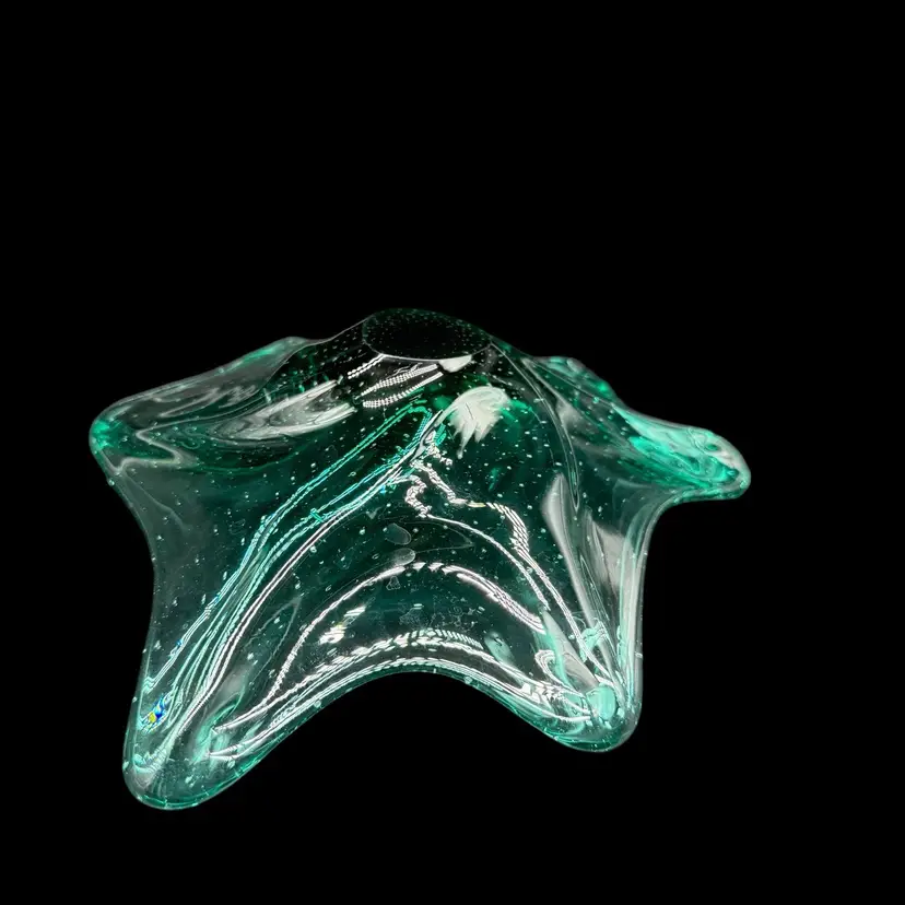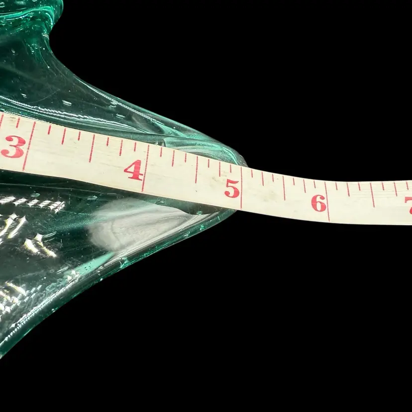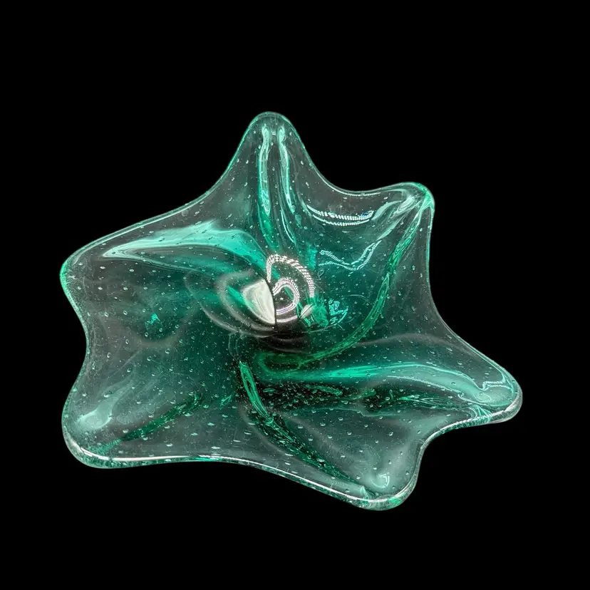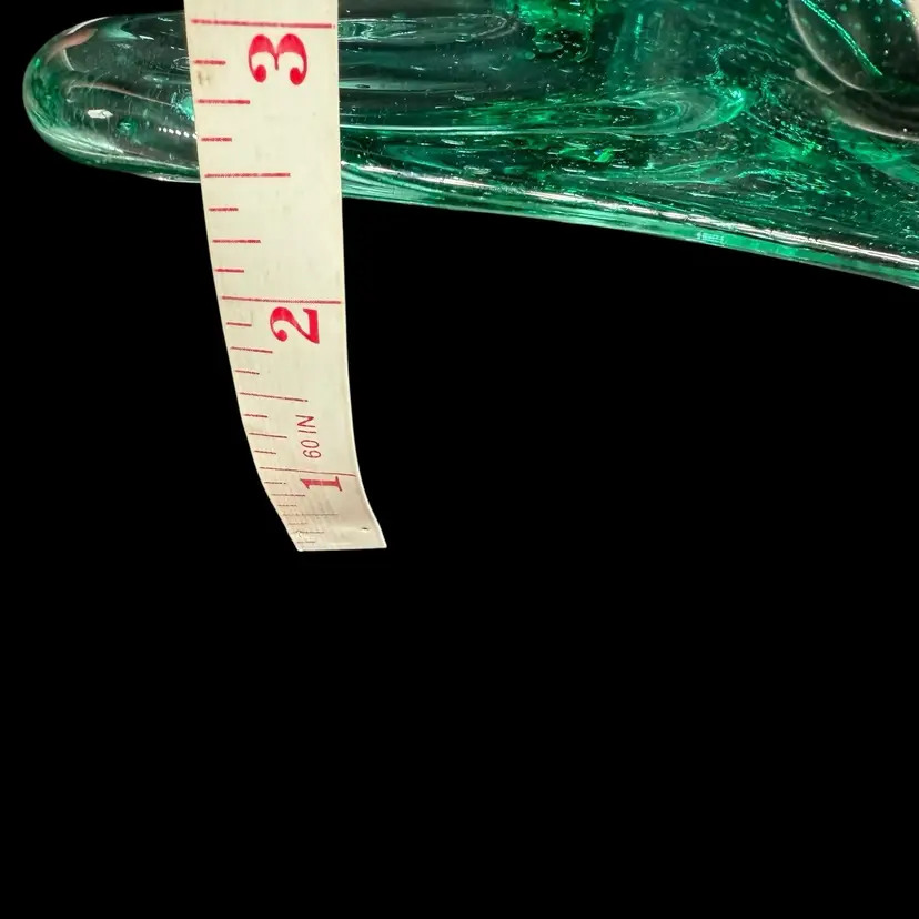 This Vintage Murano Hand Blown Art Glass Free Form Bowl is a unique and beautiful piece of Italian glass art. Handmade in Italy, this green bowl features a solid pattern with controlled bubbles, creating an abstract and artistic shape. Perfect for all occasions, this decorative bowl is one of a kind, showcasing the intricate craftsmanship and artistic flair of Murano glassmaking. This piece is a stunning addition to any home decor or collection.