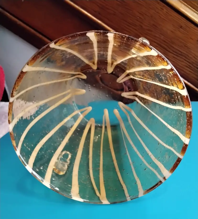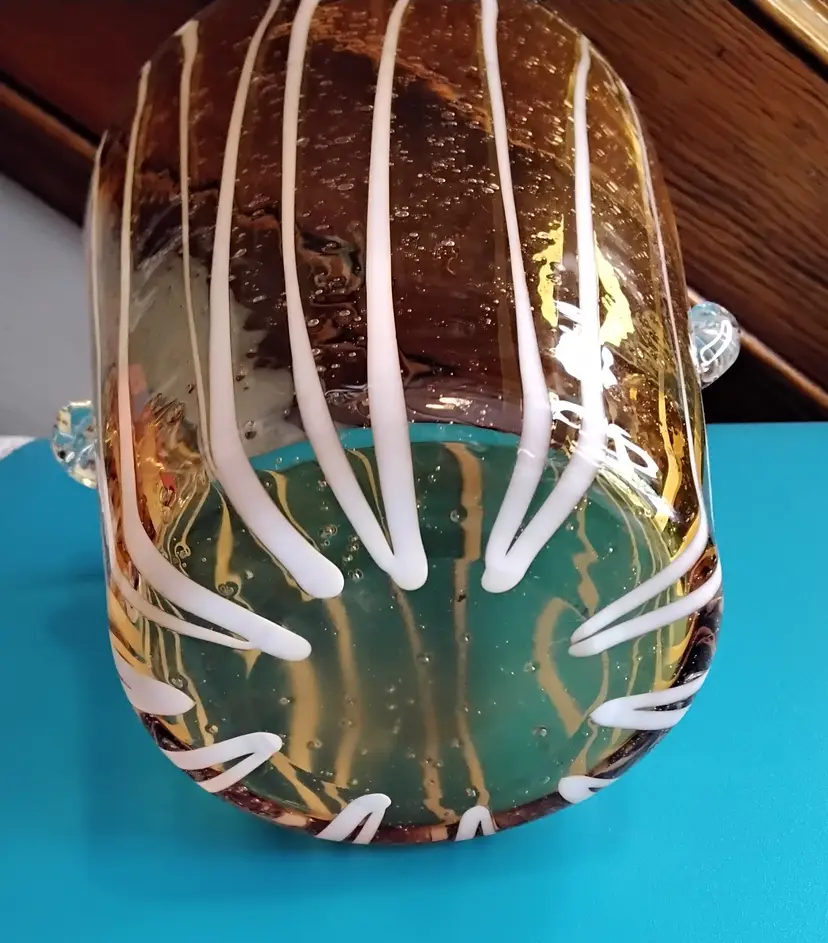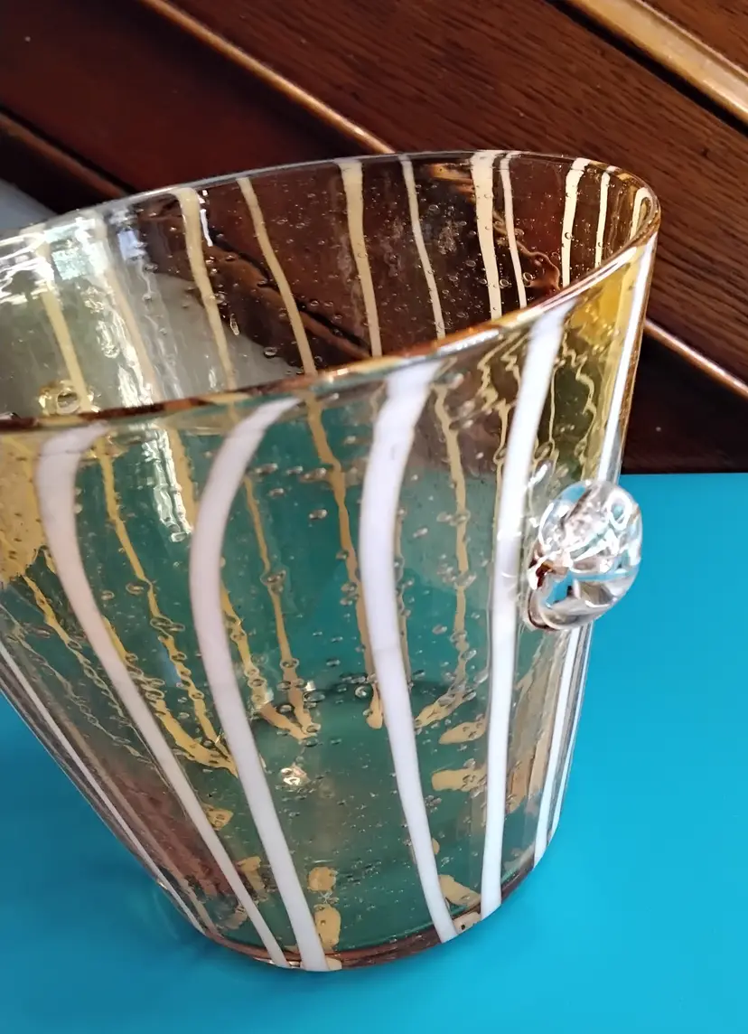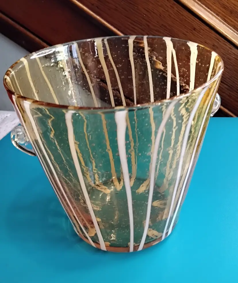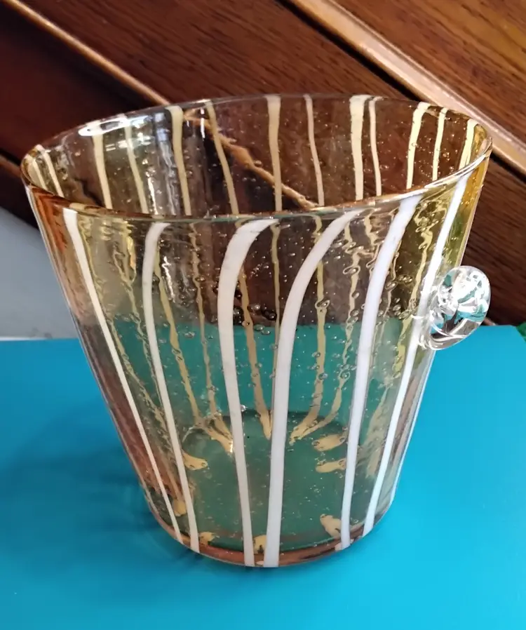 Hand Blown Murano Ice bucket Art Glass. Amber with White Stripes Attached Handles. Bubble and bump design. Base is 3.6 inches x 3.6 inches. Opening at top is 5.4 inches x 5.4 inches and is 5.4 inches tall. Made in Italy. Bucket is in very good condition with no chips or cracks. Photos are part of the description.