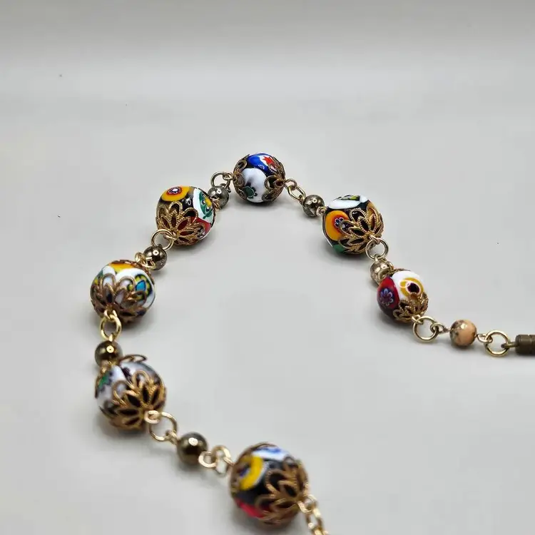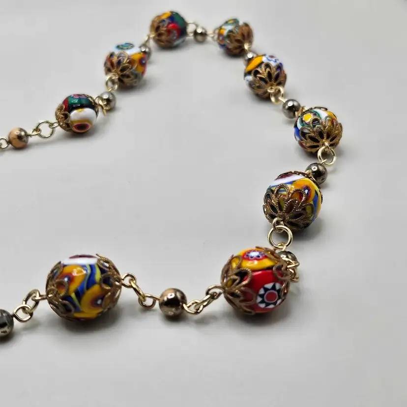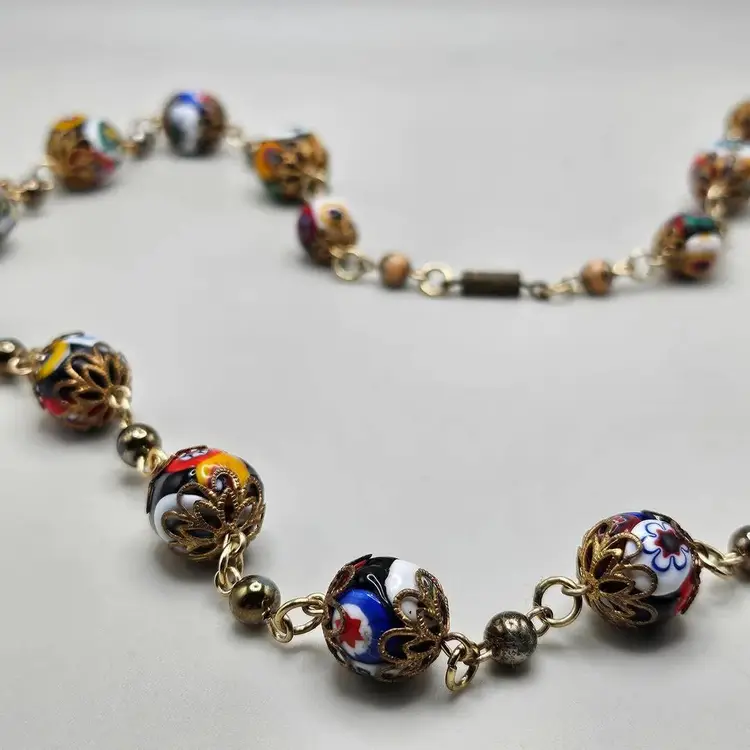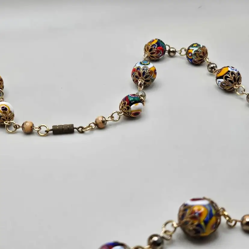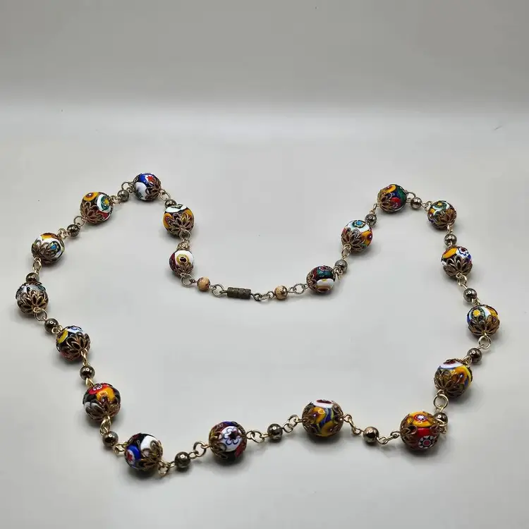 30" Long Vintage Murano Millefiori Murrine Cut Cane & Metal Large Small Beads Barrel Clasp Gold Tone. Item is in used, vintage condition showing minor signs of use. Has barrel clasp. As shown in live auction/as is.