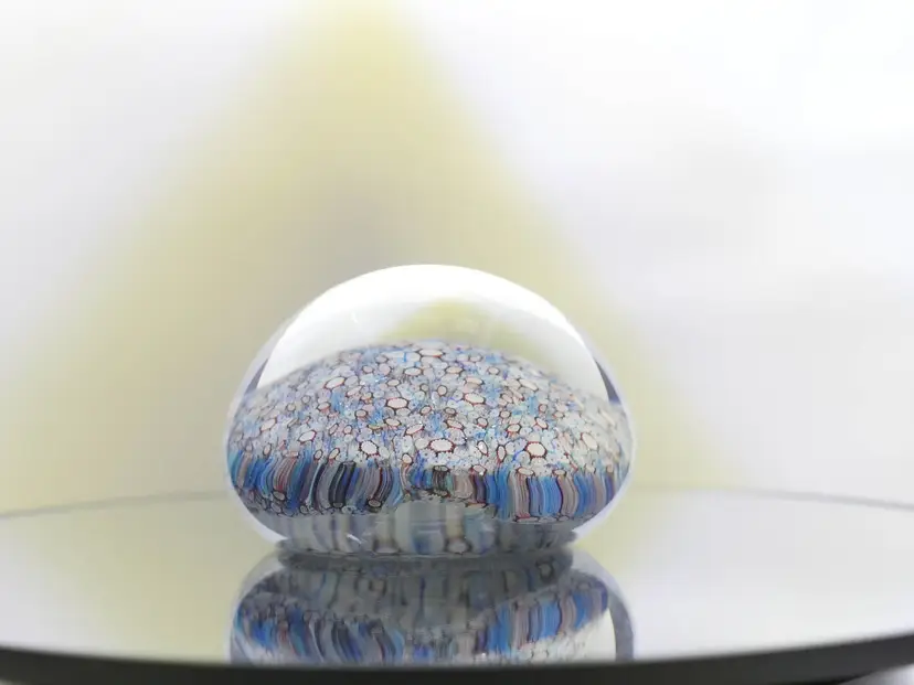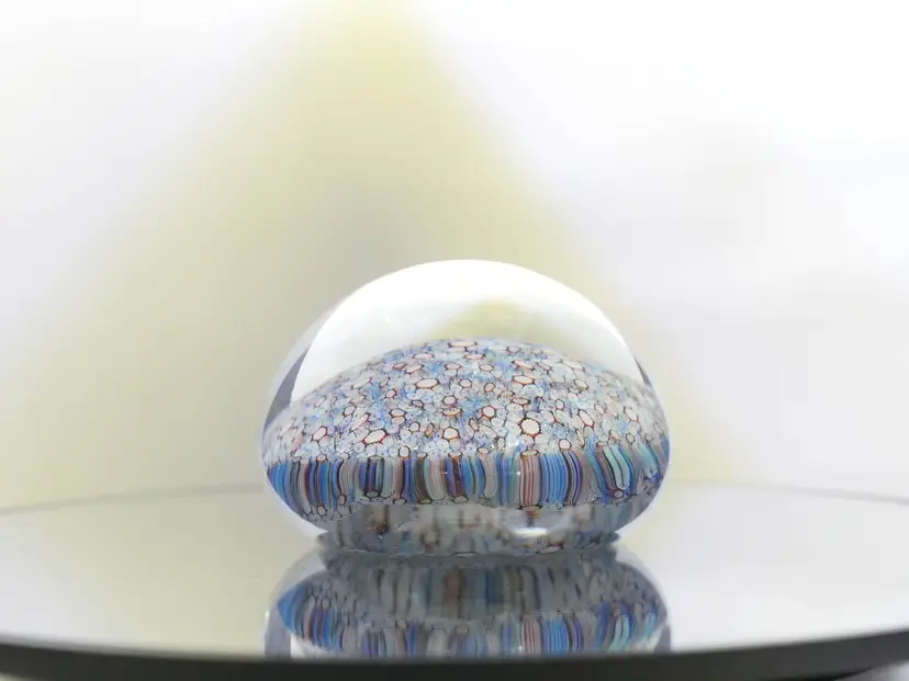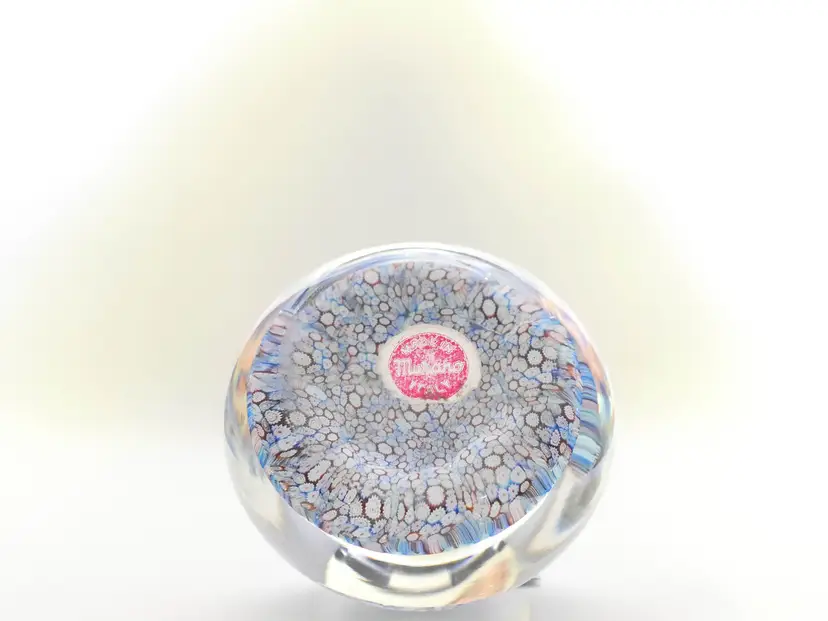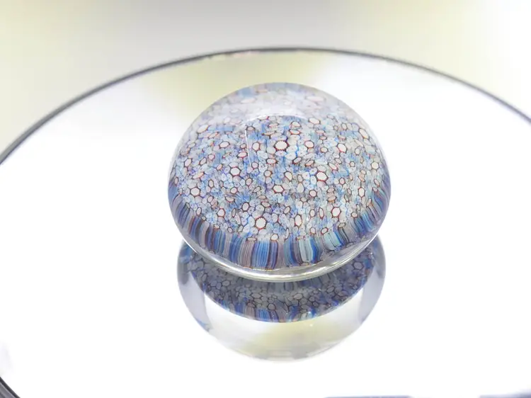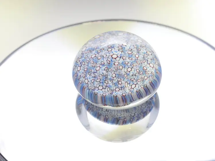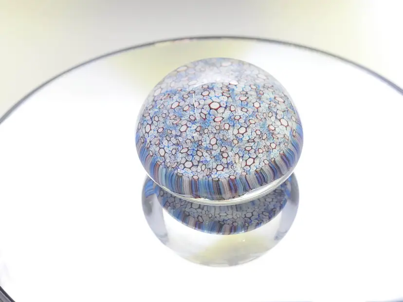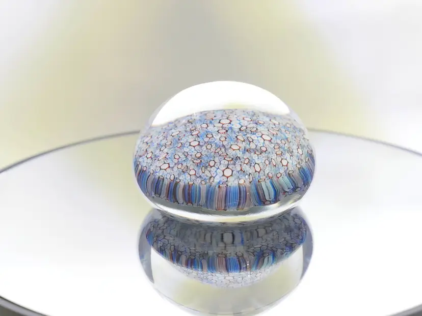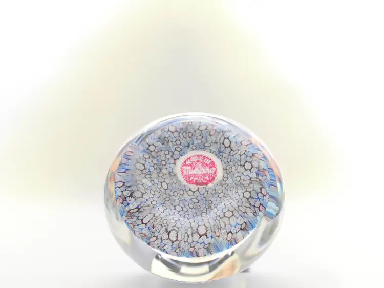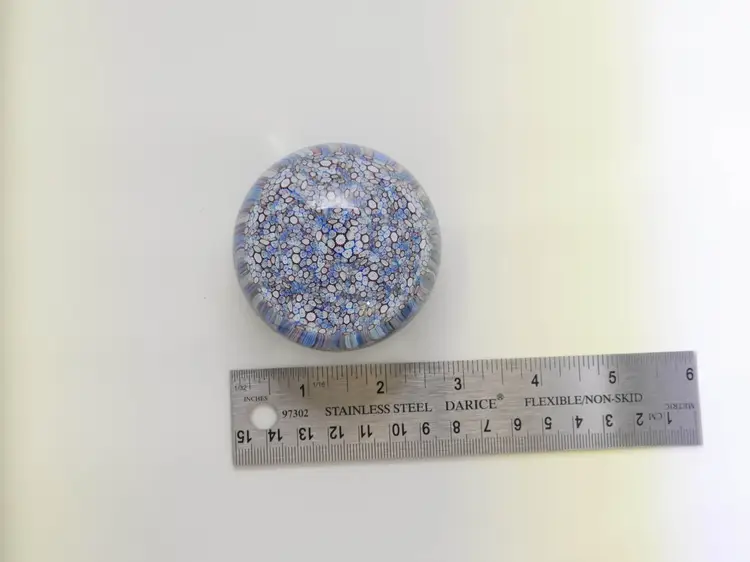 A 2.5" paperweight with an interior filled with a very dense, colorful intricate millefiori pattern. Its rounded dome shape magnifies the mosaic-like floral designs within. The sticker will be removed from the bottom before shipping as this is not a Murano piece. It is a beautiful art glass paperweight and is in excellent condition. Price reduction reflects research that label was found to be fake.