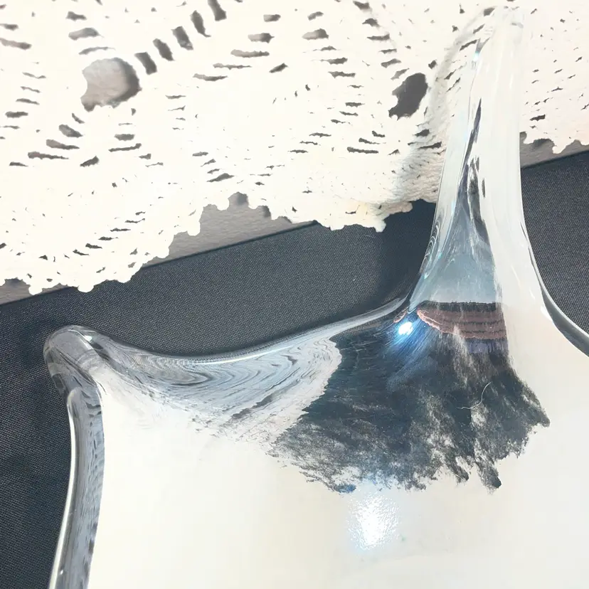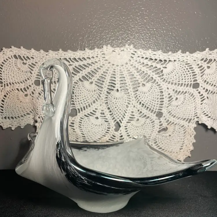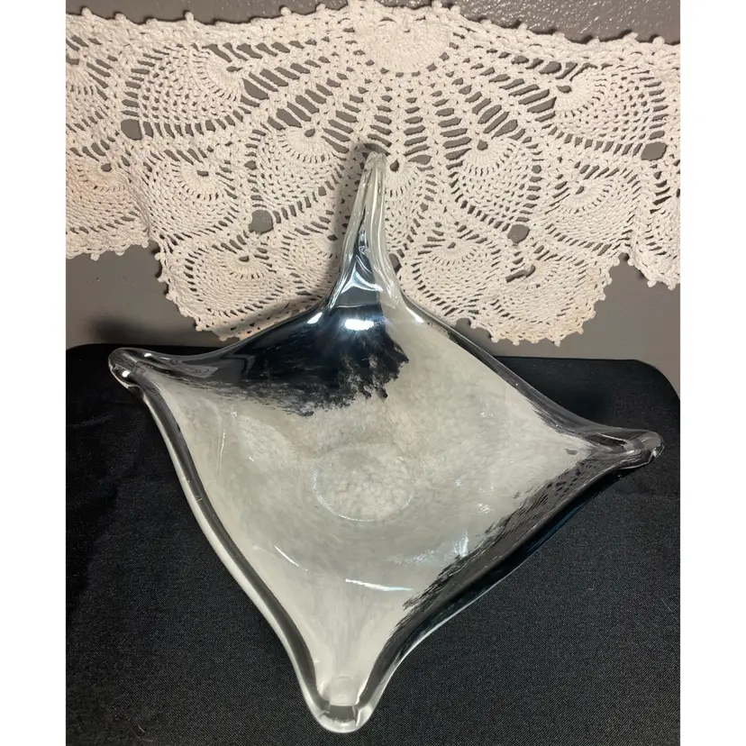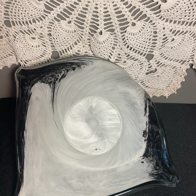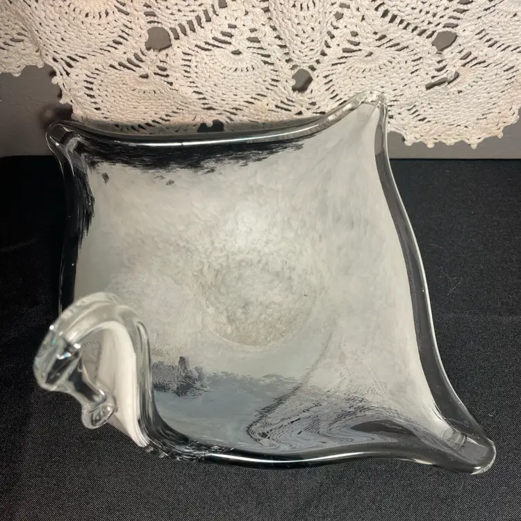 Crafted in thick clear glass with a milky white interior swirl, this piece catches light beautifully and makes a striking centerpiece or display piece.