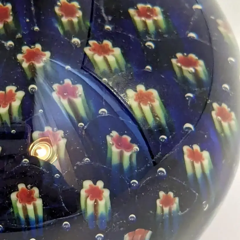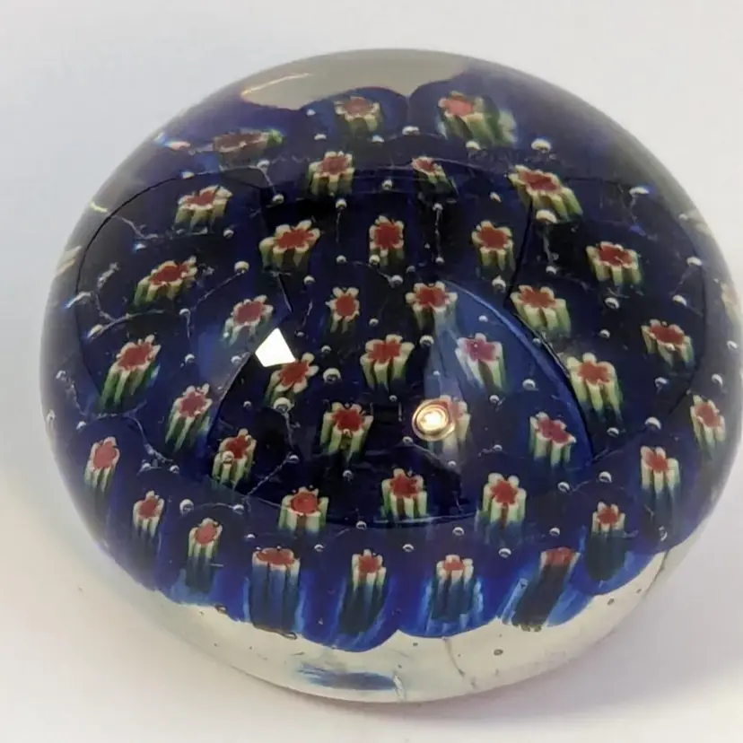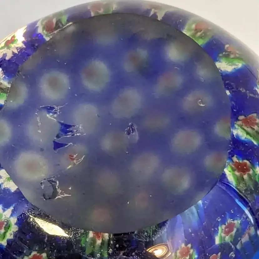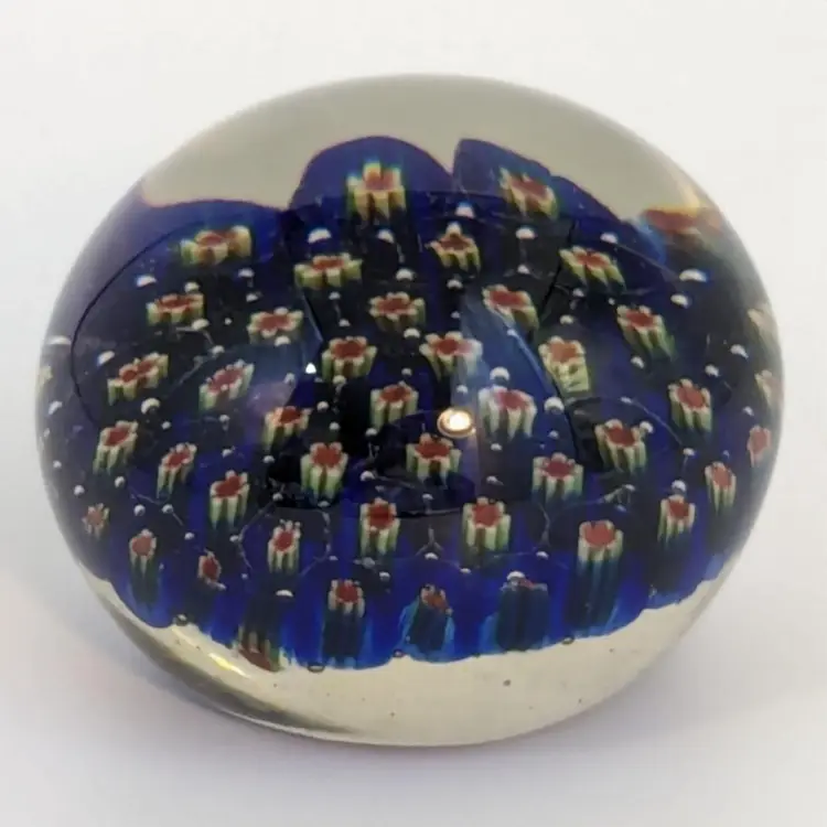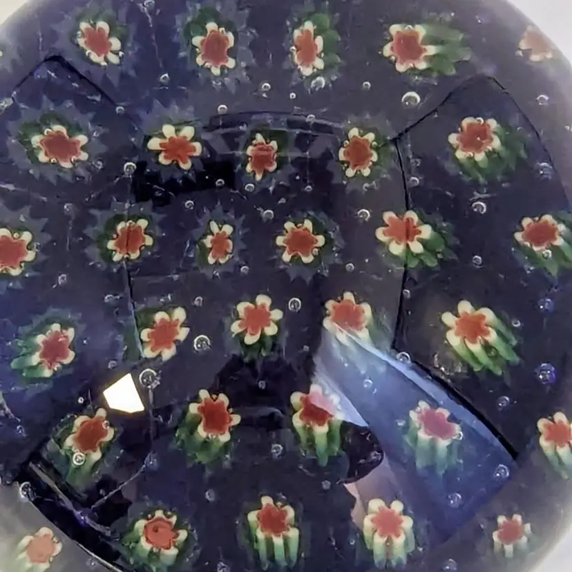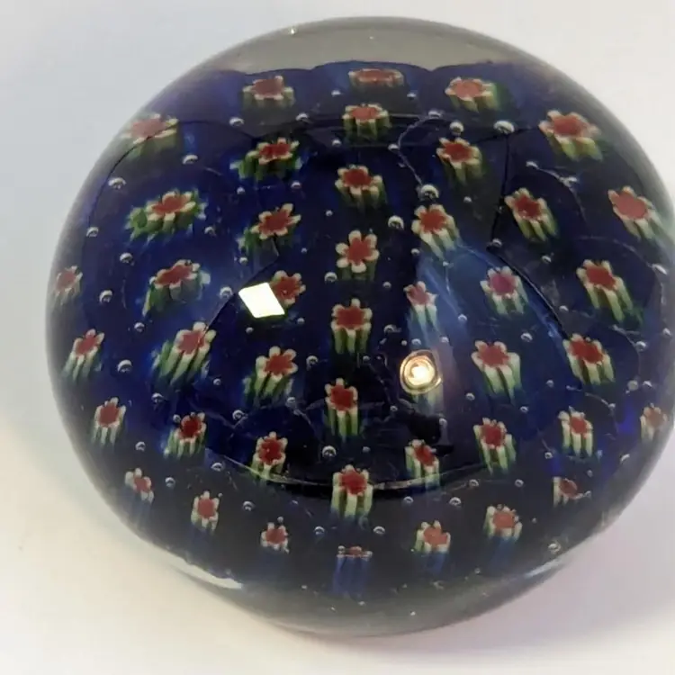 Beautiful blue paperweight with red, white and green flowers. Good condition. Measures 3" in diameter.